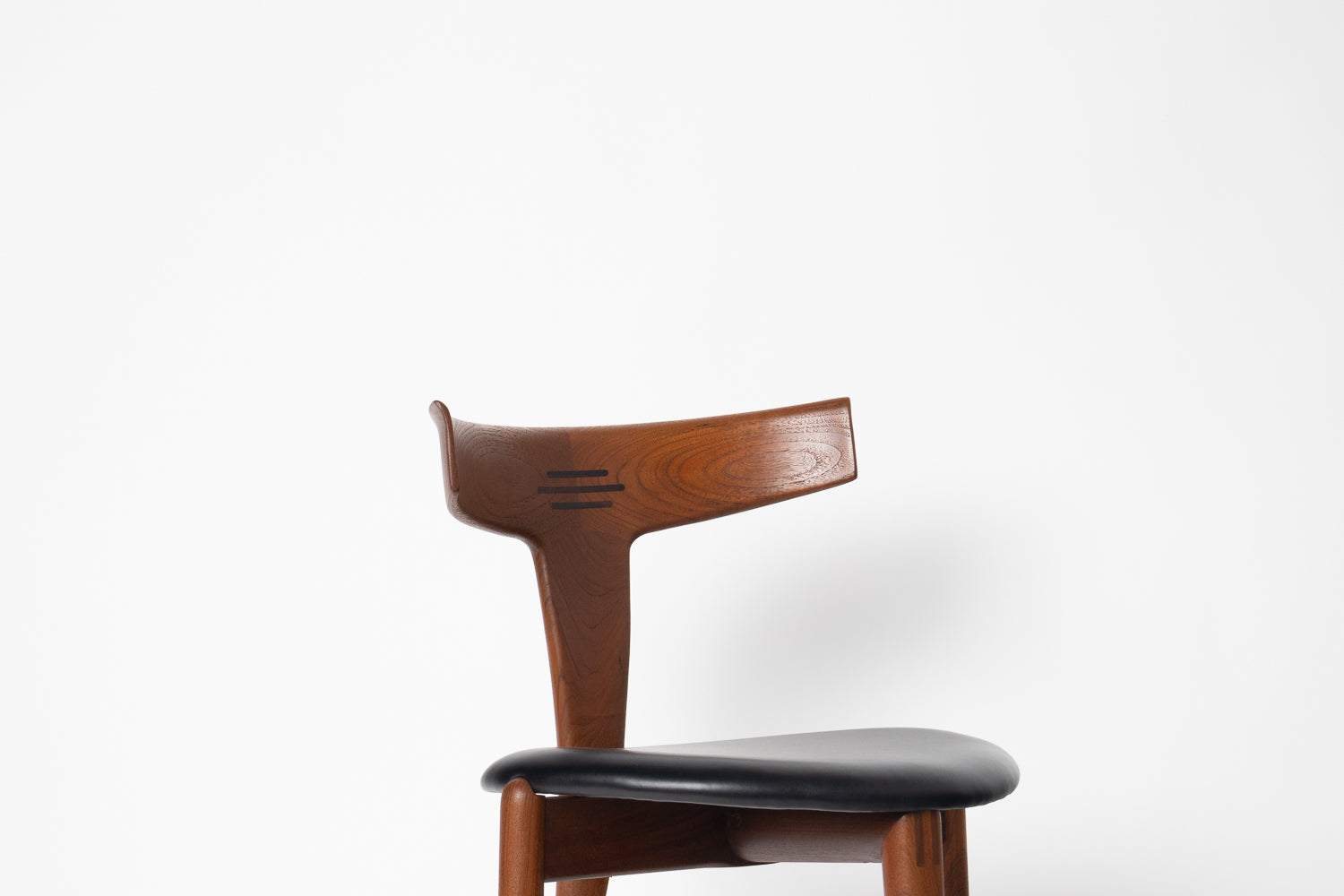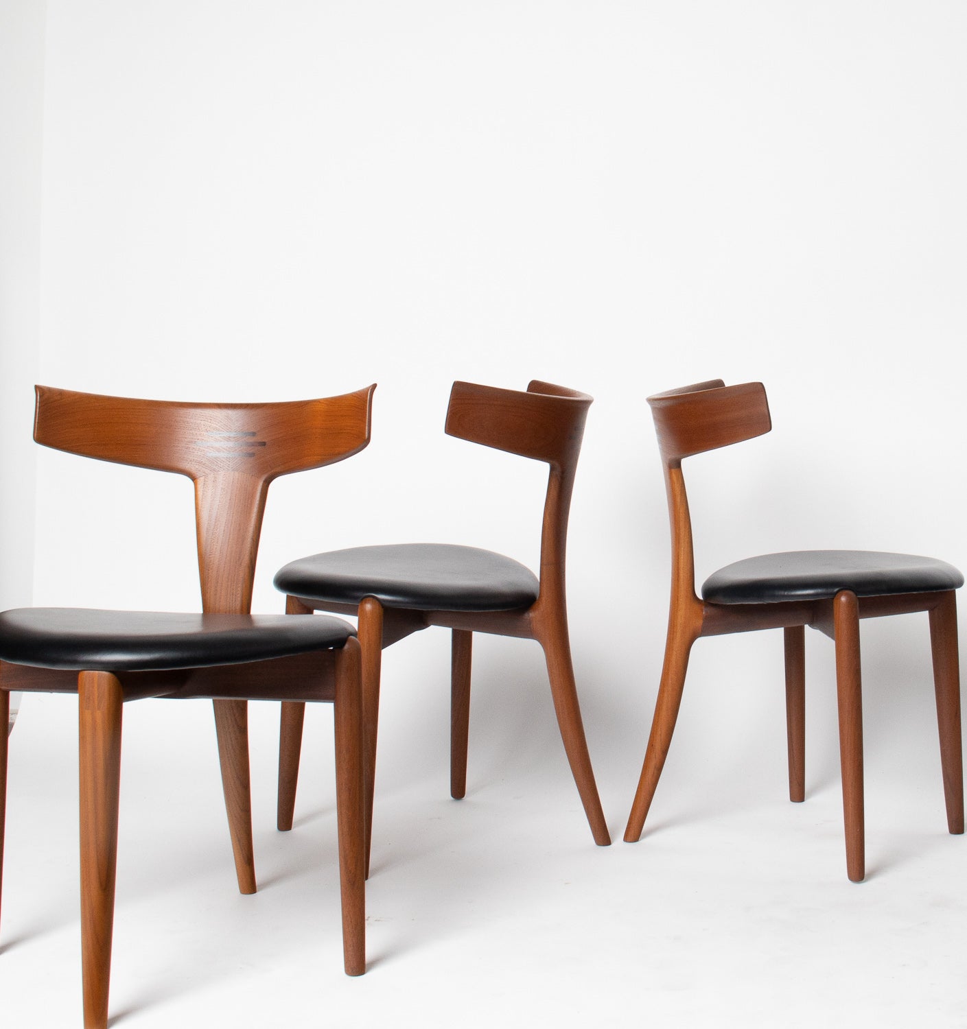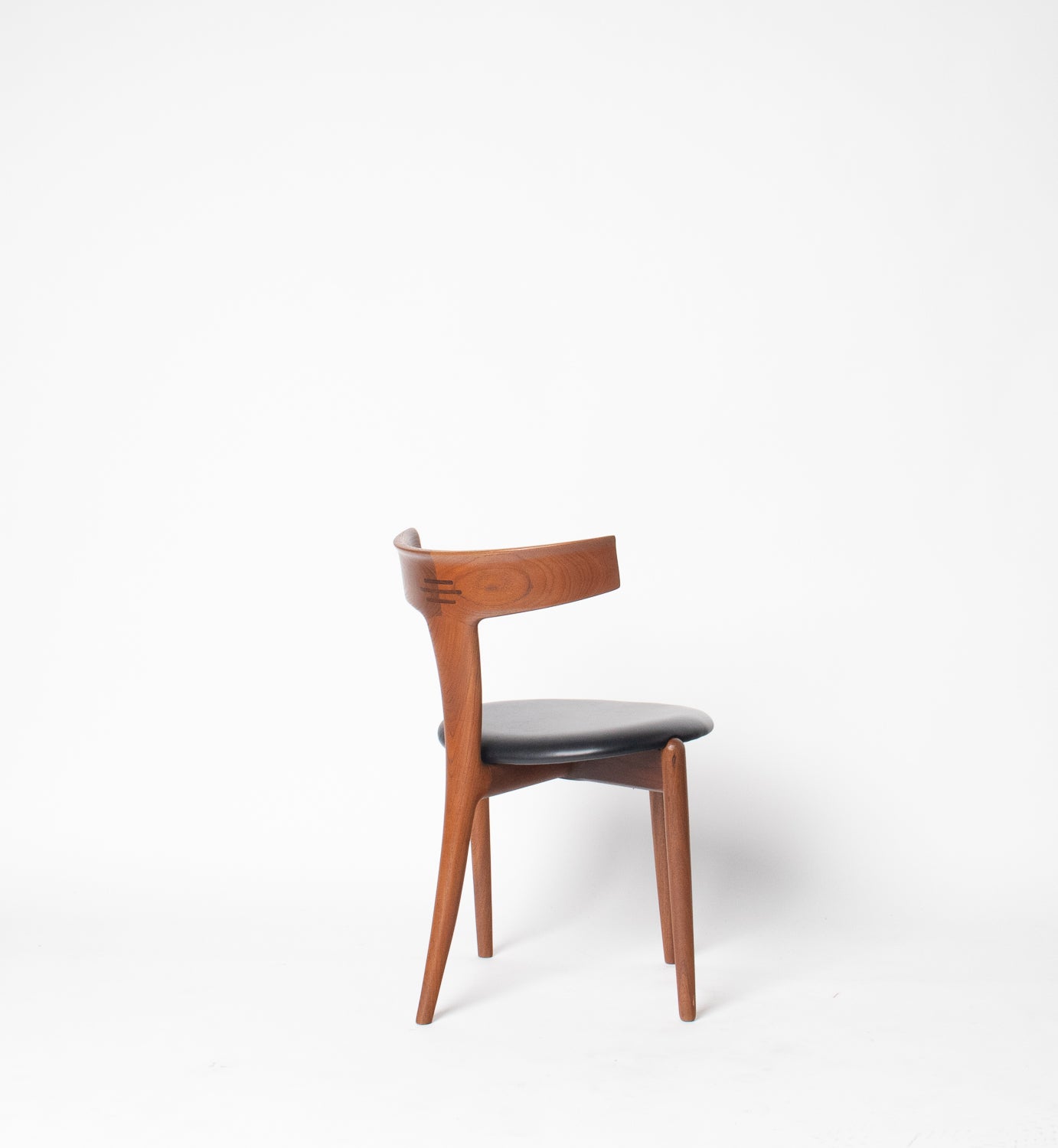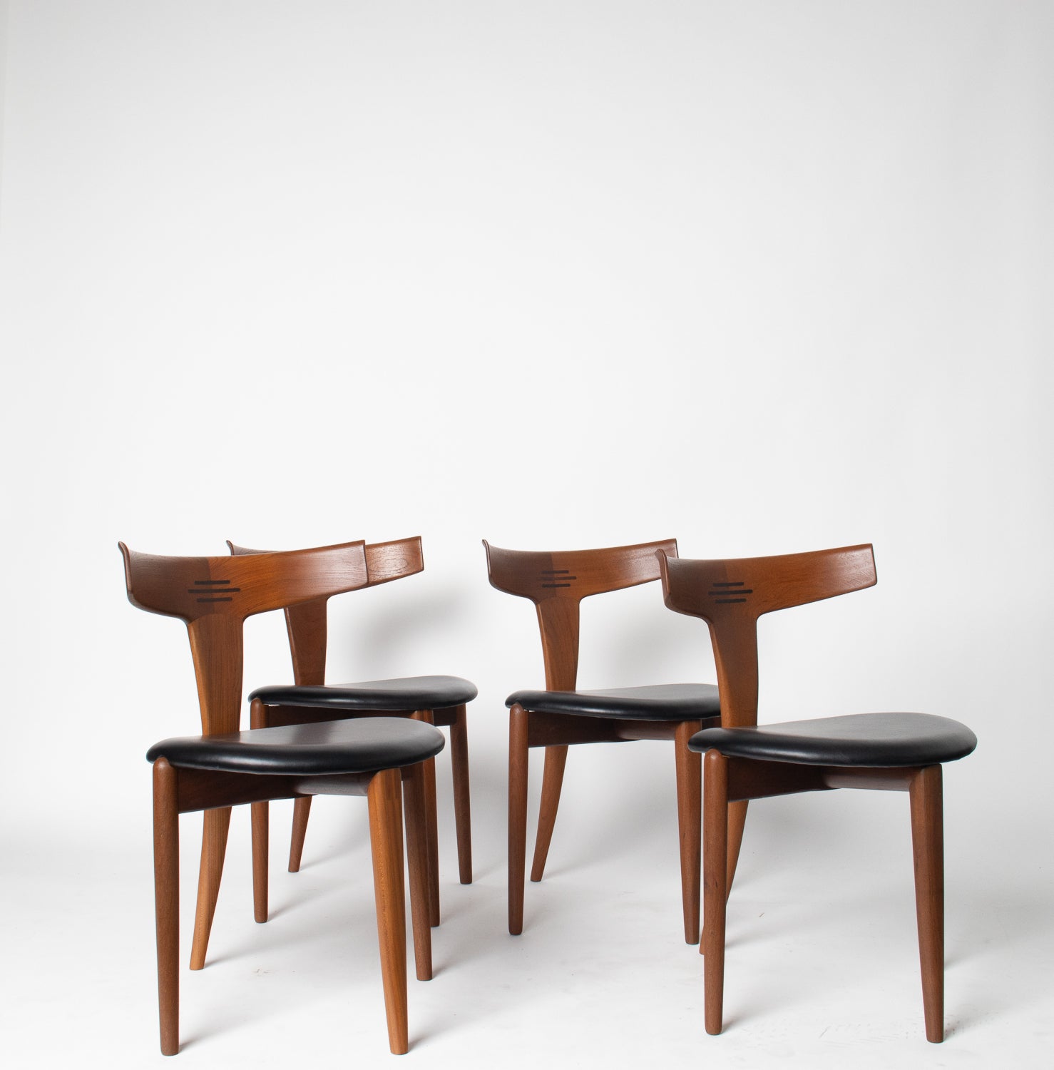 A beautifully sculpted set of Danish dining chairs by Palle Petersen & Erik Andersen, showcasing the refined craftsmanship and organic elegance of mid-century Scandinavian design. Made from old-growth teak with a soft, glowing grain, each chair features an exquisitely curved backrest with subtle integrated rosewood inlaysโan understated detail that speaks to the makerโs hand and the eraโs devotion to thoughtful joinery.