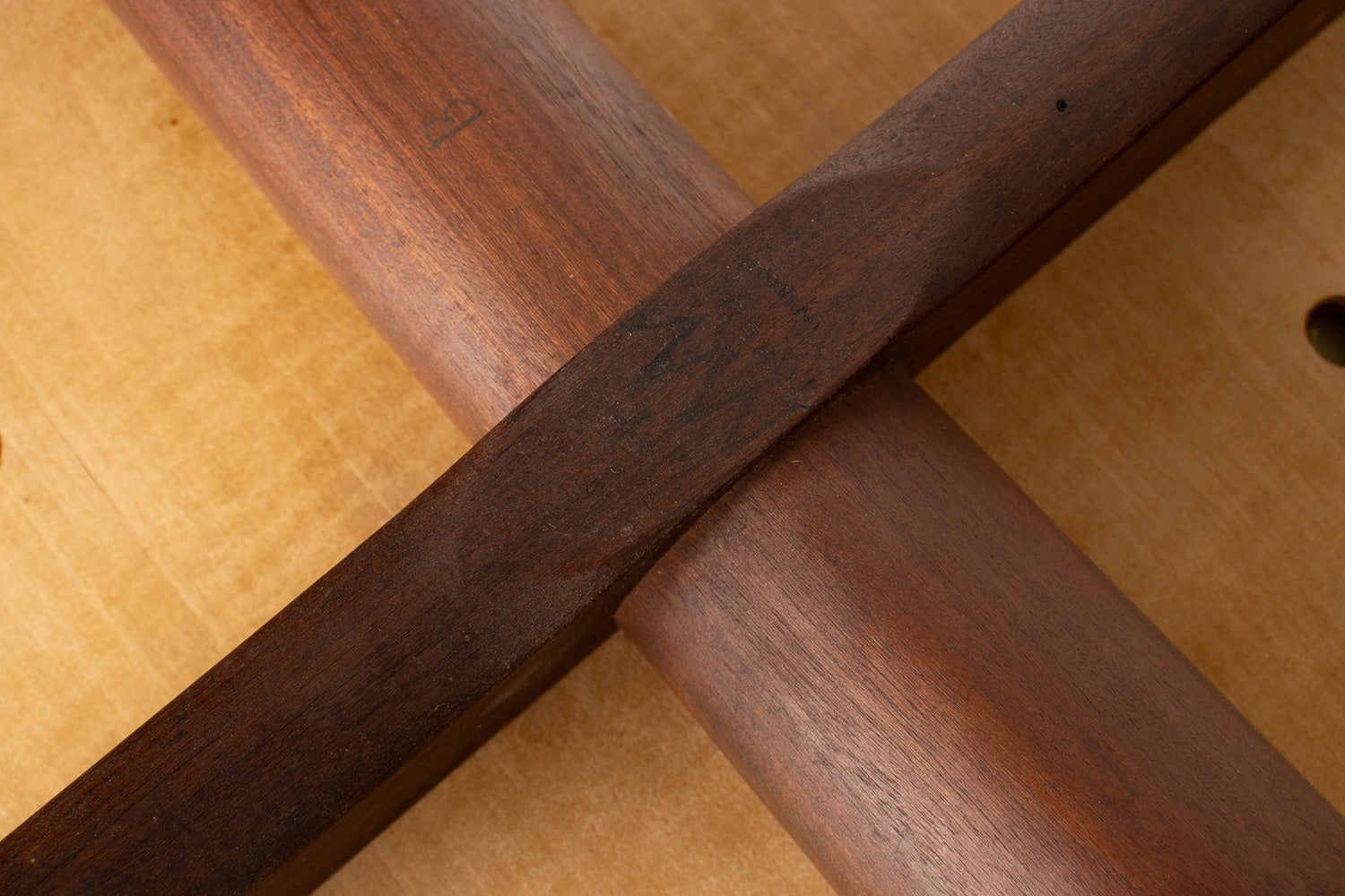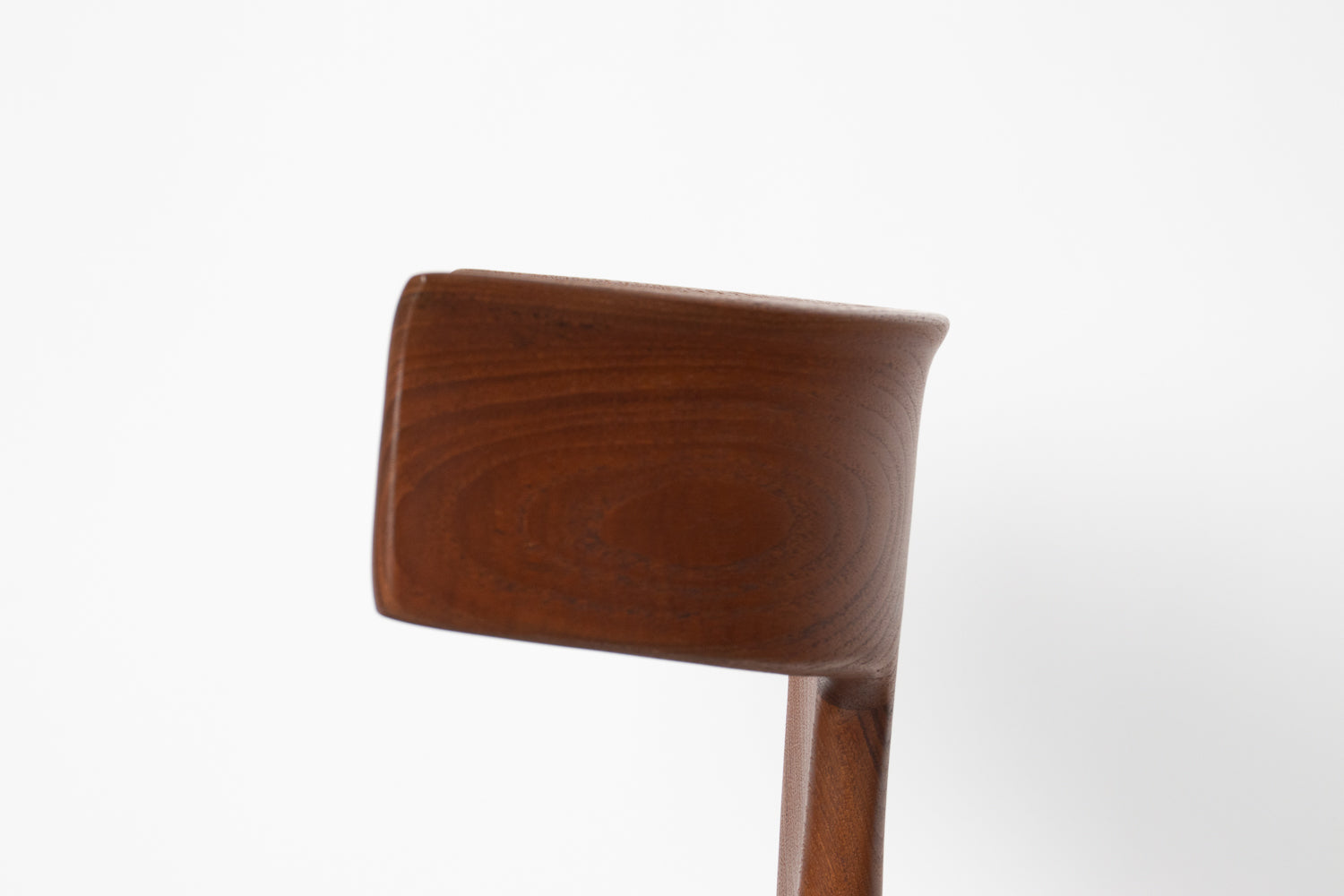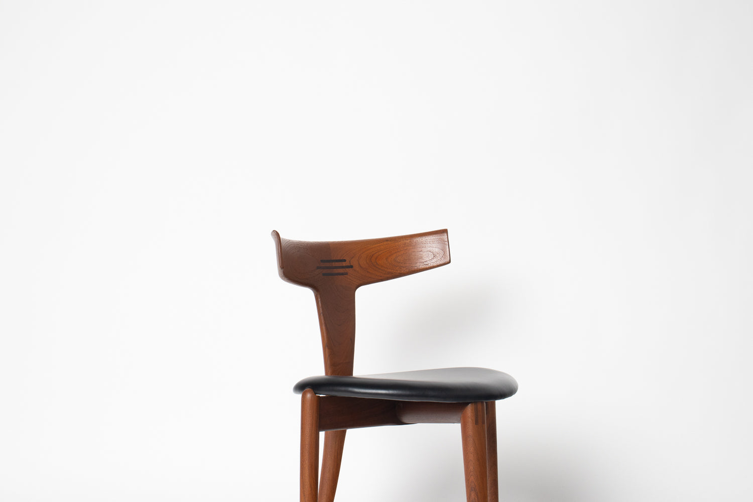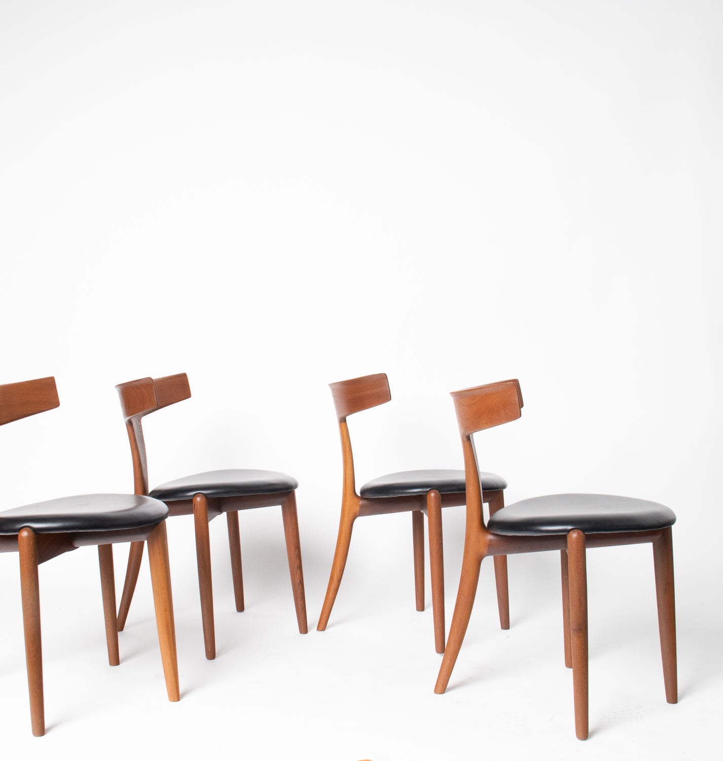 A beautifully sculpted set of Danish dining chairs by Palle Petersen & Erik Andersen, showcasing the refined craftsmanship and organic elegance of mid-century Scandinavian design. Made from old-growth teak with a soft, glowing grain, each chair features an exquisitely curved backrest with subtle integrated rosewood inlaysโan understated detail that speaks to the makerโs hand and the eraโs devotion to thoughtful joinery.