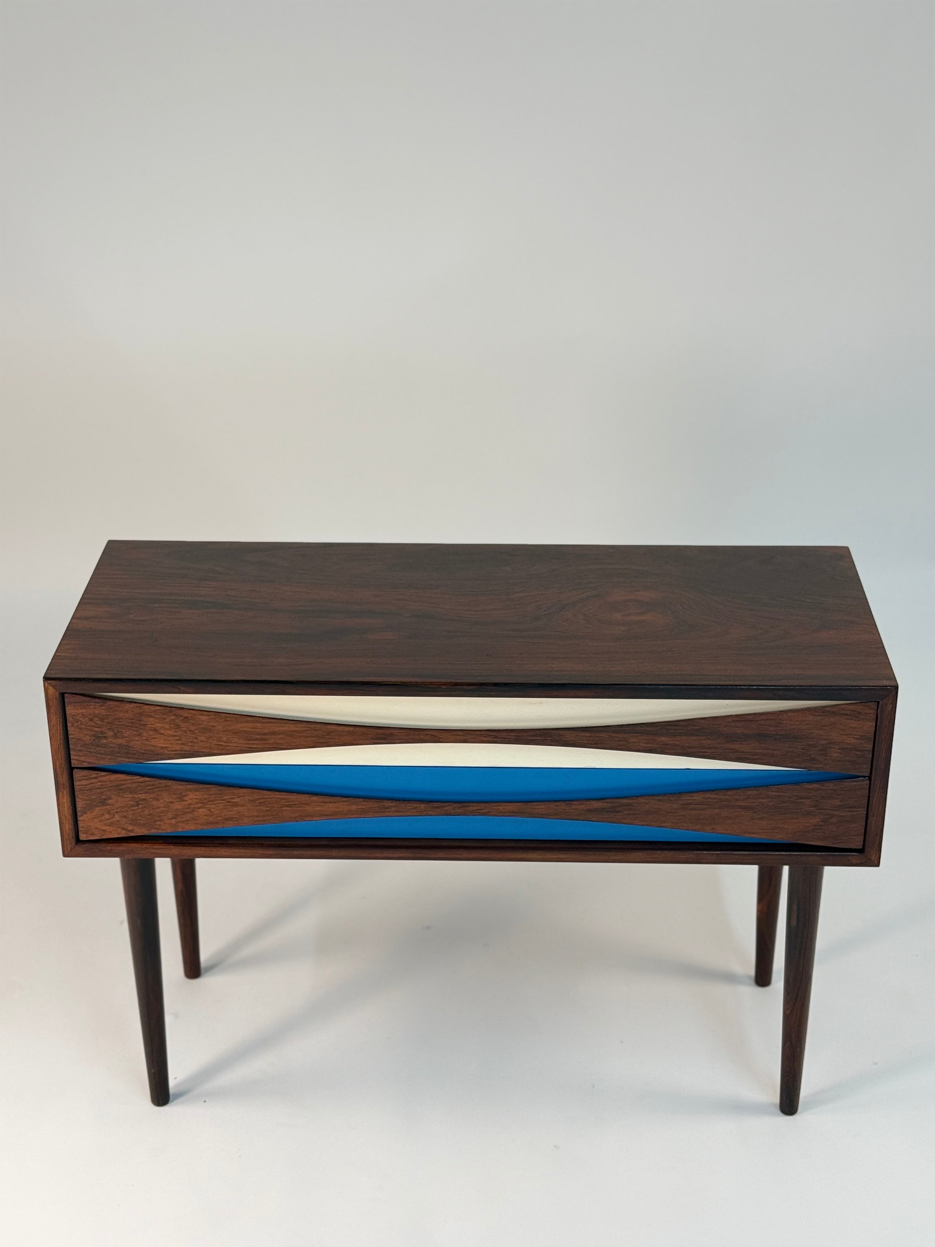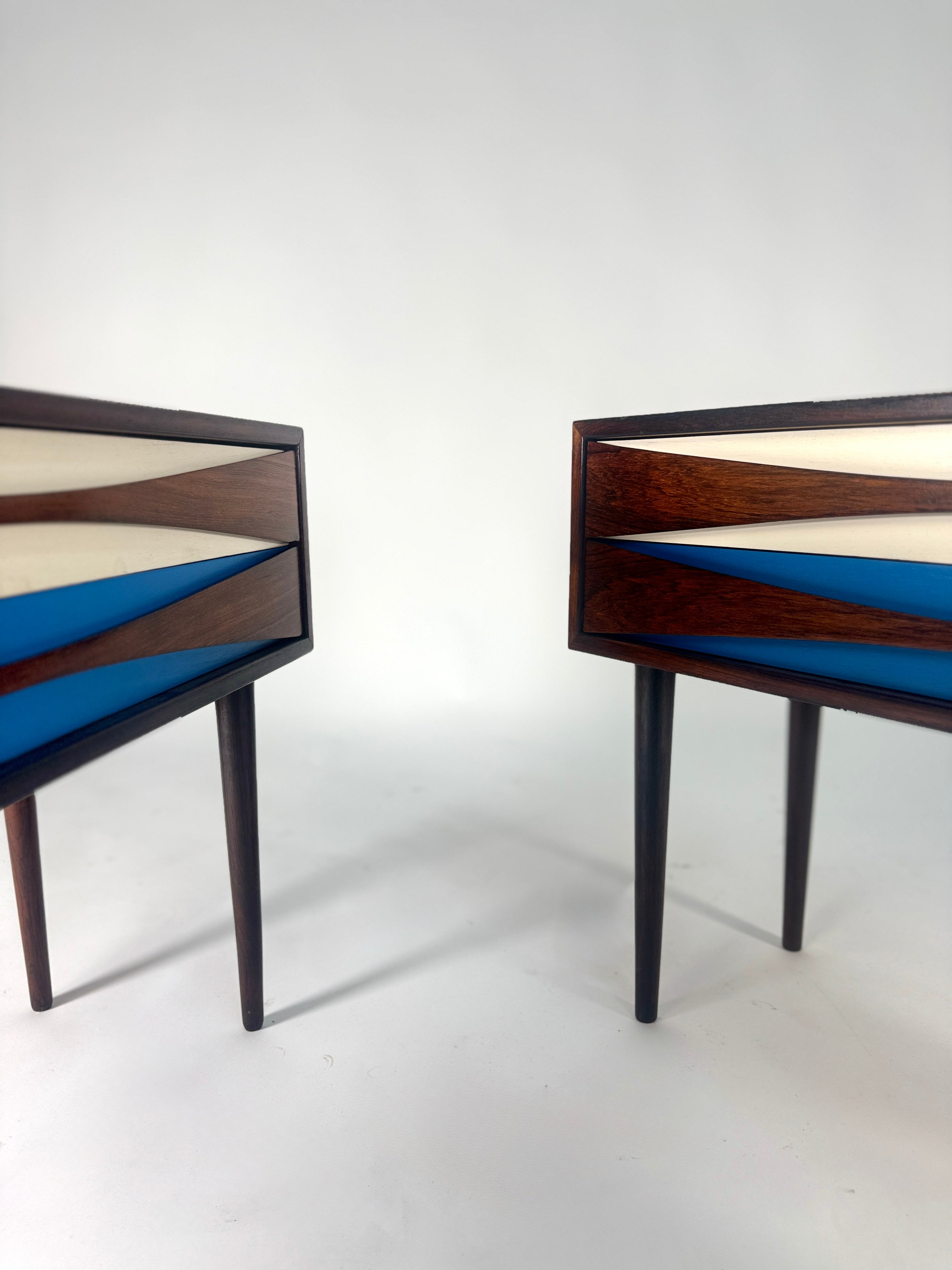A striking, highly collectible pair of Danish Modern nightstands by Niels Clausen (Denmark, circa 1960s), crafted in richly figured rosewood with graphic drawer fronts in blue and white. The crisp color fields were intentionally used by mid-century Danish makers to brighten interiors through long, dark winters, lending these compact pieces a joyful sophistication that still feels fresh today. Very rare in rosewoodโmost surviving examples were produced in teakโone cabinet is factory marked (see photos) and both sit on elegant, tapered legs.