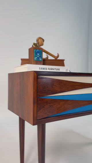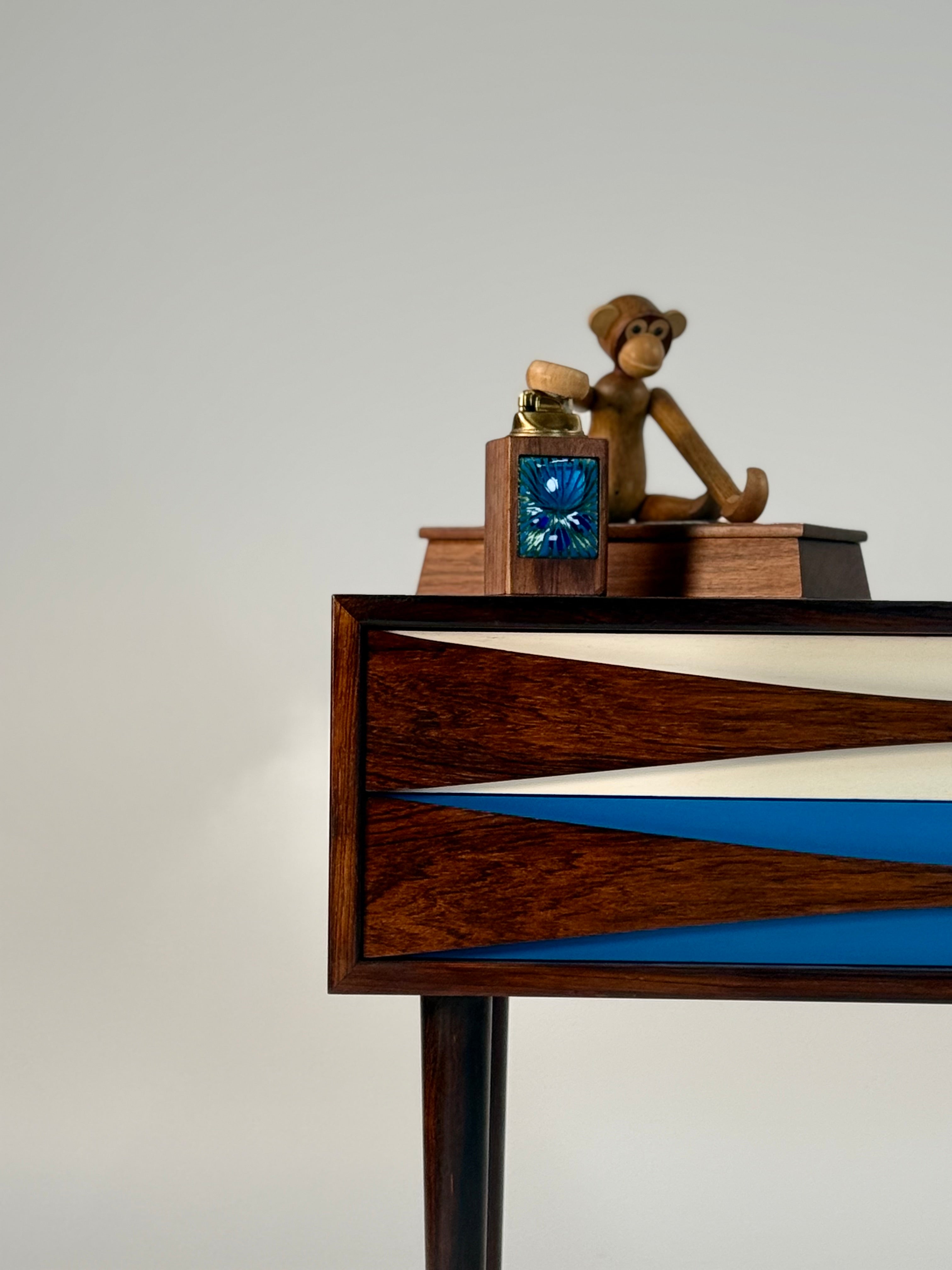 Perfect as bedside tables.ย The saturated blue reads as an accent while the white and rosewood keep the look refinedโpair easily with walnut, teak, or neutral upholstery.