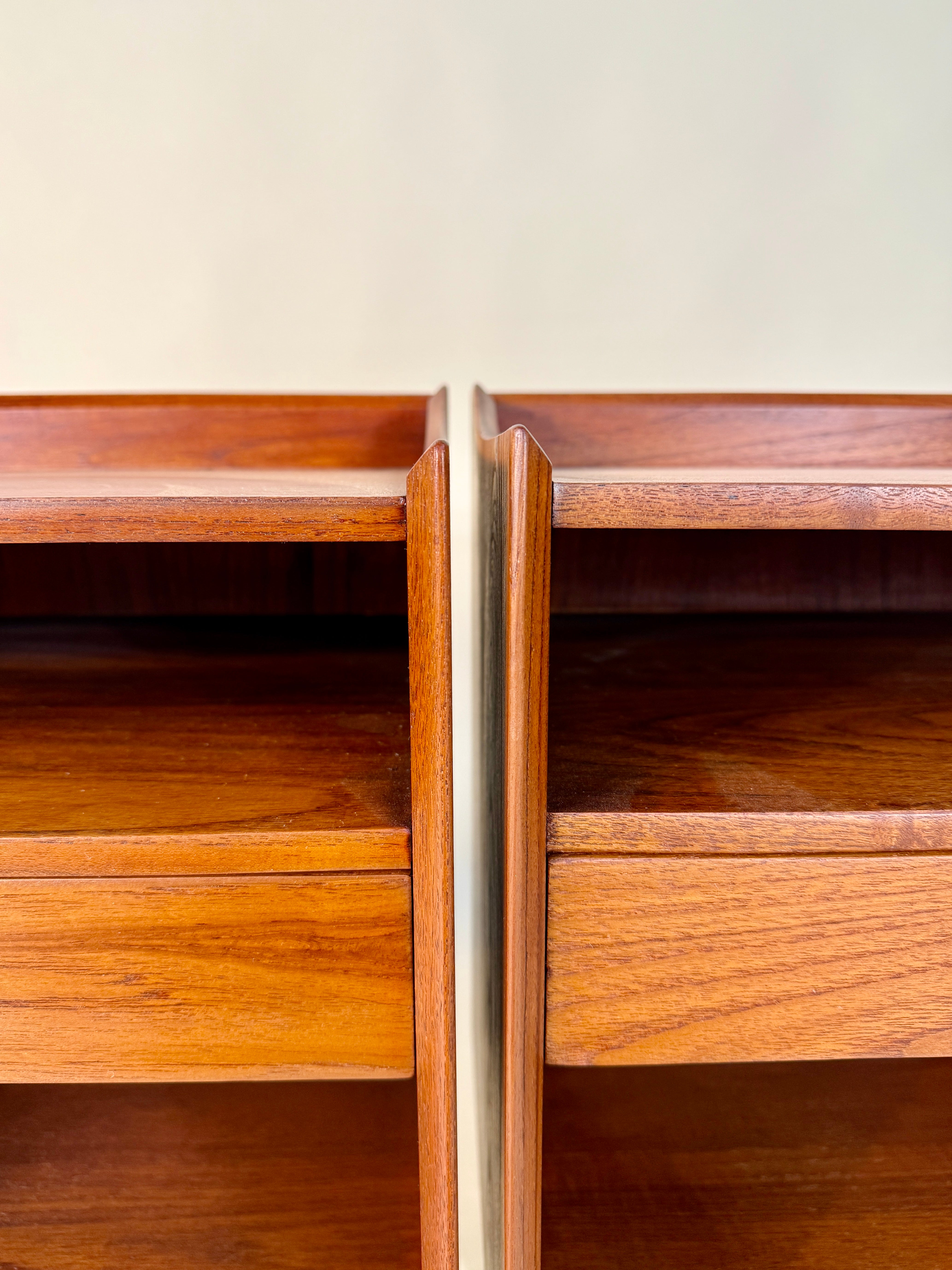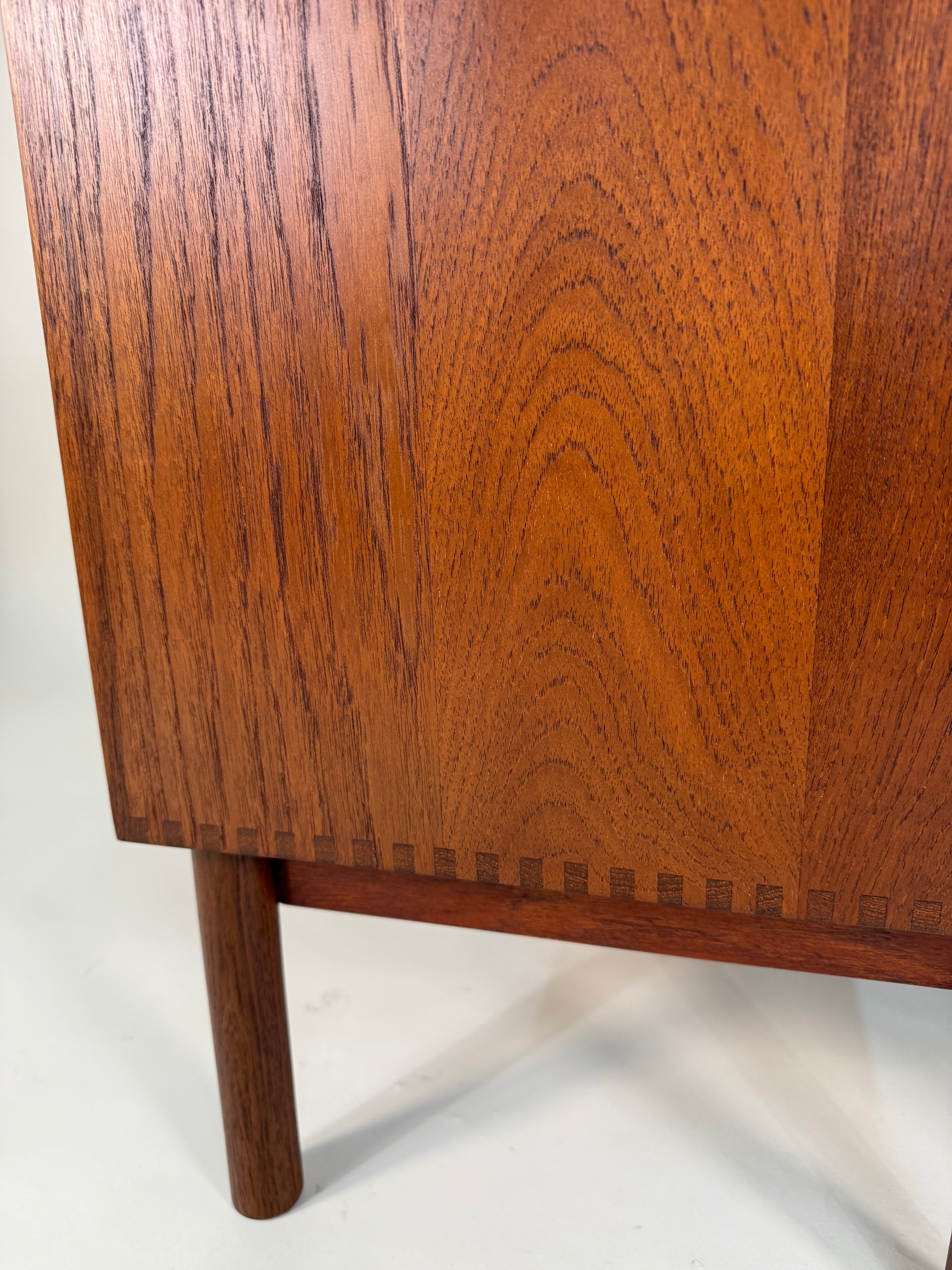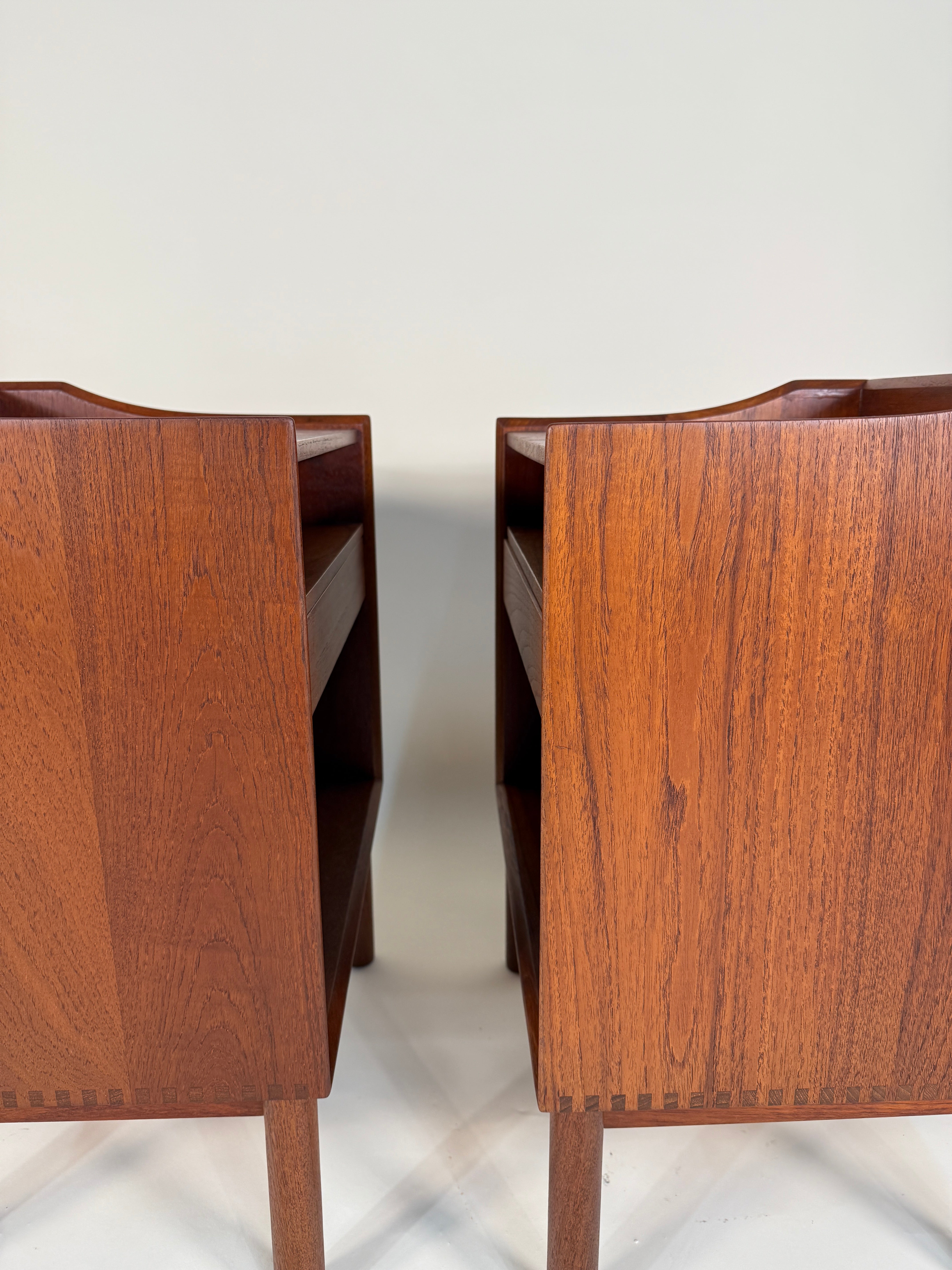 Crafted from rich, warm solid teak, each piece features clean lines, subtle curves, and exposed finger joinery that exemplifies the sophistication of Danish modernism. The compact proportions and timeless form make them ideal as nightstands.