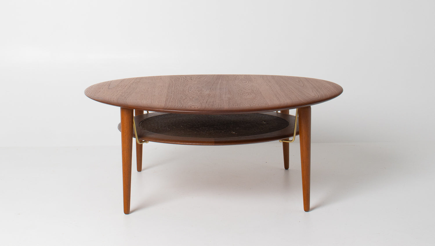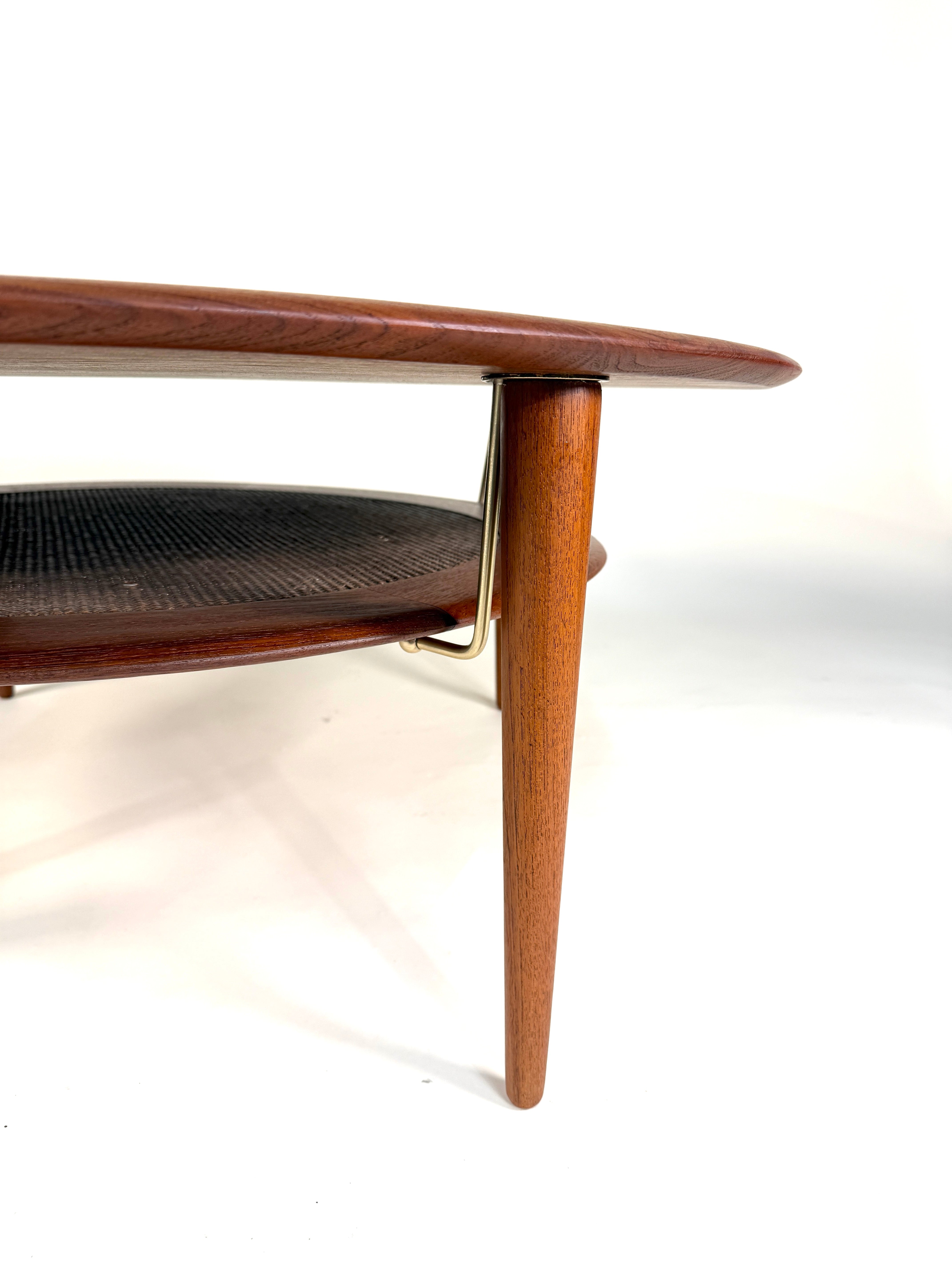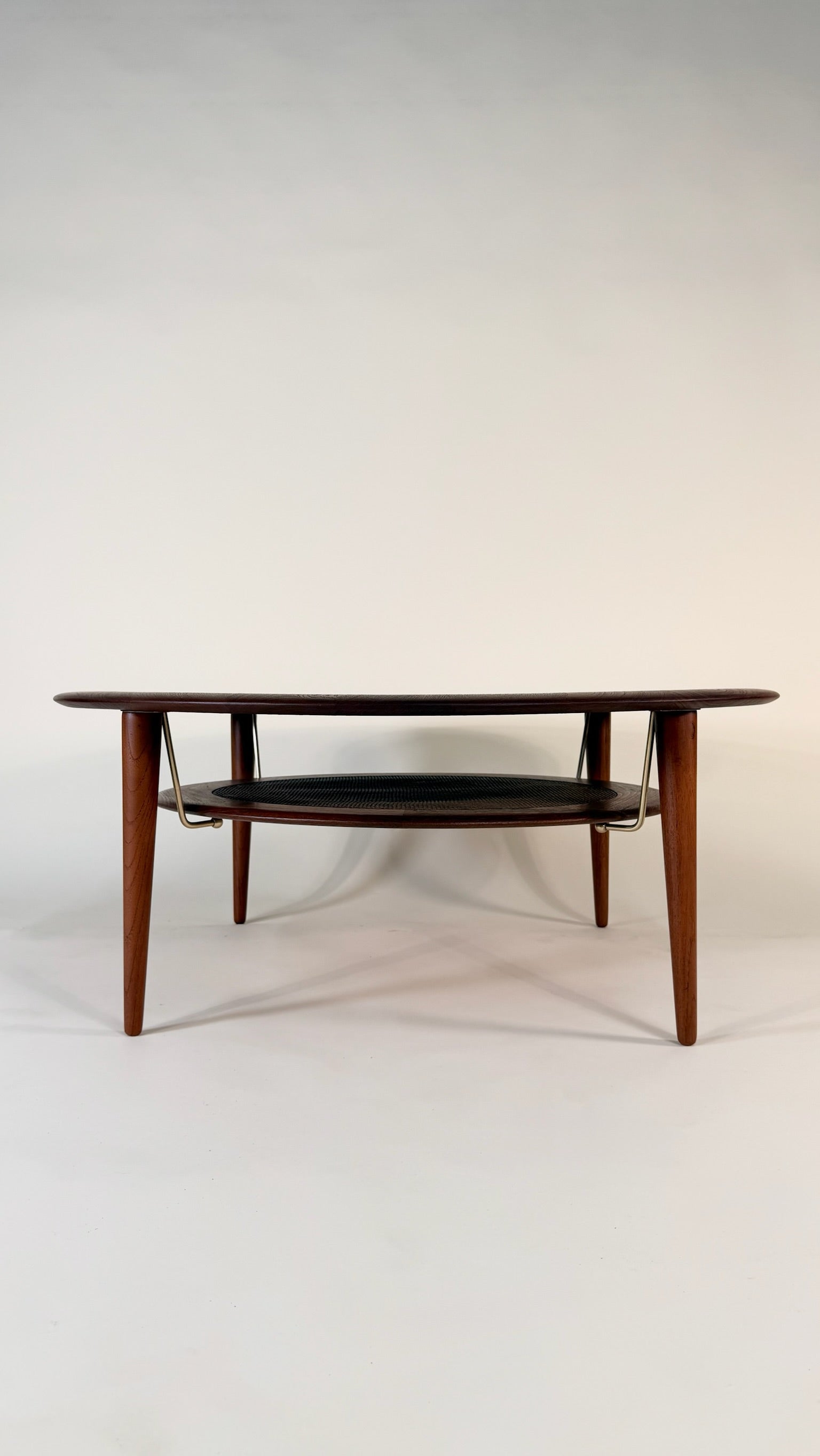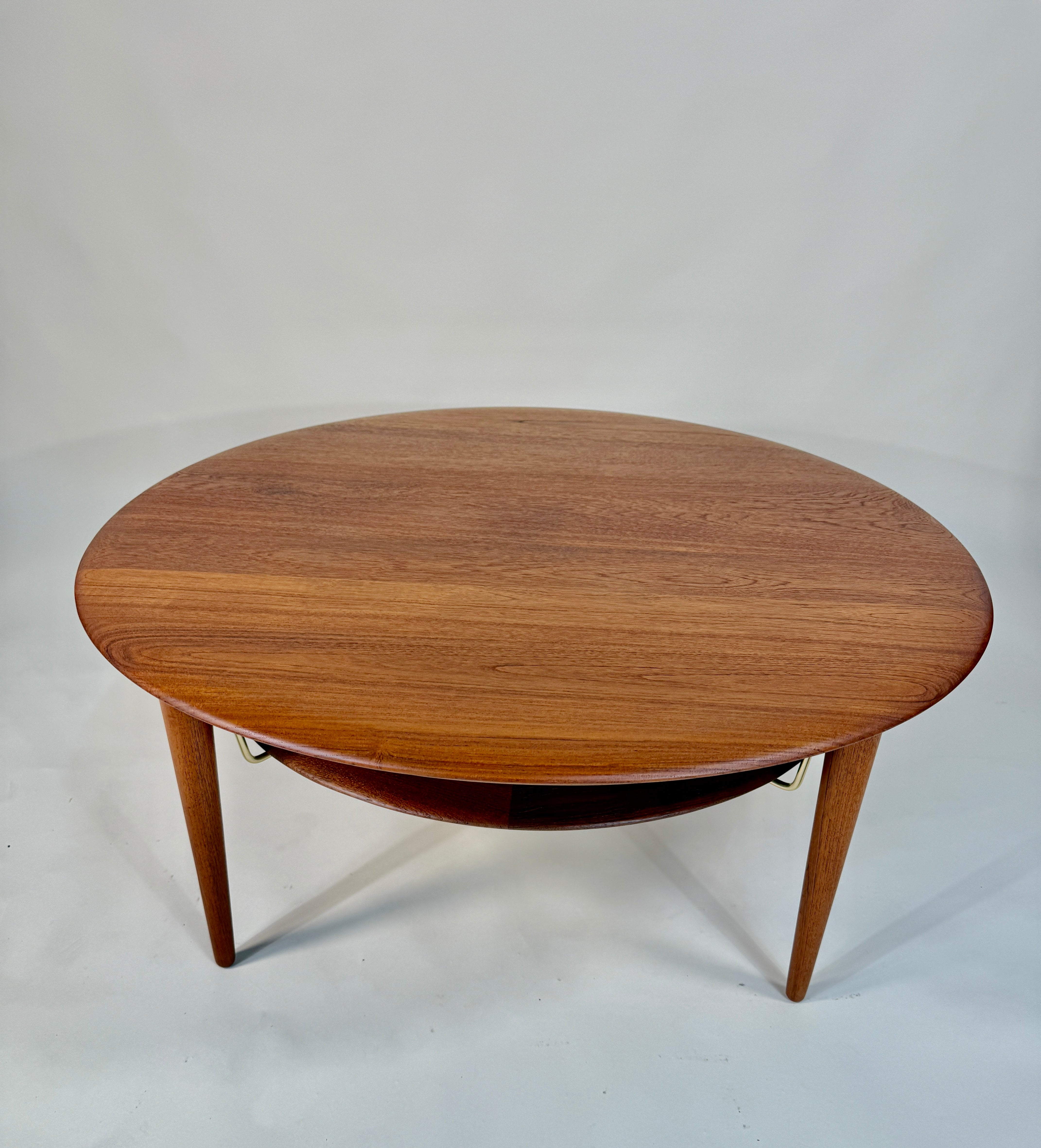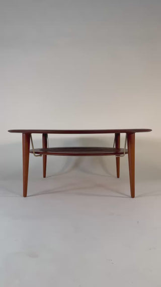 Elevate your living space with this exceptional Mid-Century Modern round coffee table by Peter Hvidt and Orla Mølgaard-Nielsen, crafted in Denmark during the 1950s. A celebrated design duo, Hvidt & Mølgaard were known for their refined forms and architectural approach to furniture, and this piece exemplifies their timeless aesthetic.