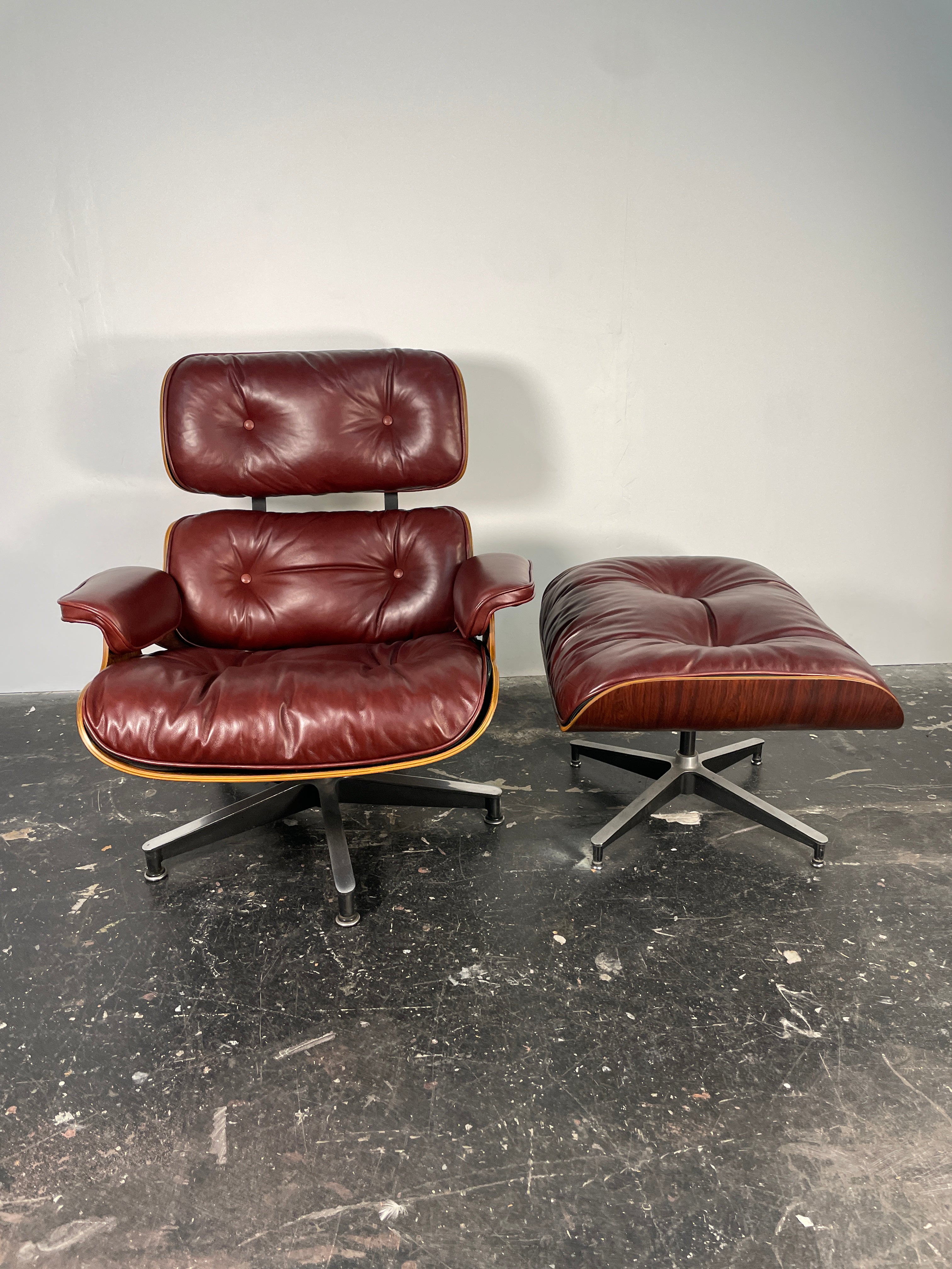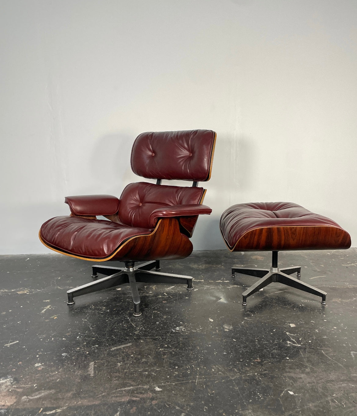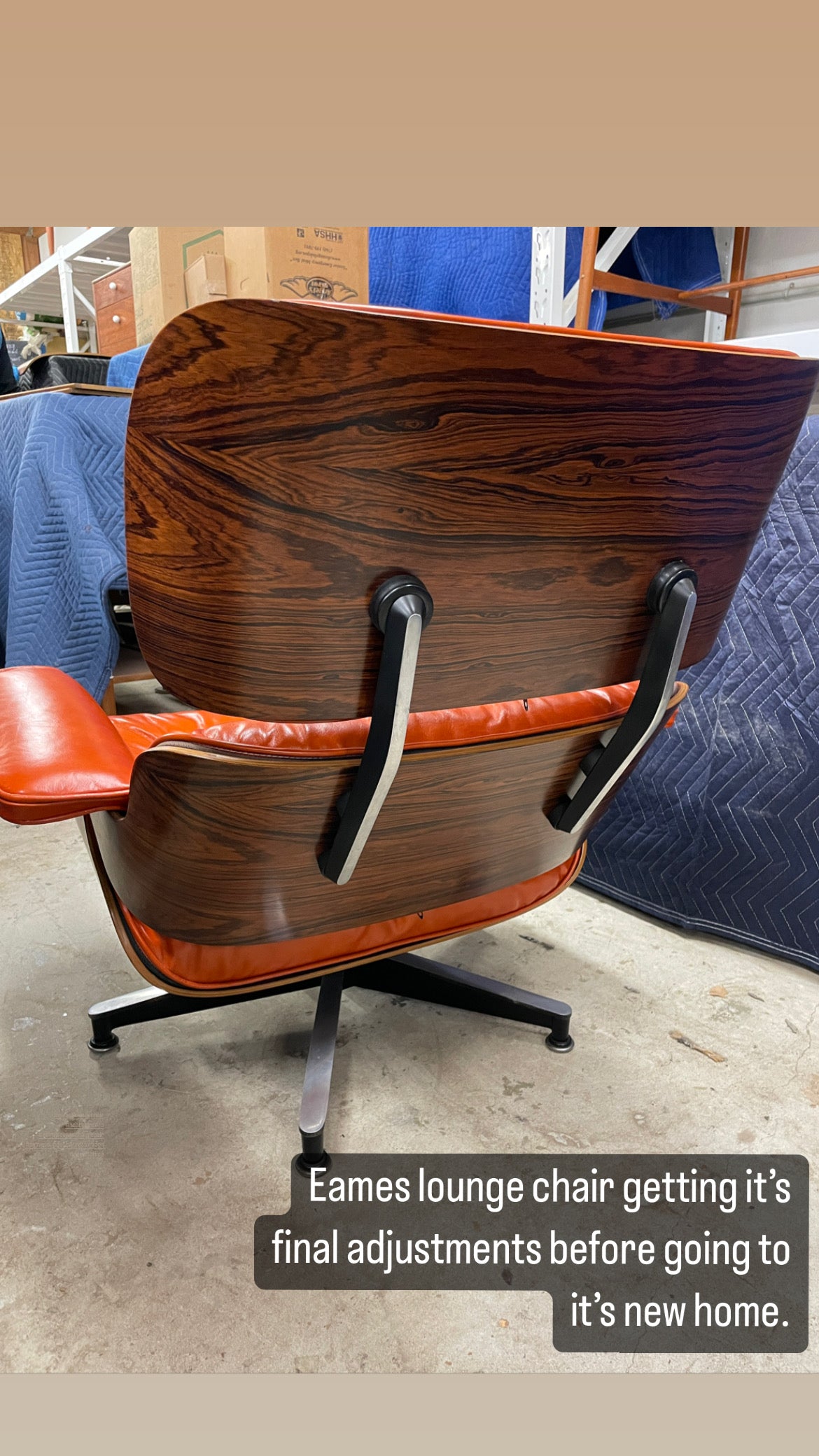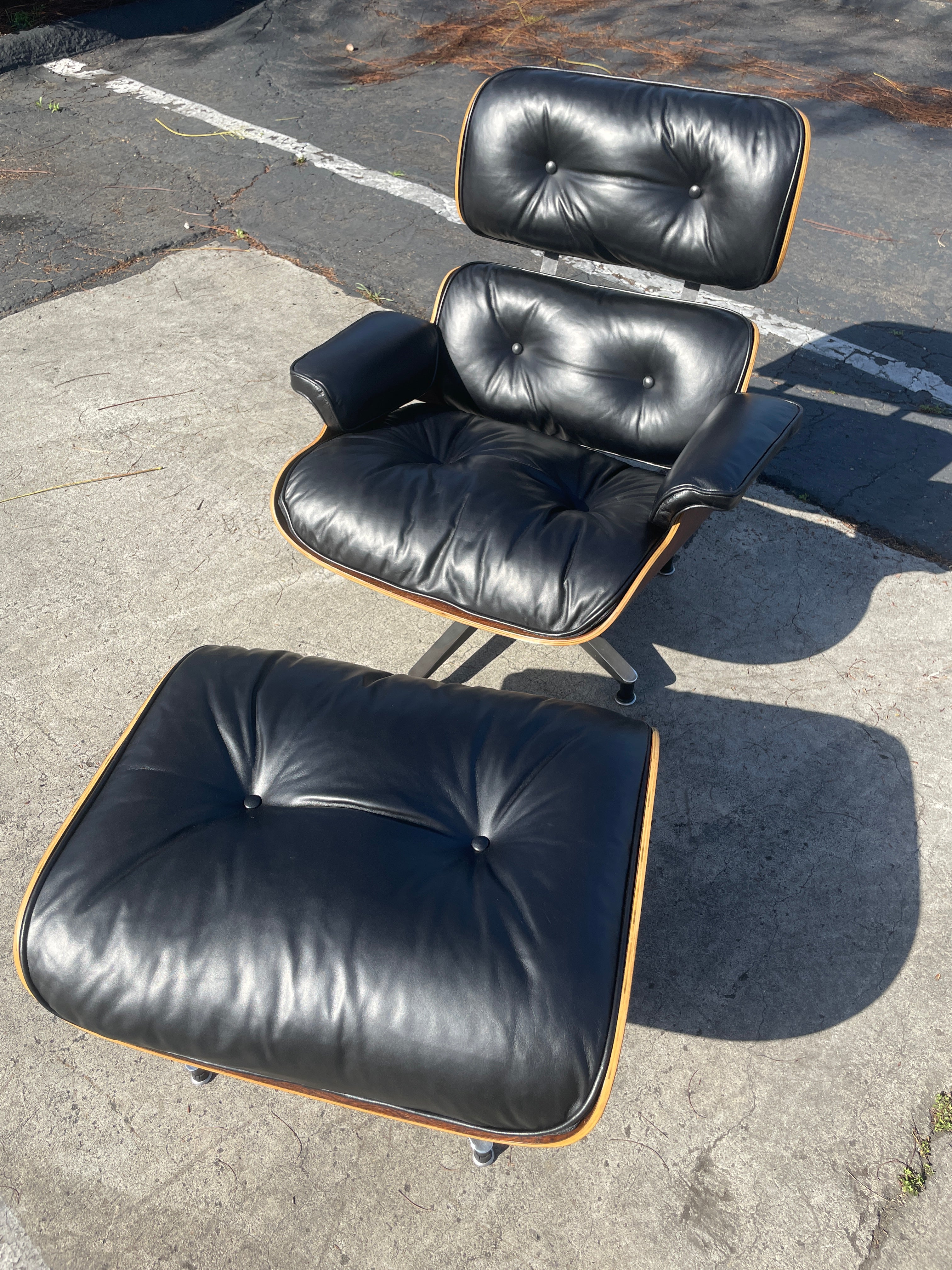 Eames Lounge Chairs with new Black Full-Grain Aniline leather with new backings. We use beautiful Italian leather that is closest to the original leather used on vintage Eames lounge chair.ย The leather has natural scars and texture with all the right wrinkle. Our Eames cushions are simply the best. The leather has a beautiful supple feeling and will make your tired chair feel new again.ย