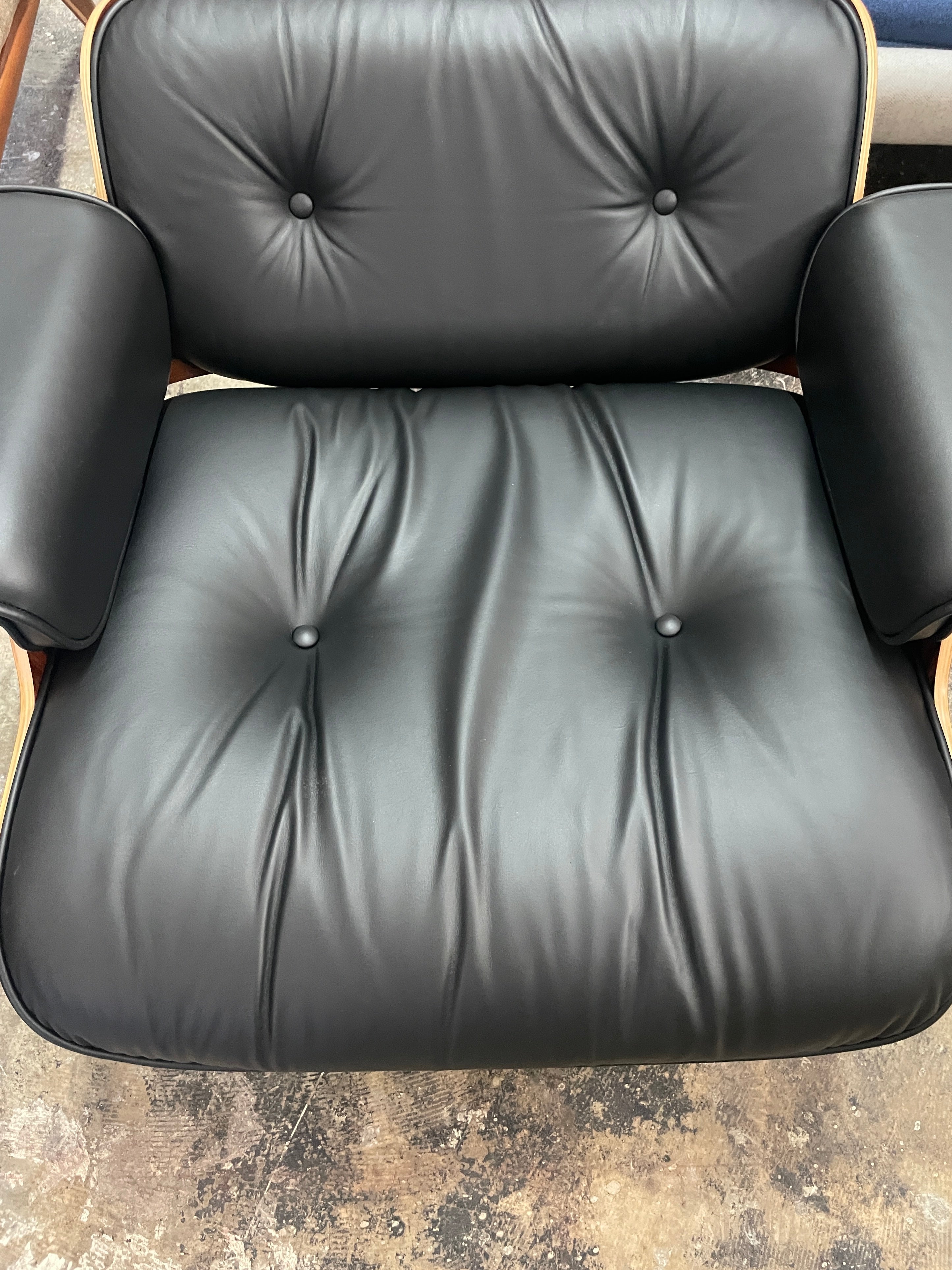 Tall Eames Lounge Chair Seat or Ottoman Cushion with New Black Full-Grain Aniline leather with new ABS backings. We use beautiful full aniline Italian leather that is the closest to the original leather used on the modern Eames lounge chair.ย Cushions made to order and usually take 10 business days.ย We ship them UPS/FedEx to your door.ย