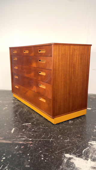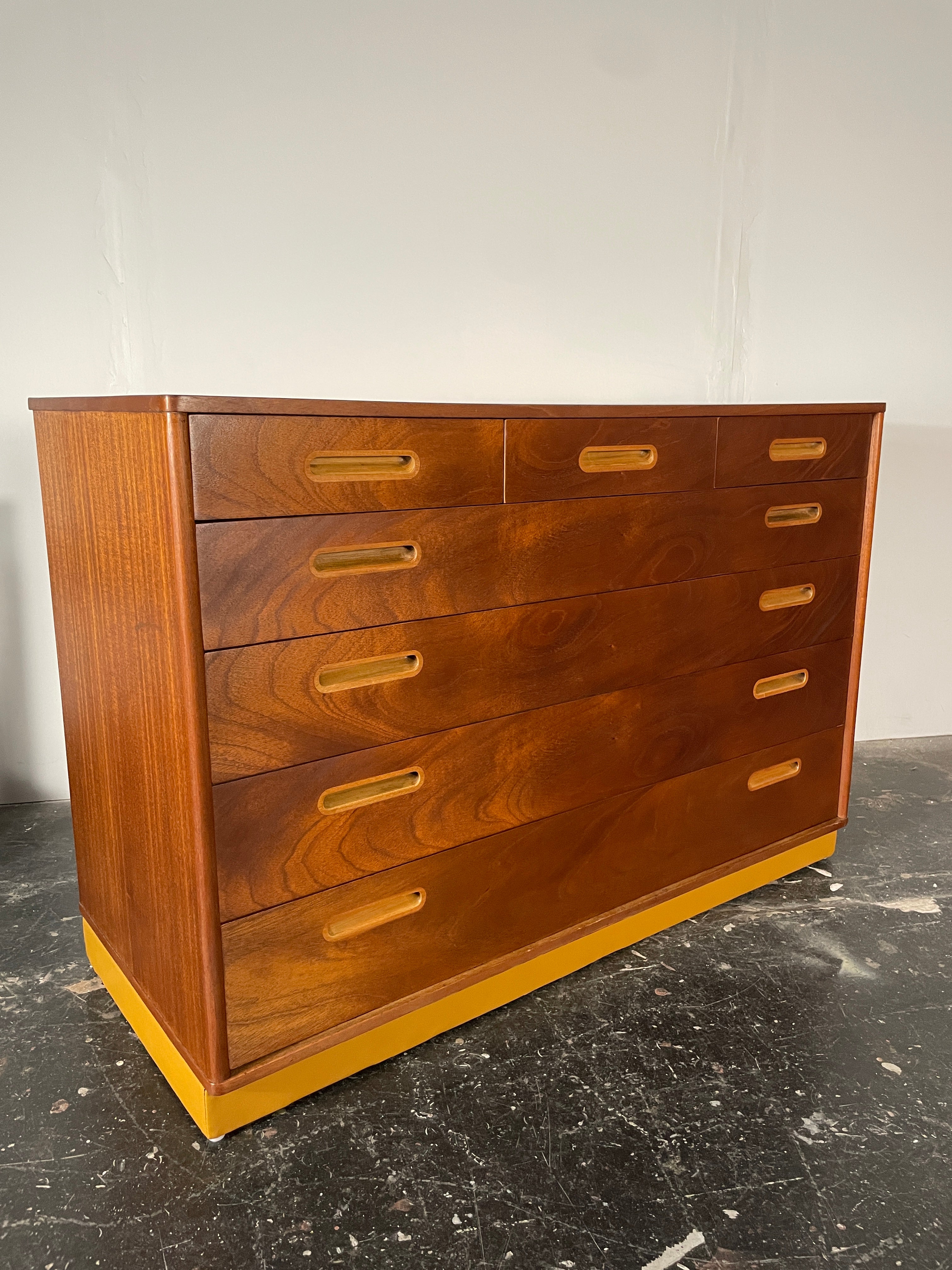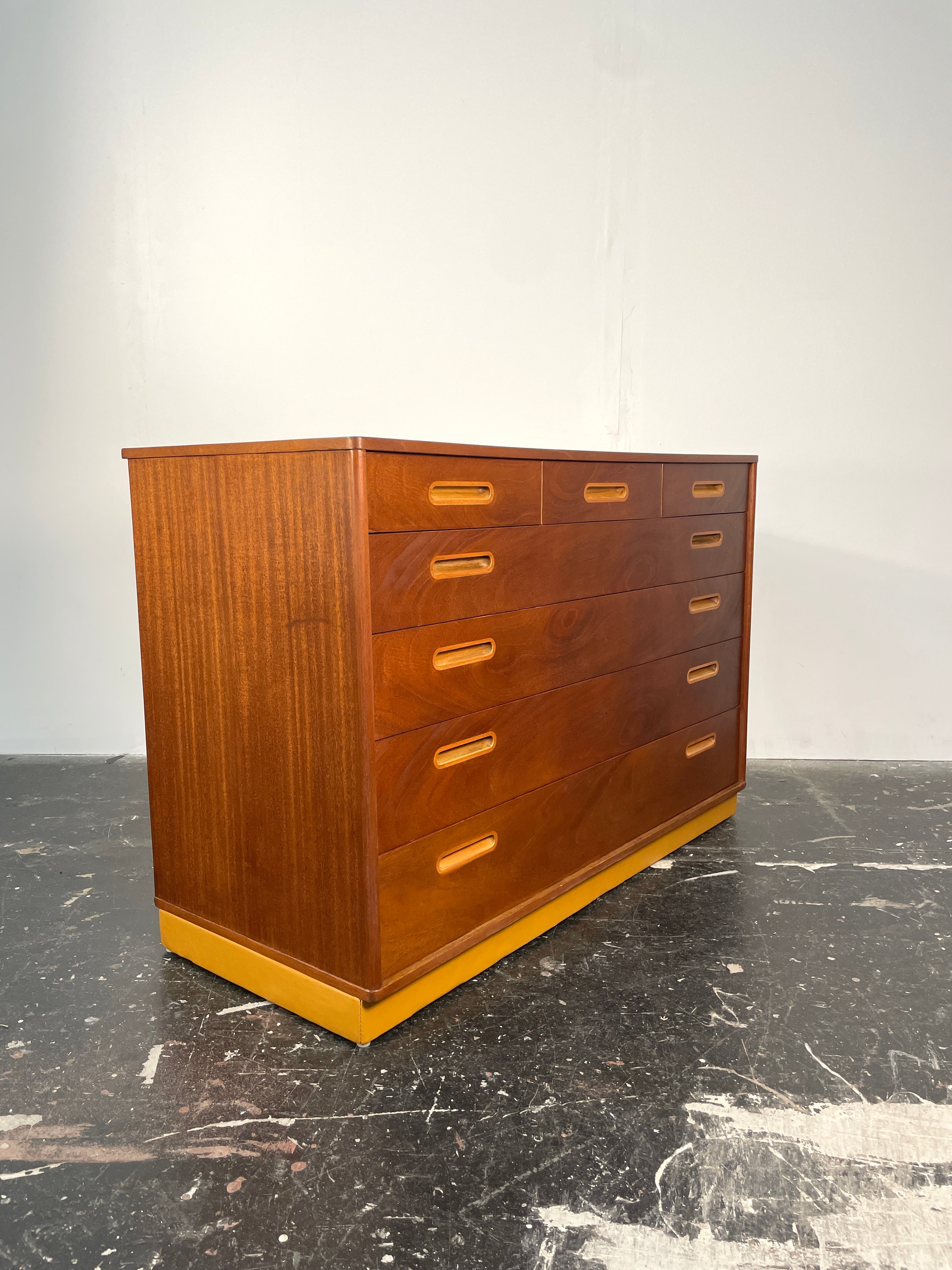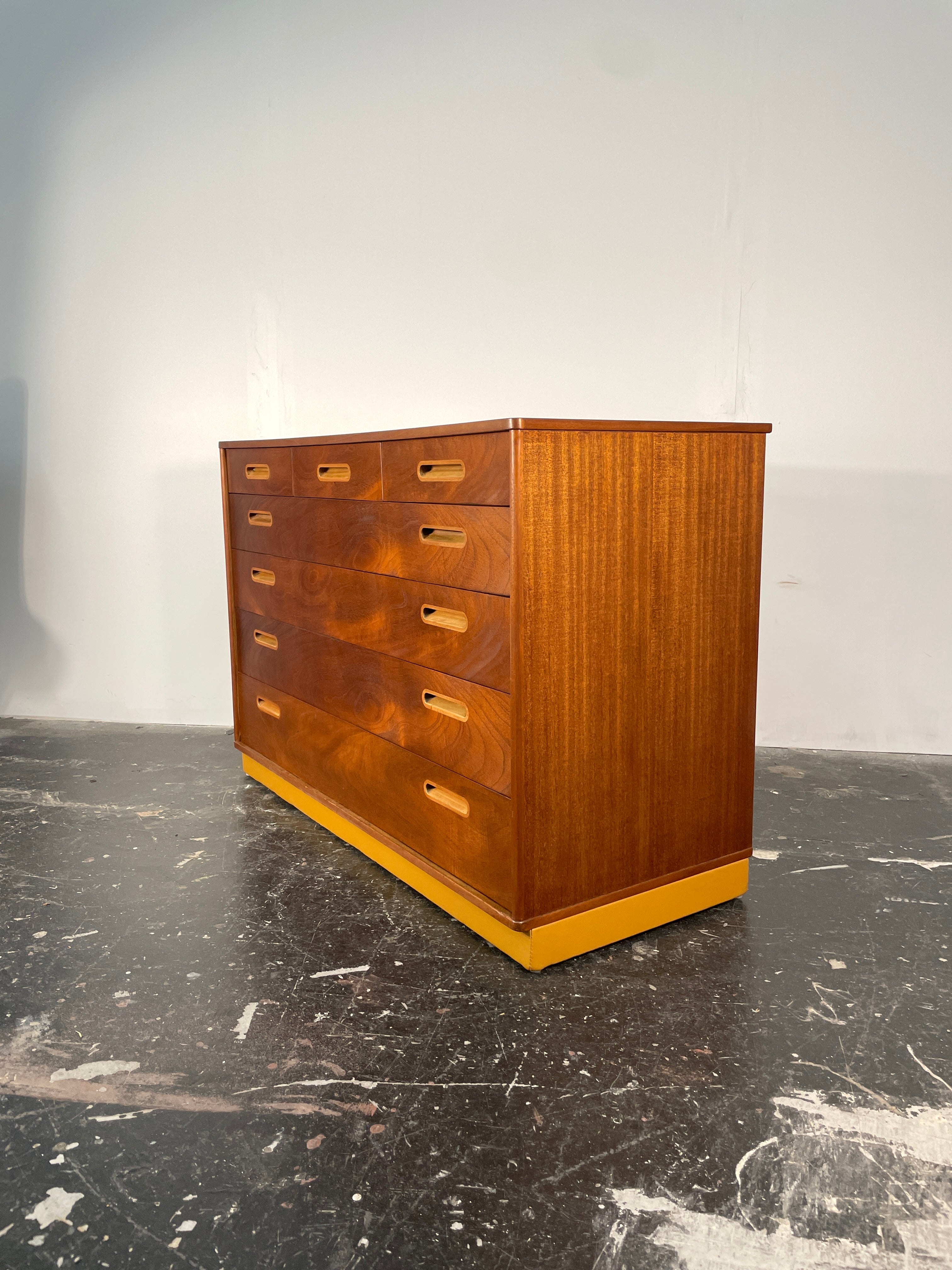 Uncommon Edward Wormley Dresser in mahogany, oak and leather for Dunbar. This tallboy has contrasting channelled recessed pulls in contrasting wood species: oak and mahogany. This pieces also features a luxurious leather wrapped plinth base and solid oak drawers. Three smaller drawers on top with 4 deeper drawers below. This piece will work well in a variety of interior from traditional, art deco, maximalist and farmhouse design.
