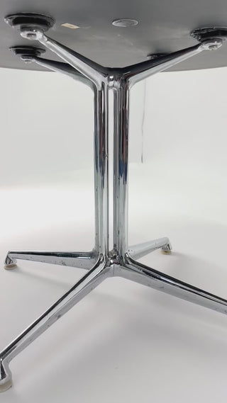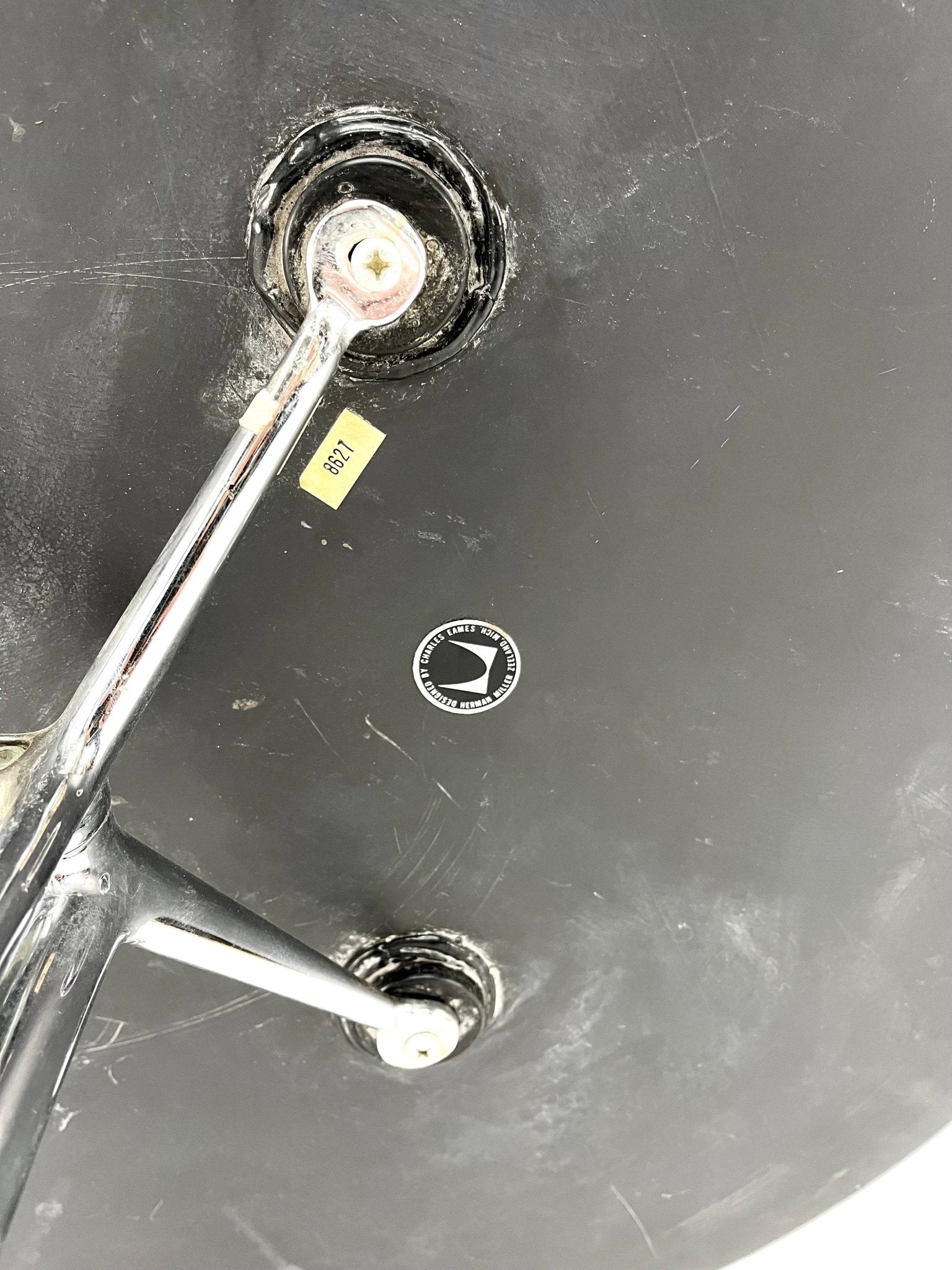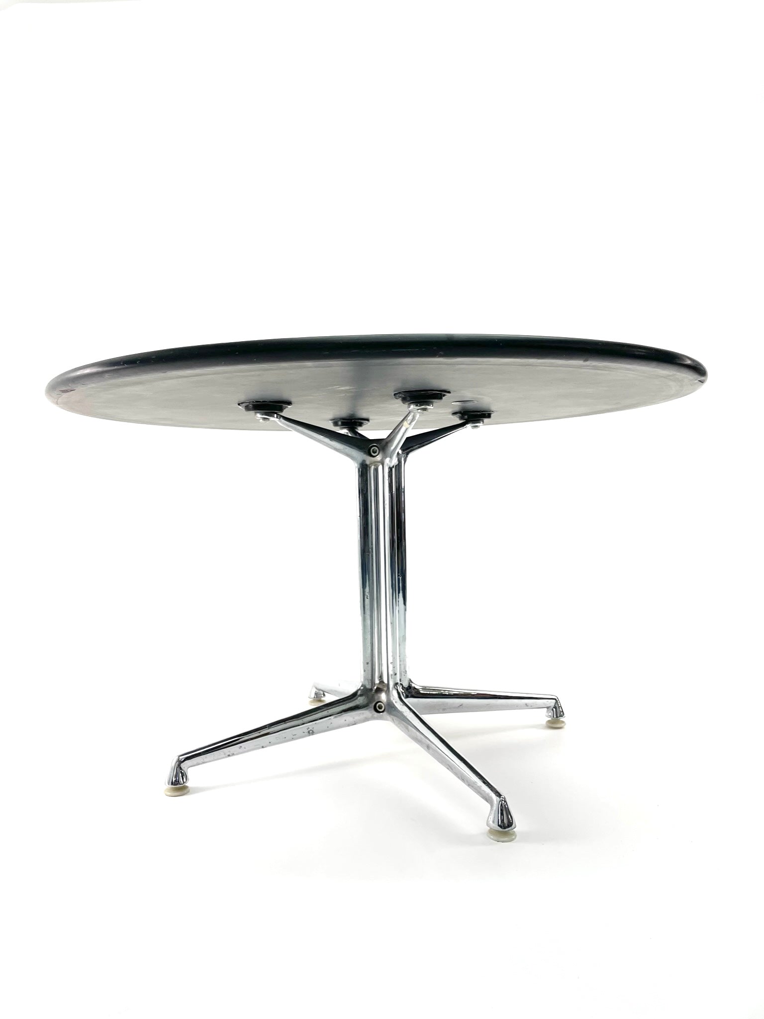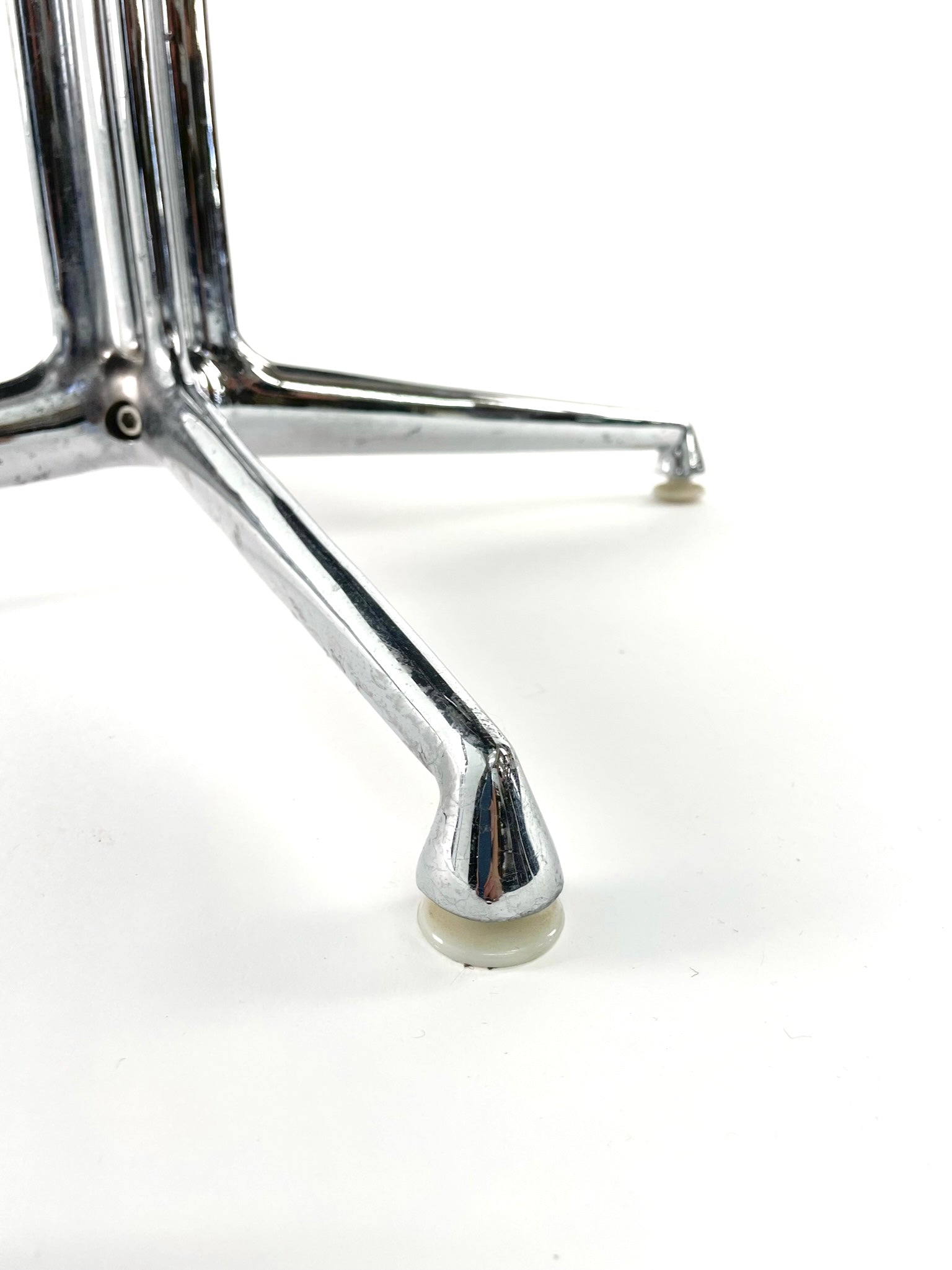 It is raised over beautifully molded and chromed steel legs raised on original plastic glides.ย Labeled with the early Herman Miller disc label, these are no longer manufactured.
