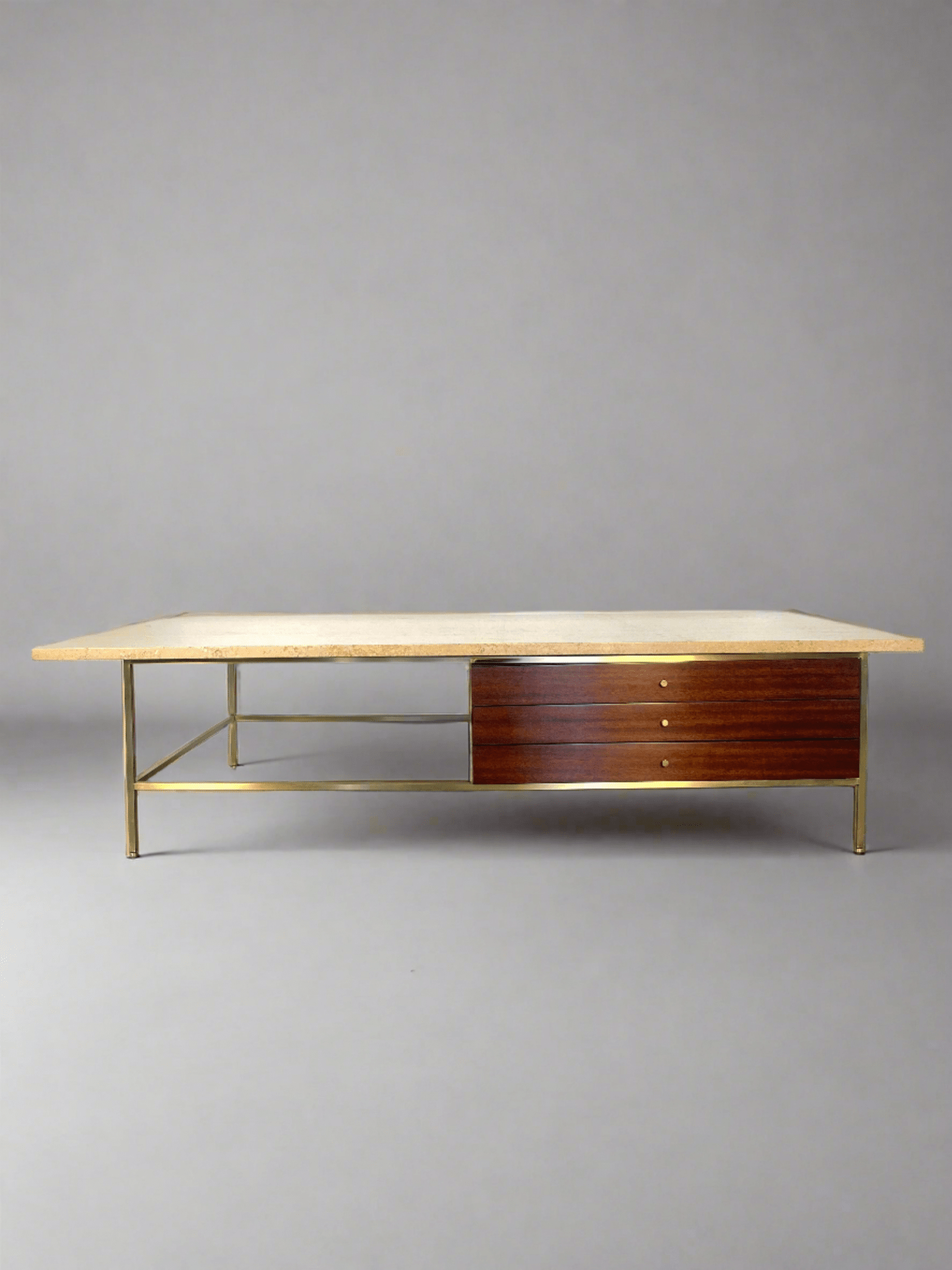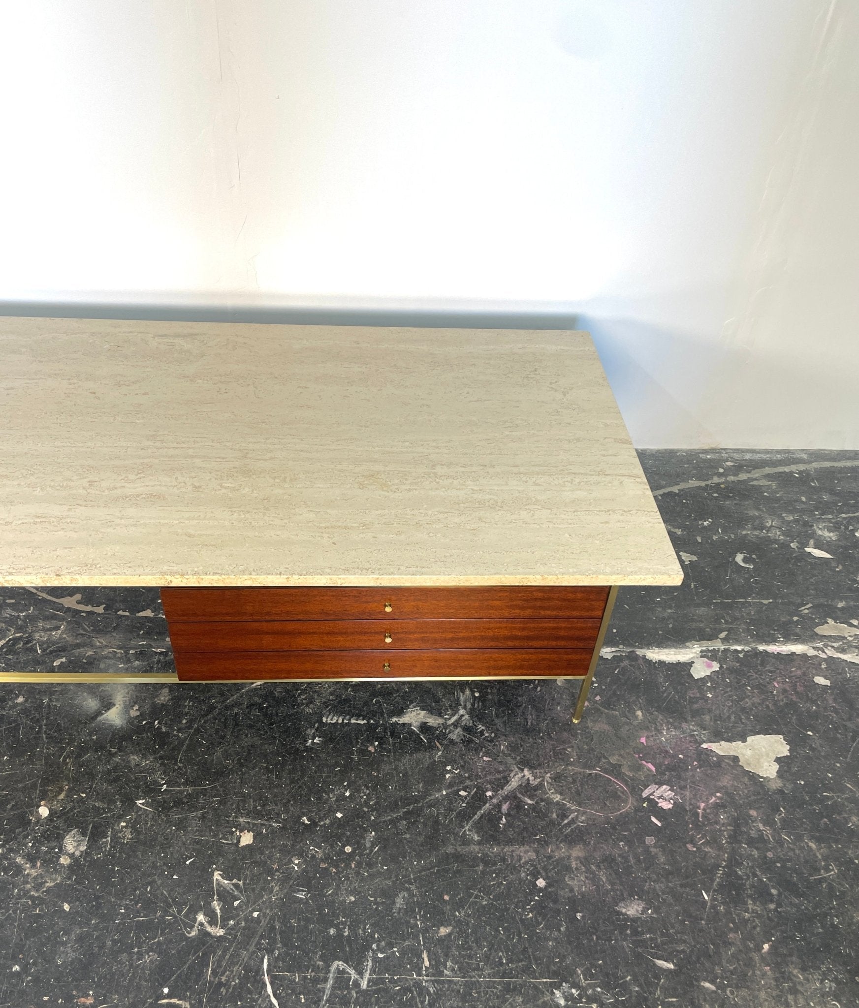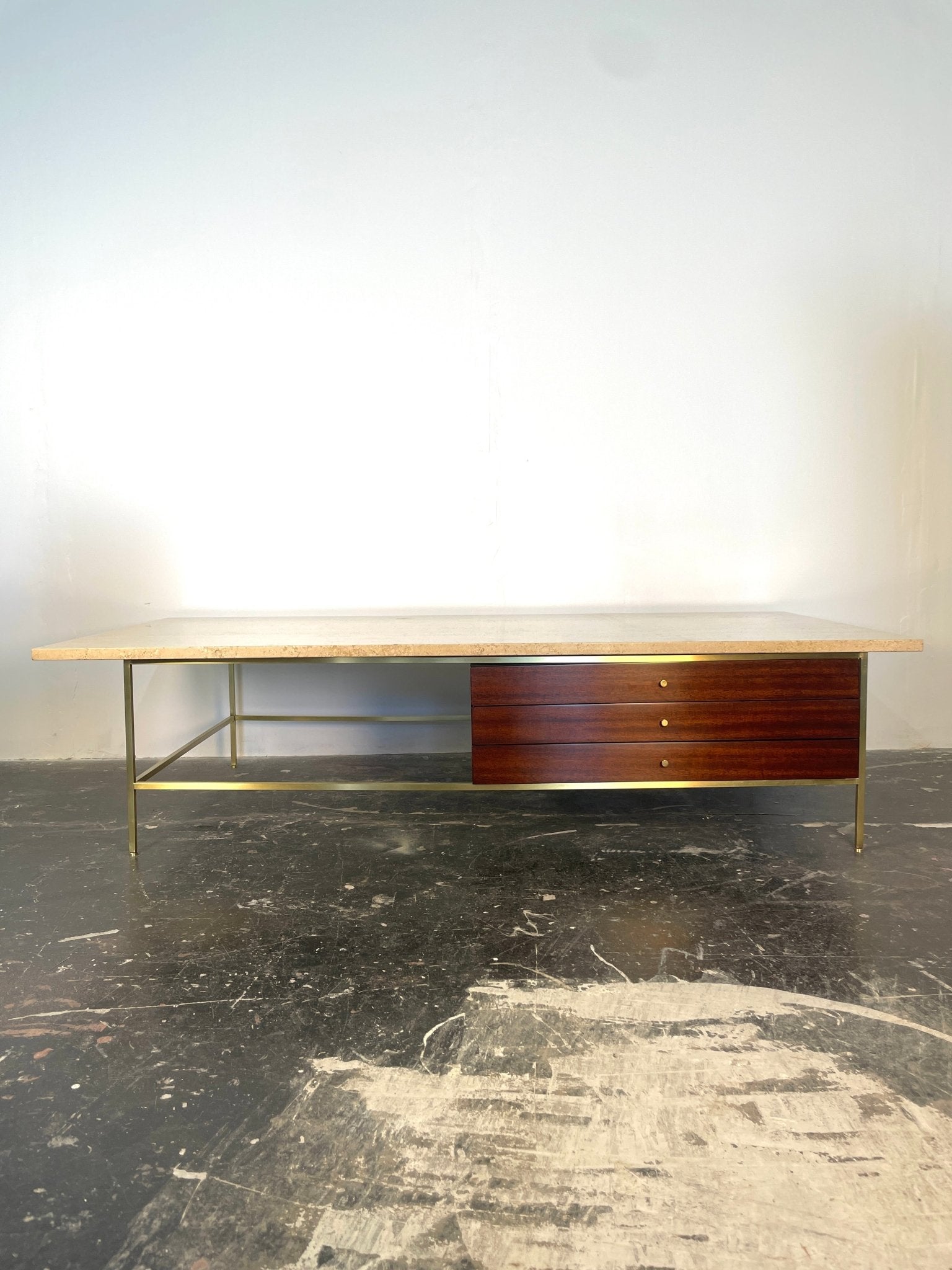 Original Paul McCobb walnut and brass plateau table model 8705-L with travertine marble top from the Irwin Collection by Calvin Furniture. The Mid-Century Modern cocktail table features: rectangular Italian travertine top; three drawers with brass pulls; brass frame; label. 100% original finish and condition. The perfect vintage coffee table, would work great with a large L - shaped sofa.ย ย