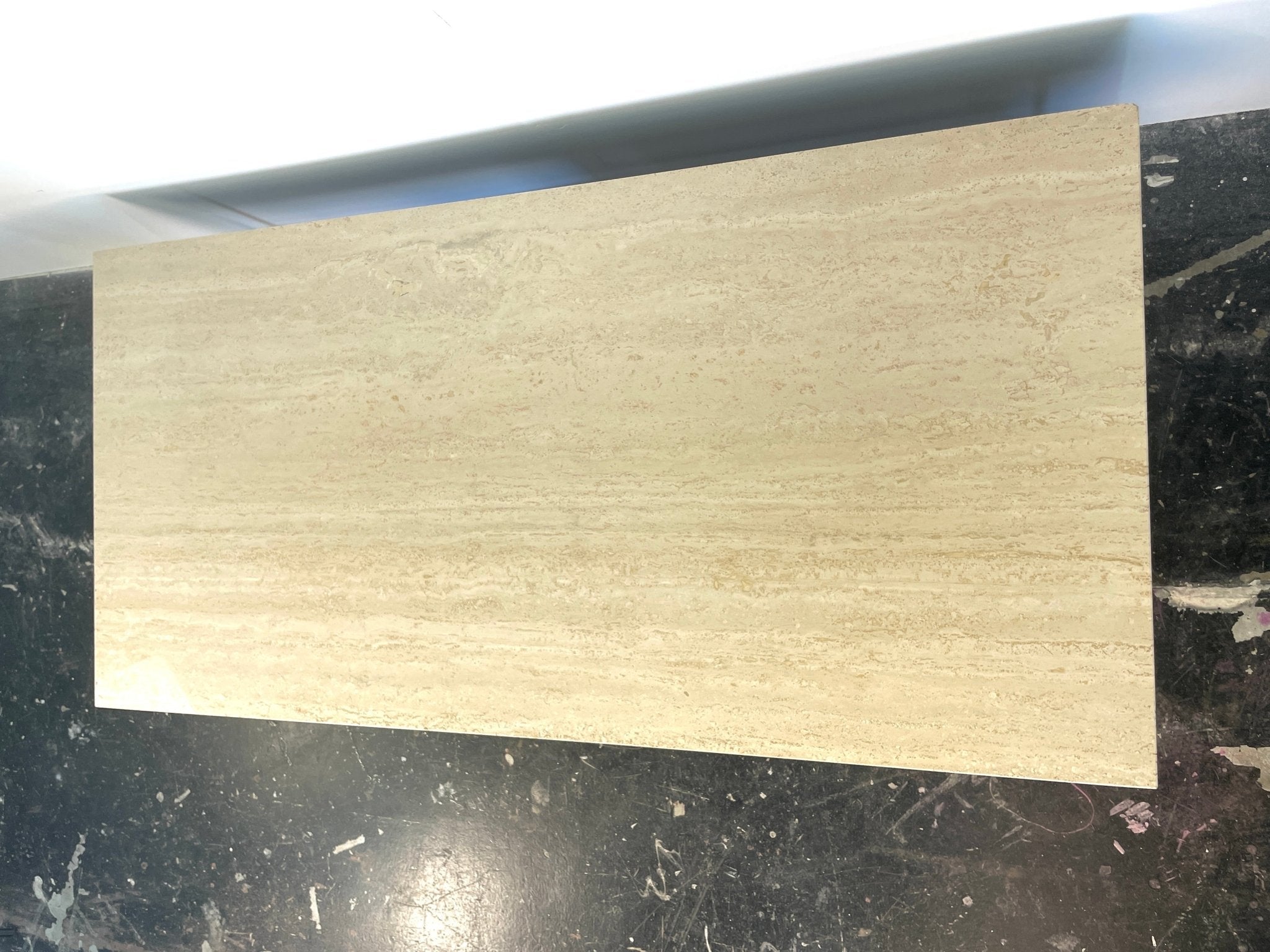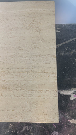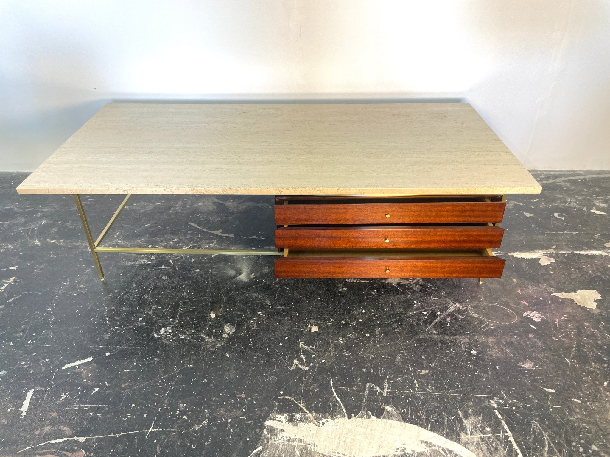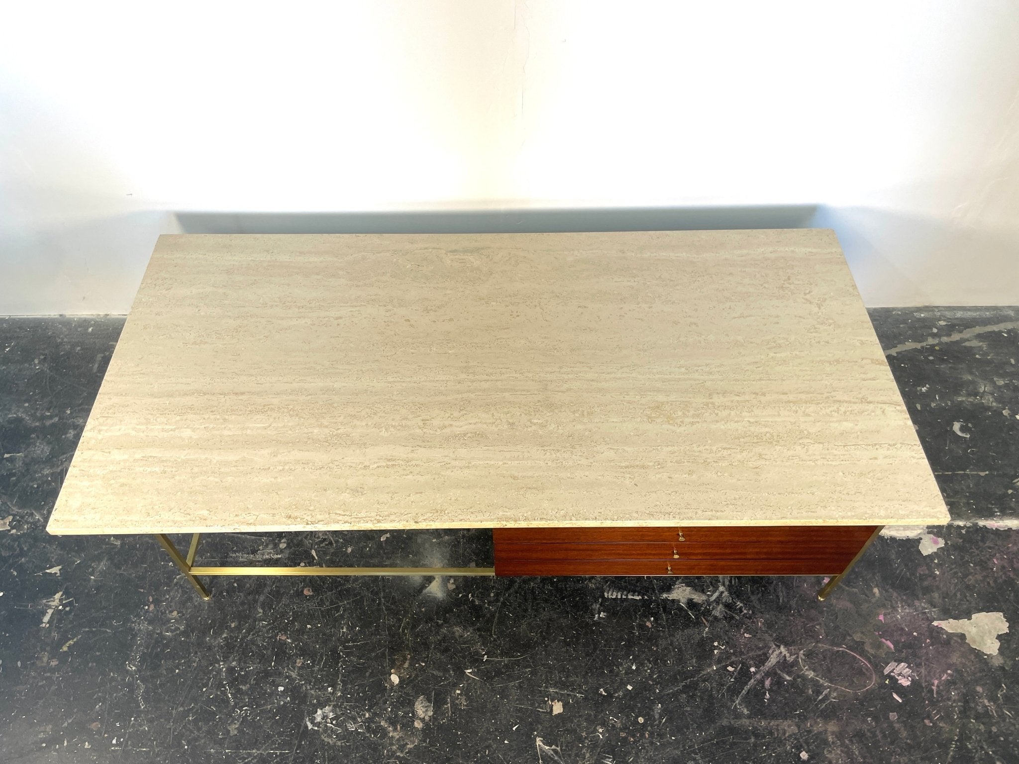 Original Paul McCobb walnut and brass plateau table model 8705-L with travertine marble top from the Irwin Collection by Calvin Furniture. The Mid-Century Modern cocktail table features: rectangular Italian travertine top; three drawers with brass pulls; brass frame; label. 100% original finish and condition. The perfect vintage coffee table, would work great with a large L - shaped sofa.ย ย