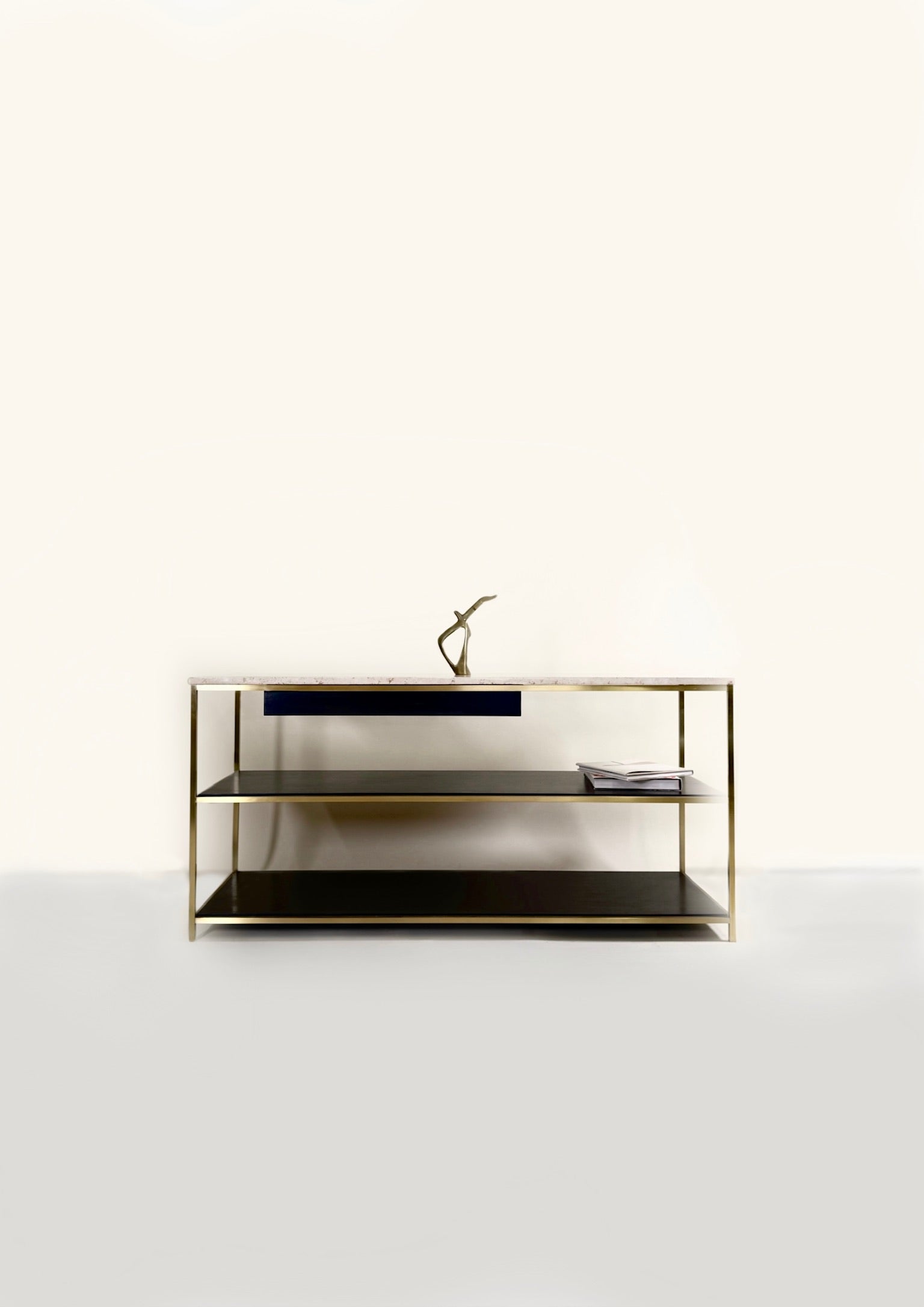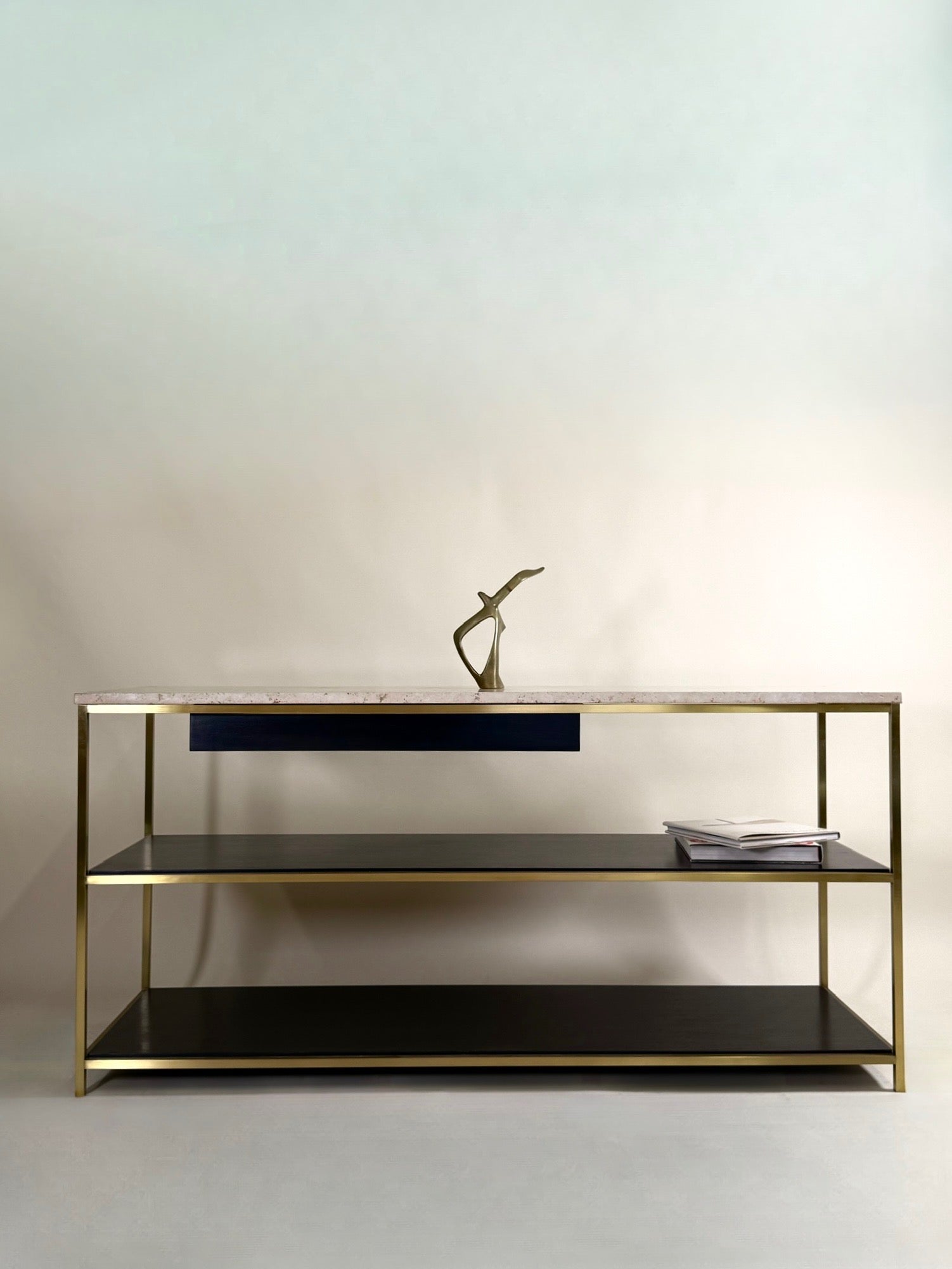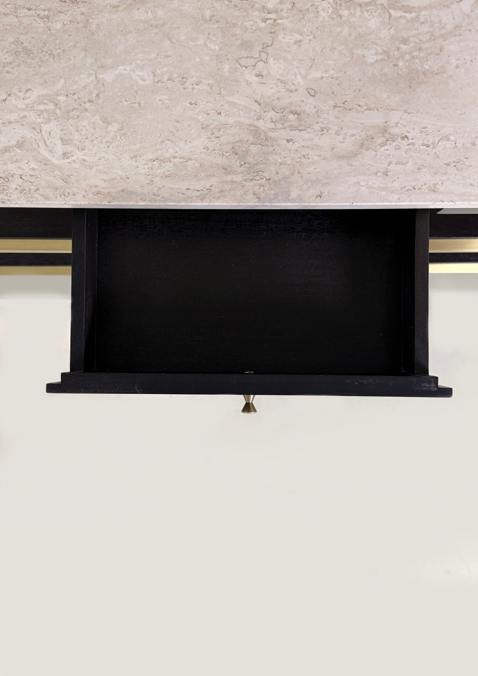 Constructed with a bold architectural frame in solid brass, this console table exudes sophistication from every angle. The ebonized wood finish adds dramatic contrast and depth, giving the piece a refined yet grounded presence. Topping the structure is a stunning slab of travertine, offering a natural, textural surface that highlights the elegance of the design.