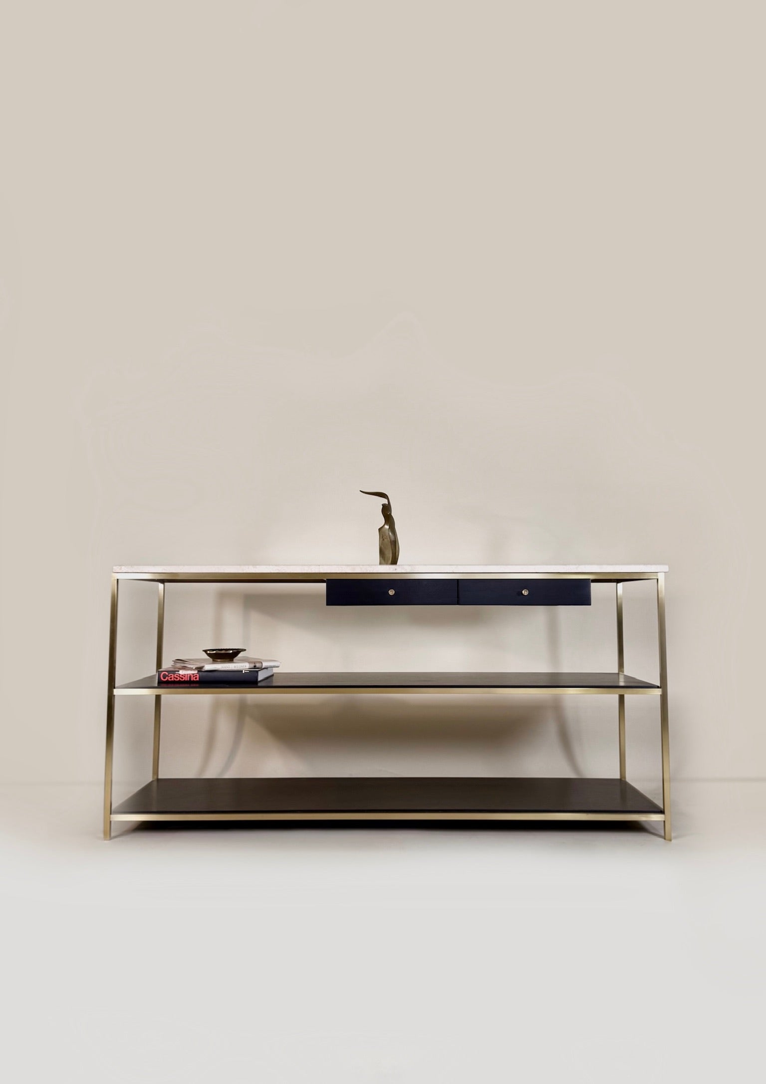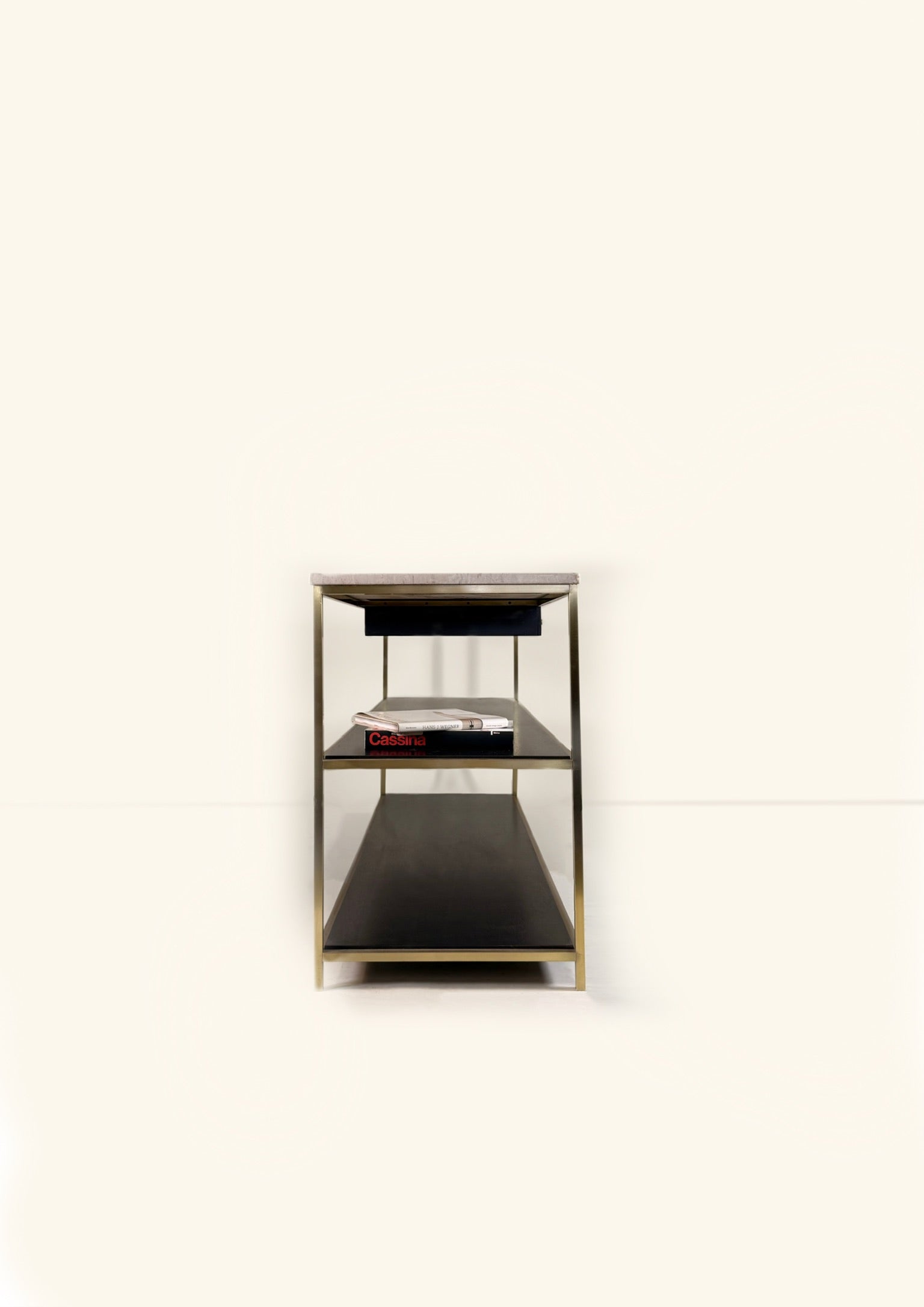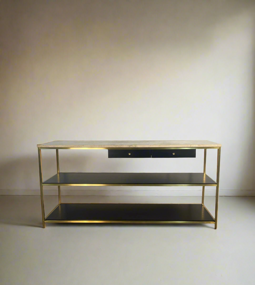 The console features two cantilevered drawers that appear to float within the frame—a hallmark of McCobb’s innovative approach to space and visual lightness. Below the drawers are two fixed shelves, ideal for display or storage. The console is finished on all sides, making it an ideal piece to float in the center of a room, behind a sofa, or along a wall in an entryway, living room, or dining space.