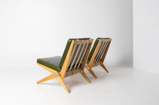 Rare Pair of Pierre Jeanneret Scissor Lounge Chairs for Knoll in Moss Leather