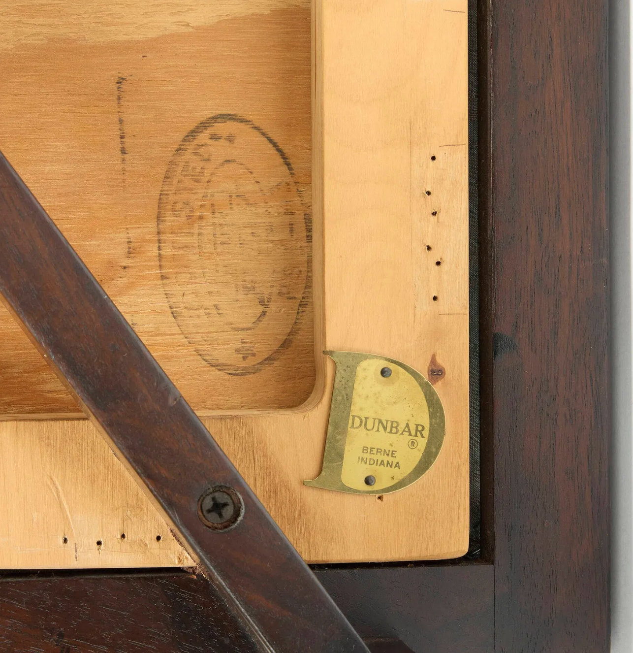 Four of the six chairs retain their original gold metal manufacturer’s labels affixed to the underside, stamped “Dunbar, Berne, Indiana”, confirming their authenticity.