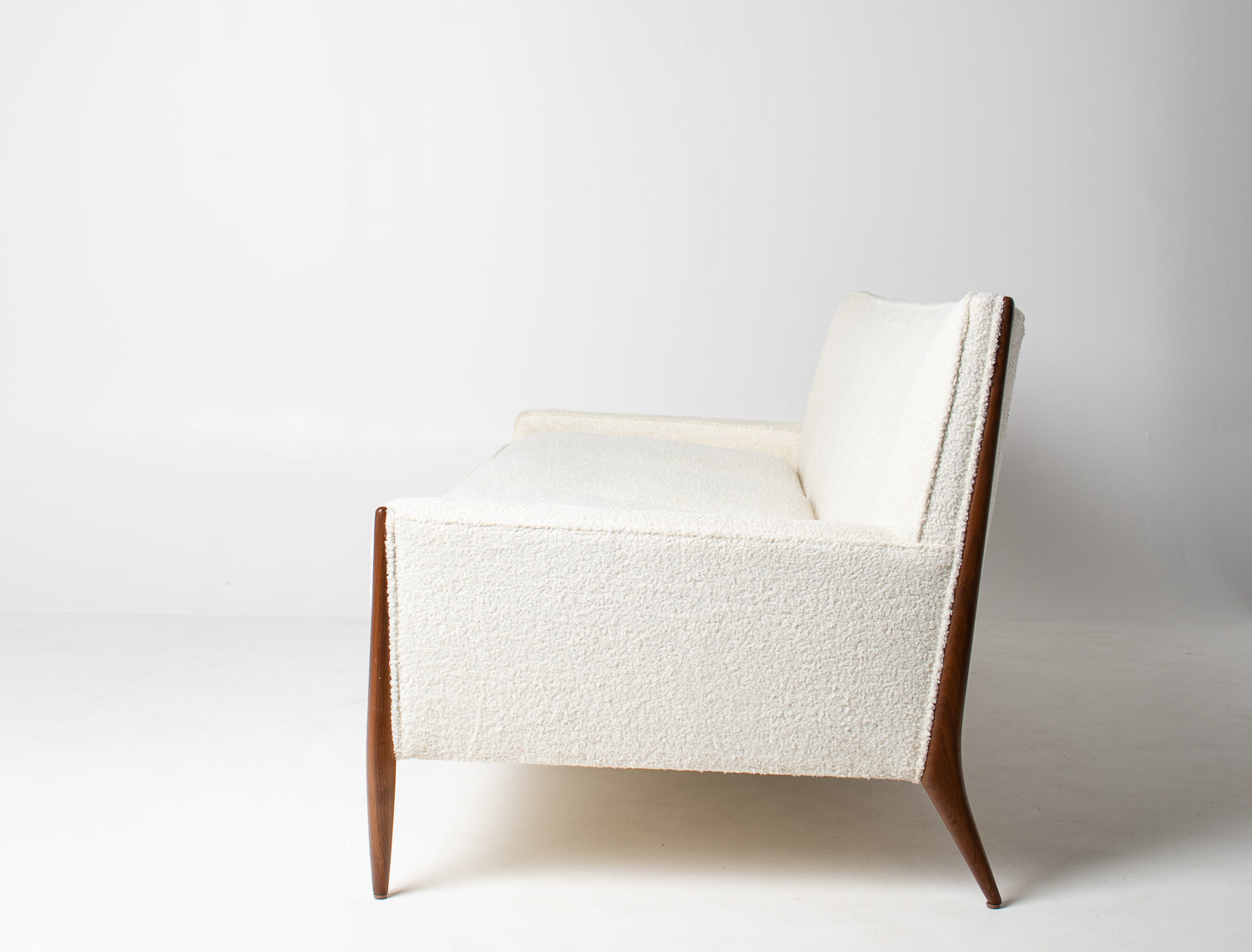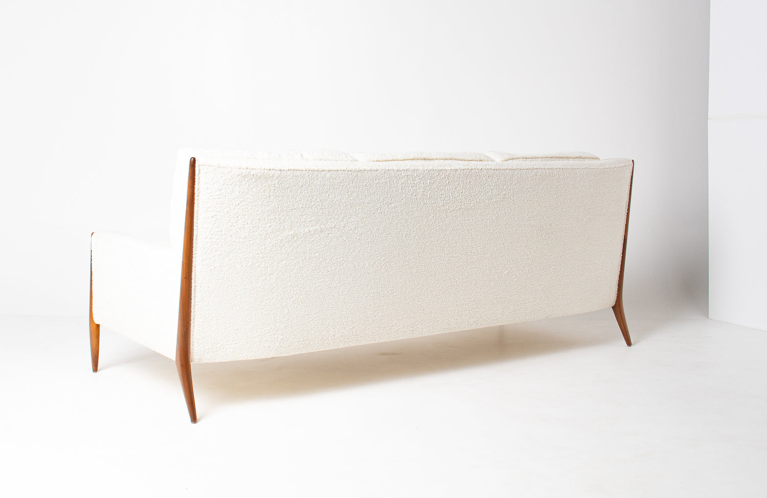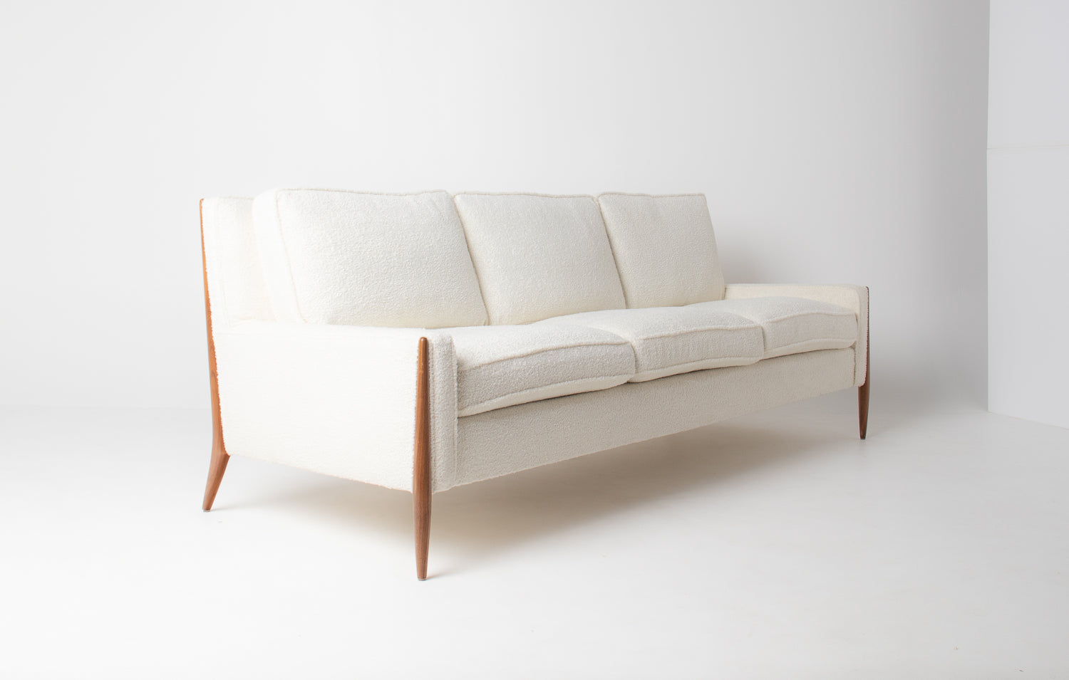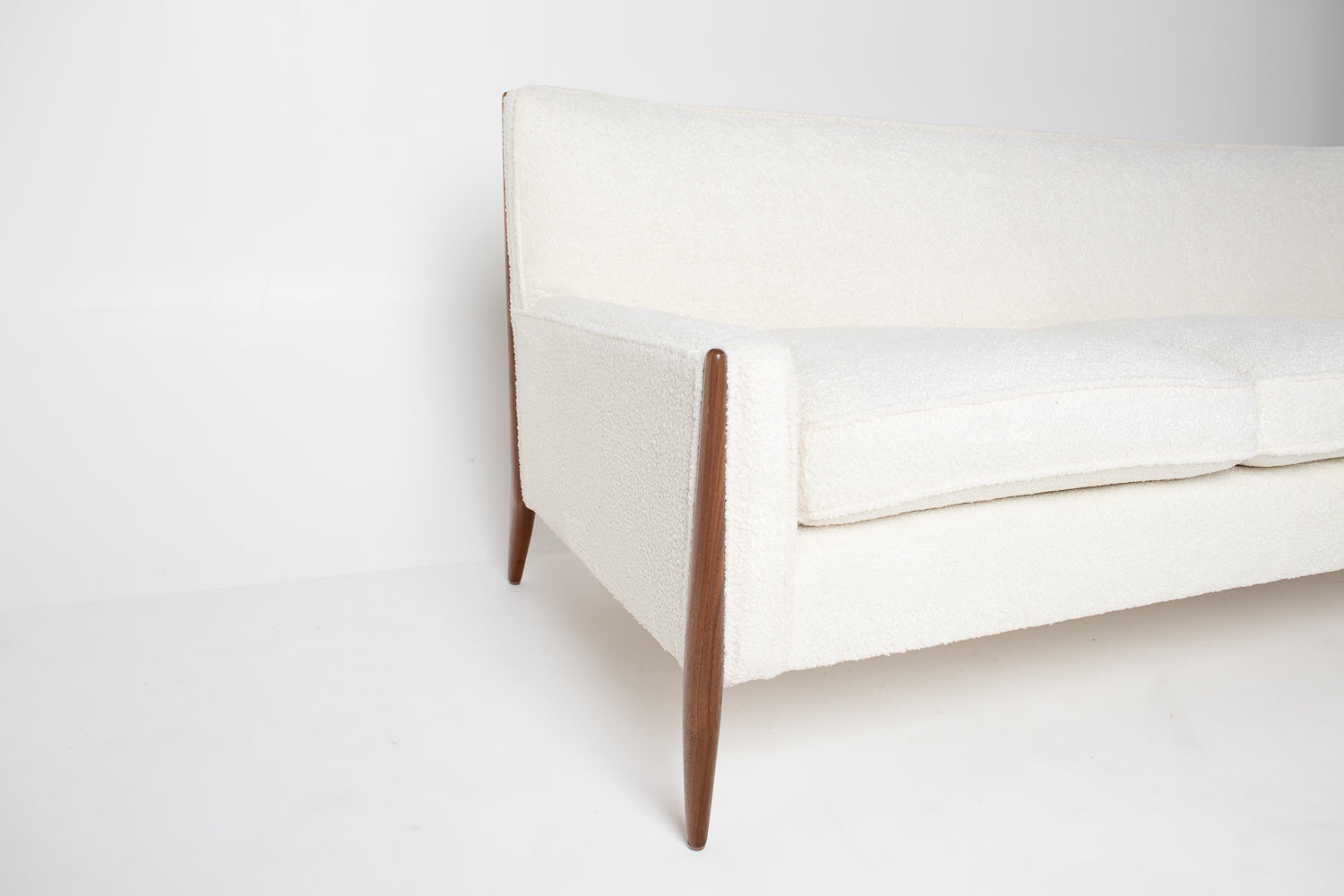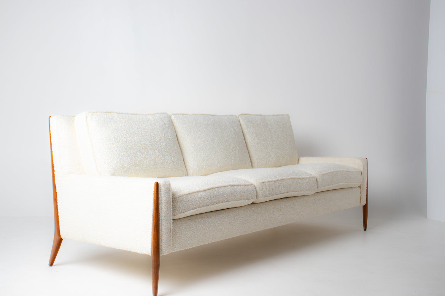 The sofa has been newly upholstered in Kravet Smart® performance bouclé, fabric no. 36598-101, a beautifully soft and luxurious textile that offers the rich texture of classic bouclé with modern performance benefits. Designed for real life, this fabric is easy to clean, highly durable, and ideal for everyday use, while remaining elegant and inviting to the touch. Cushions are stuffed with new Goose Down Feathers.