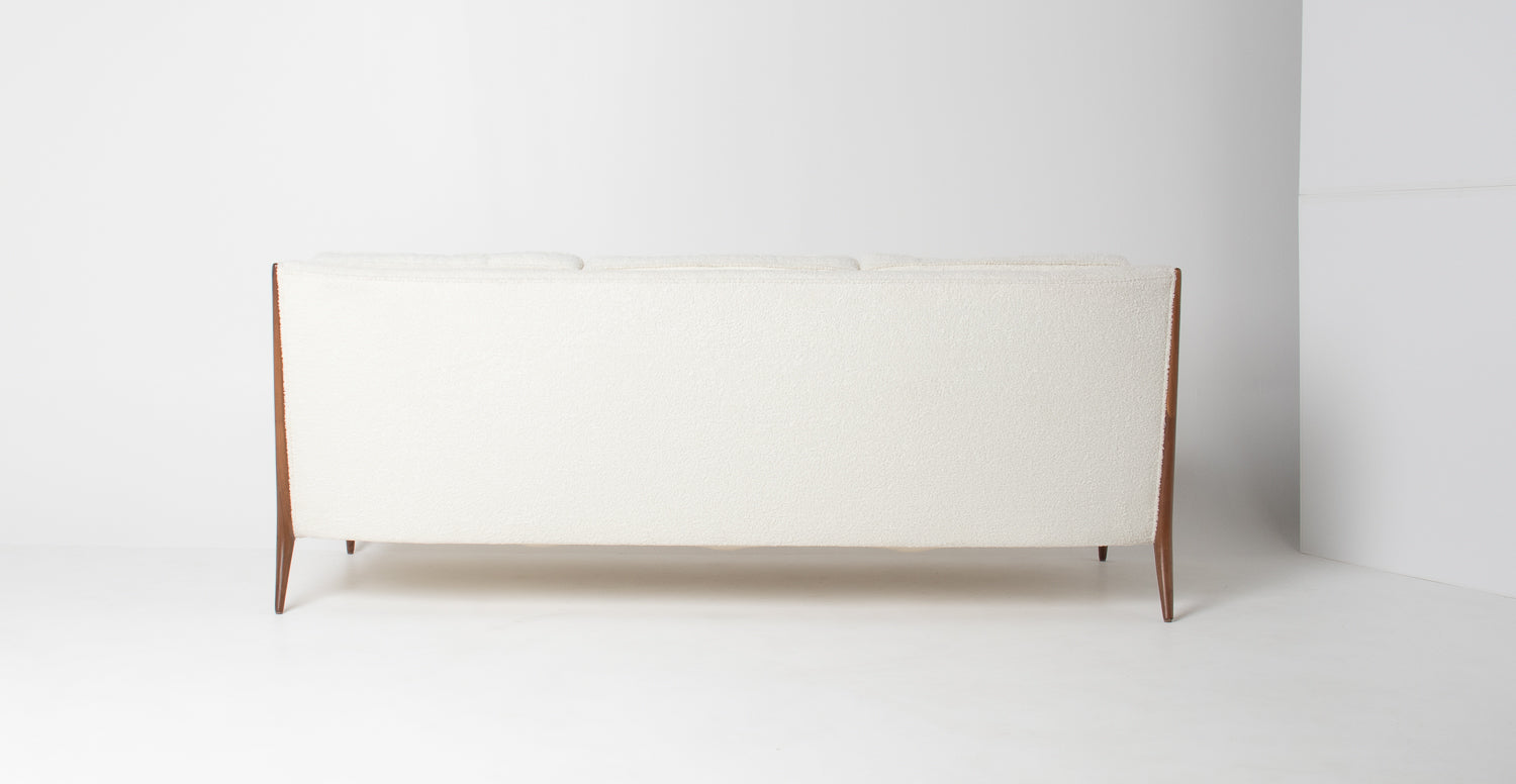 Beautifully crafted solid walnut legs ground the design, with sculptural curved back legs that create a graceful silhouette from every angle. Finished on all sides, this sofa is perfectly suited to float in a room, allowing its thoughtful lines and warm walnut tones to be fully appreciated.