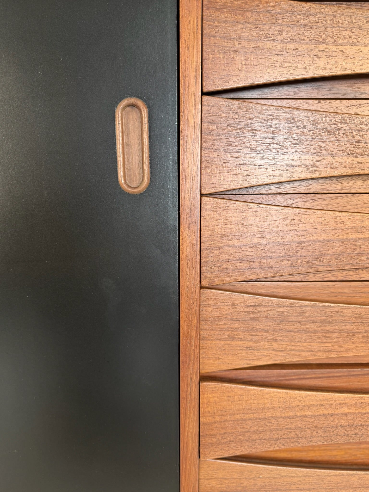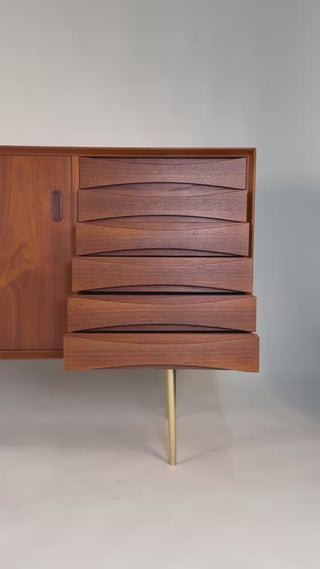 A beautiful and rare example of Danish mid‑century modern design, this Arne Vodder Model 29 credenza showcases the iconic designer’s signature craftsmanship and timeless style. Crafted from rich, warm teak, this vintage sideboard features clean lines, a sliding door with a sleek recessed handle, and a bank of six sculpted, bow‑front drawers that highlight Vodder’s attention to detail.