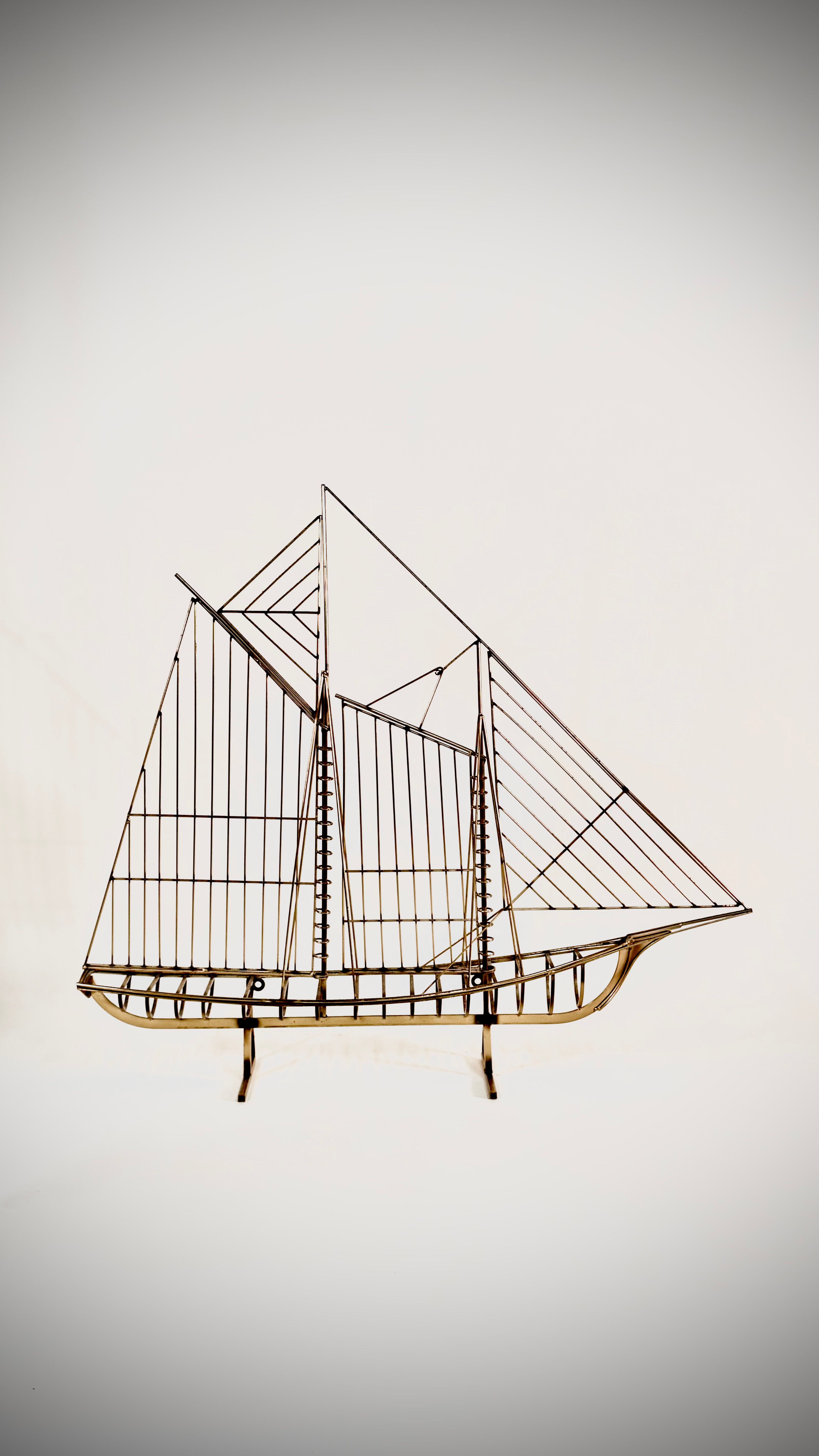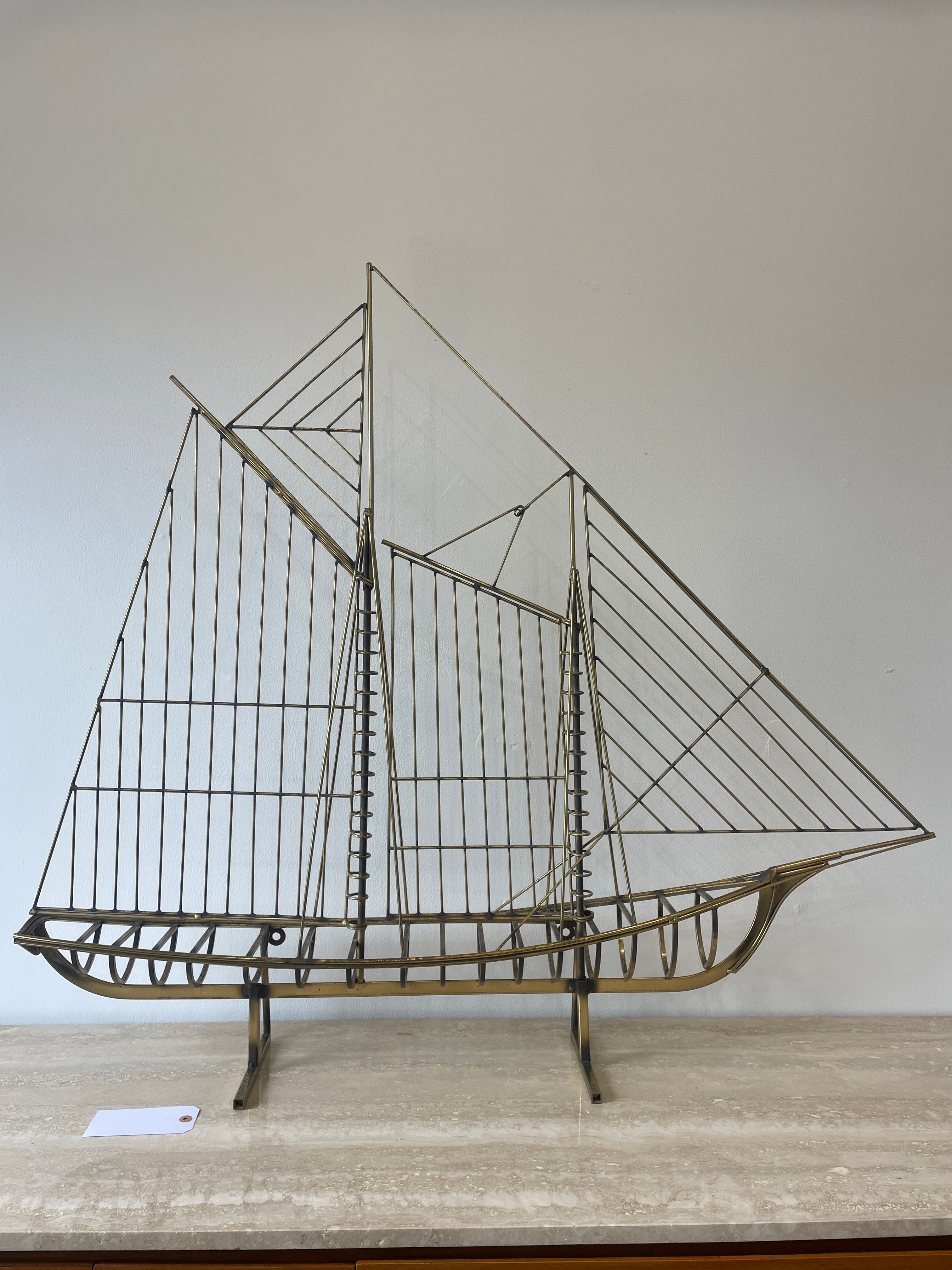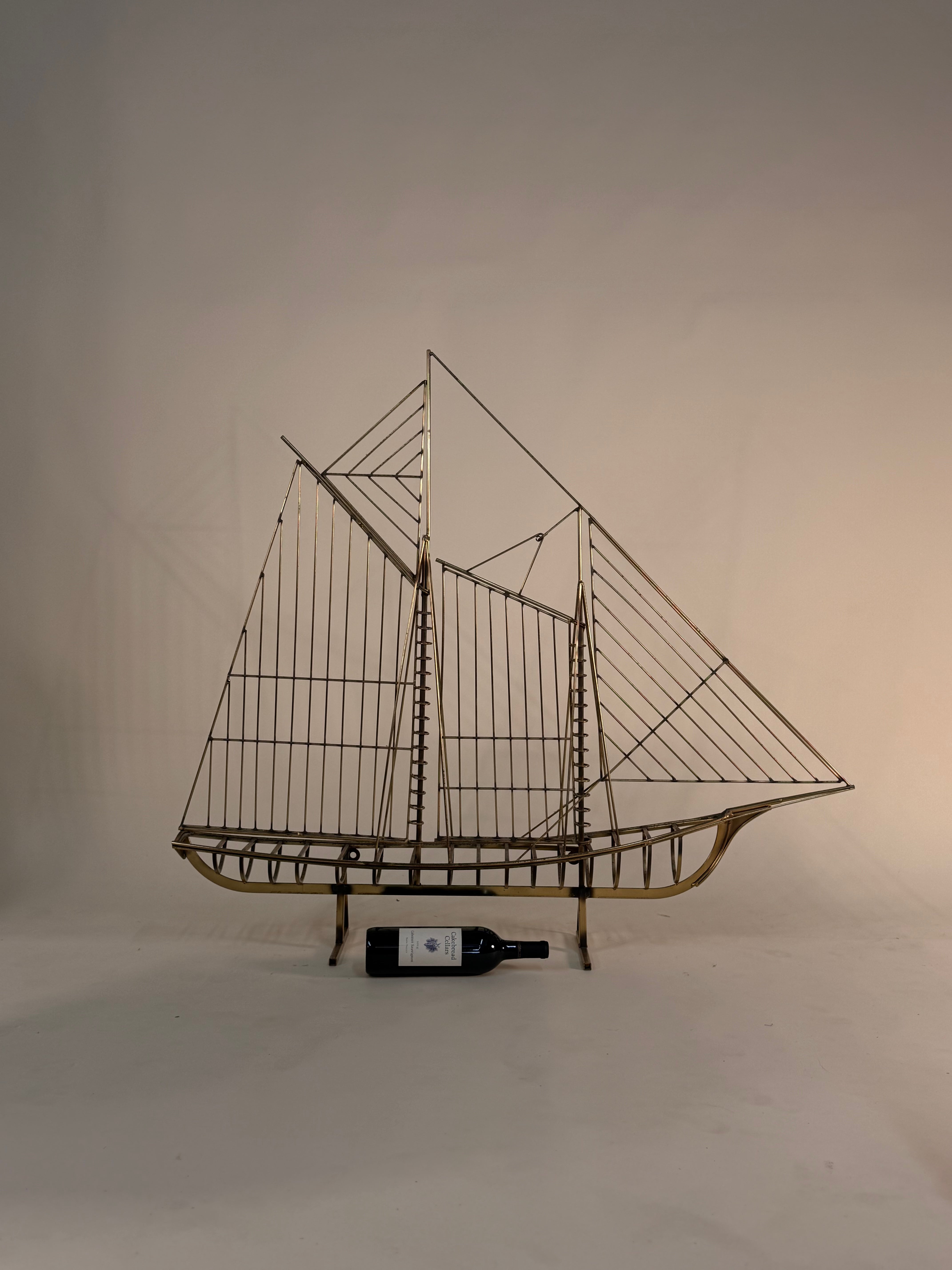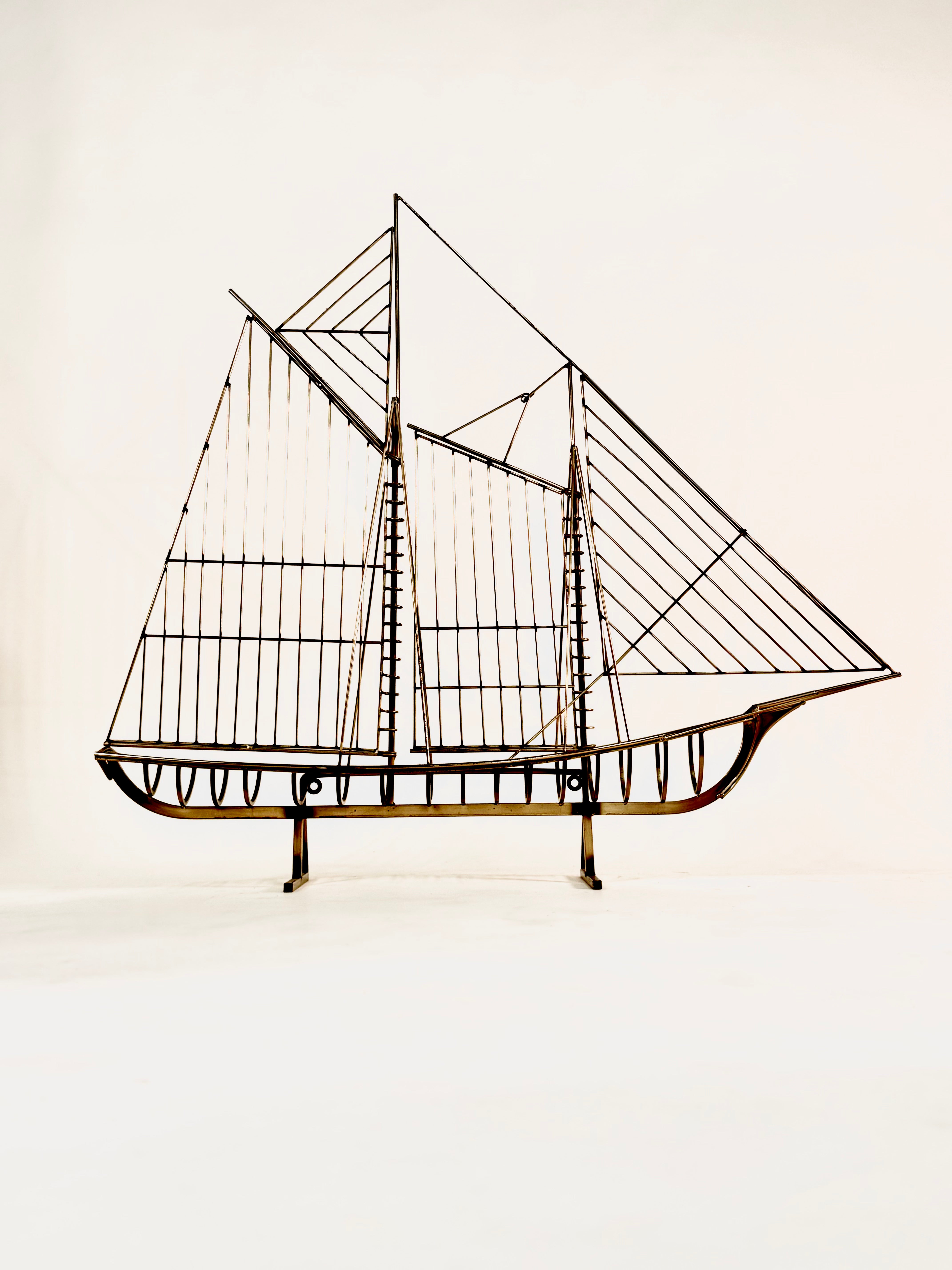 Brass Sailboat Sculpture by Curtis Jere for Artisan House. Featuring a one piece three dimensional Sloop in all brass on a open footed and rectangular Brass base. Nice vintage patina. Can be mounted on a wall or sit on top of a credenza or table.