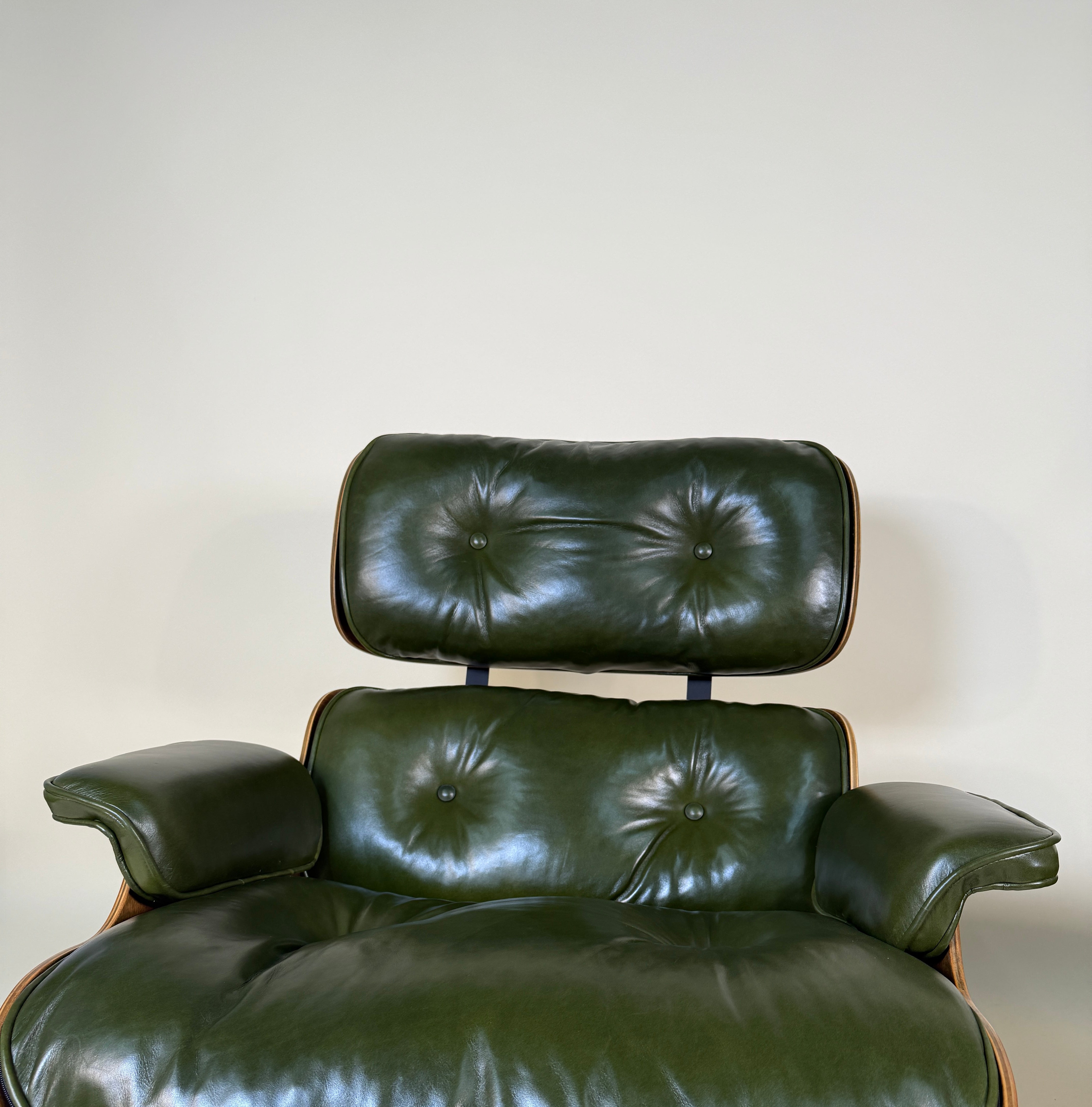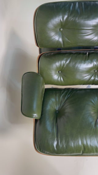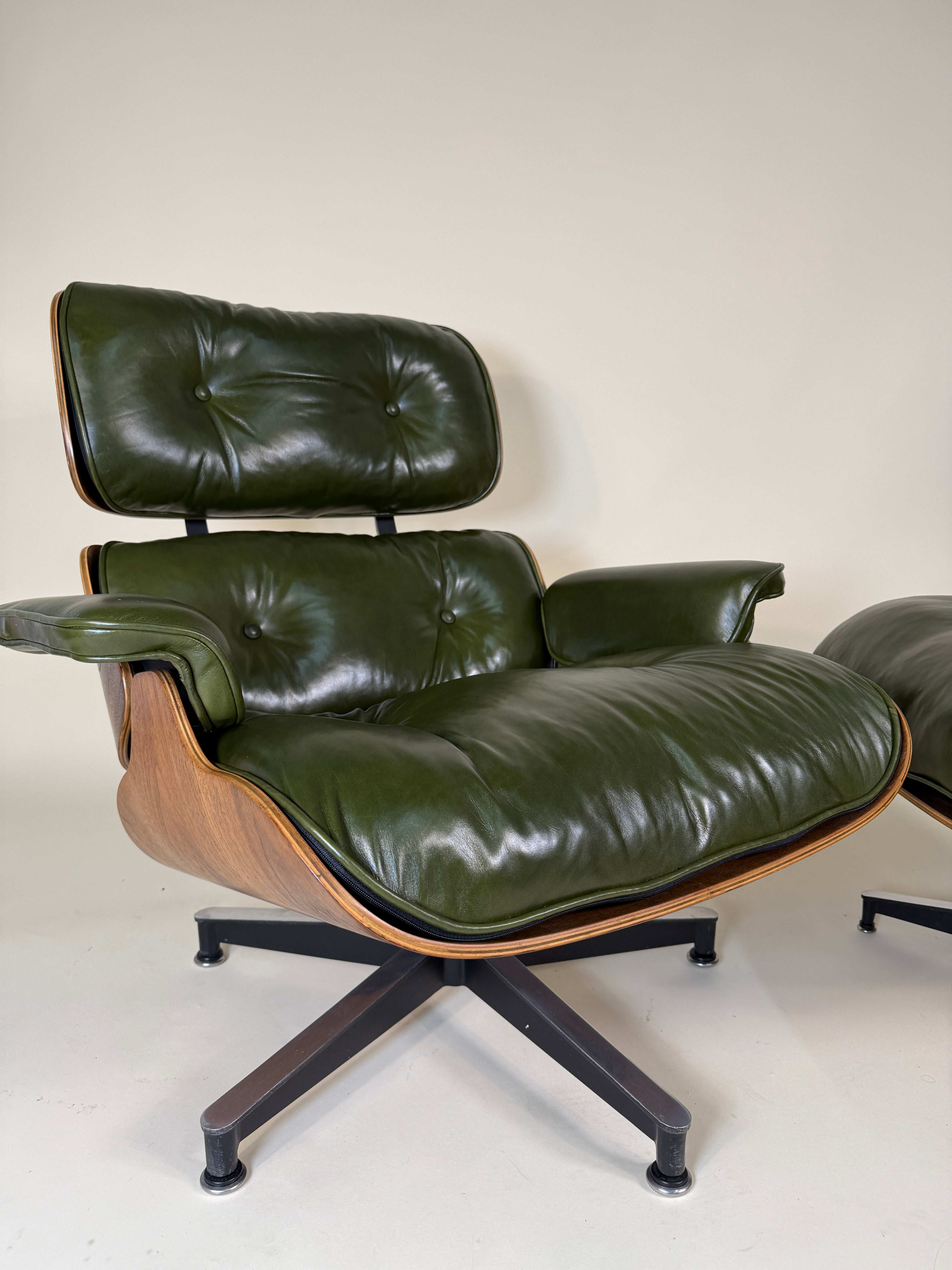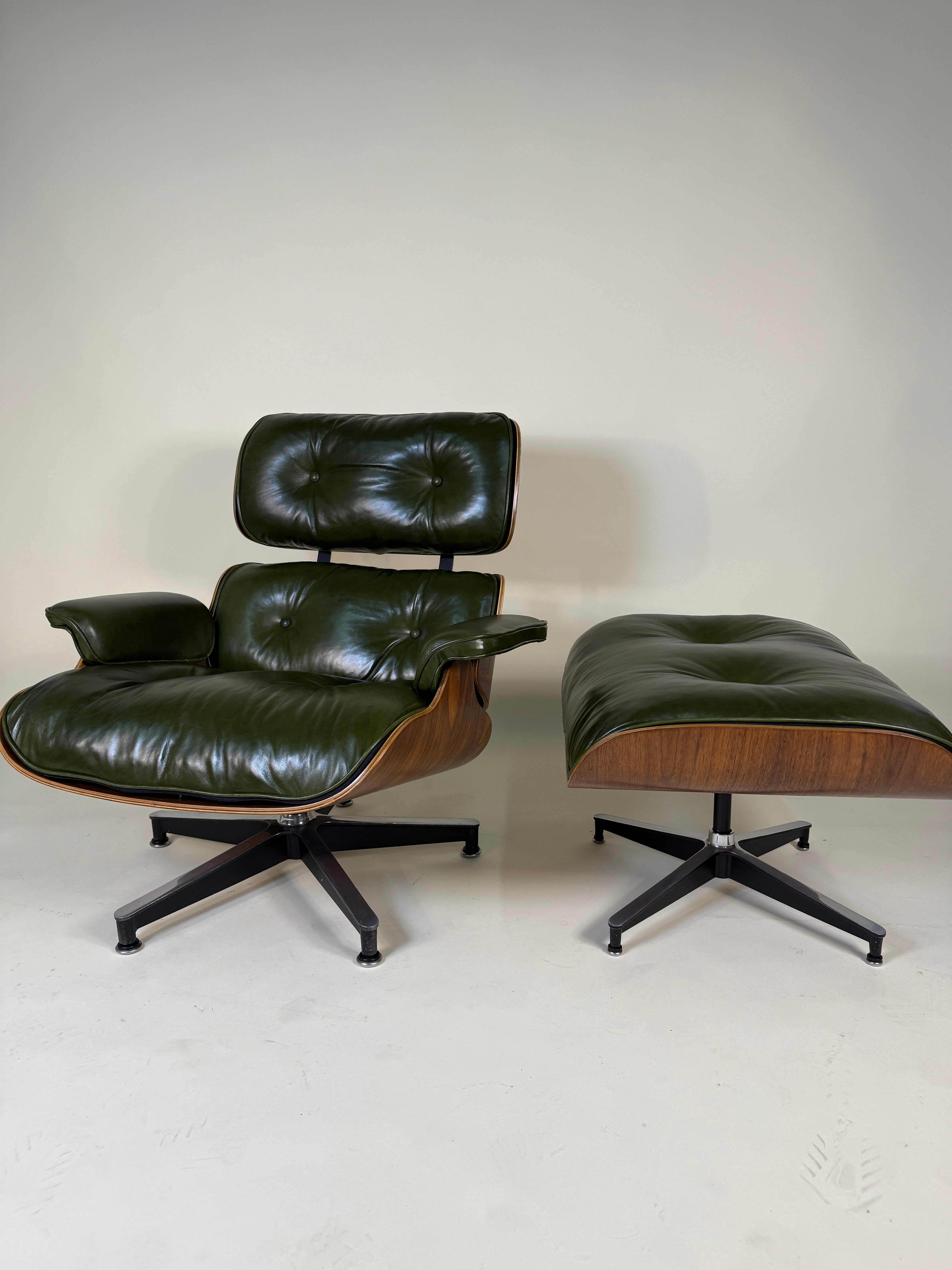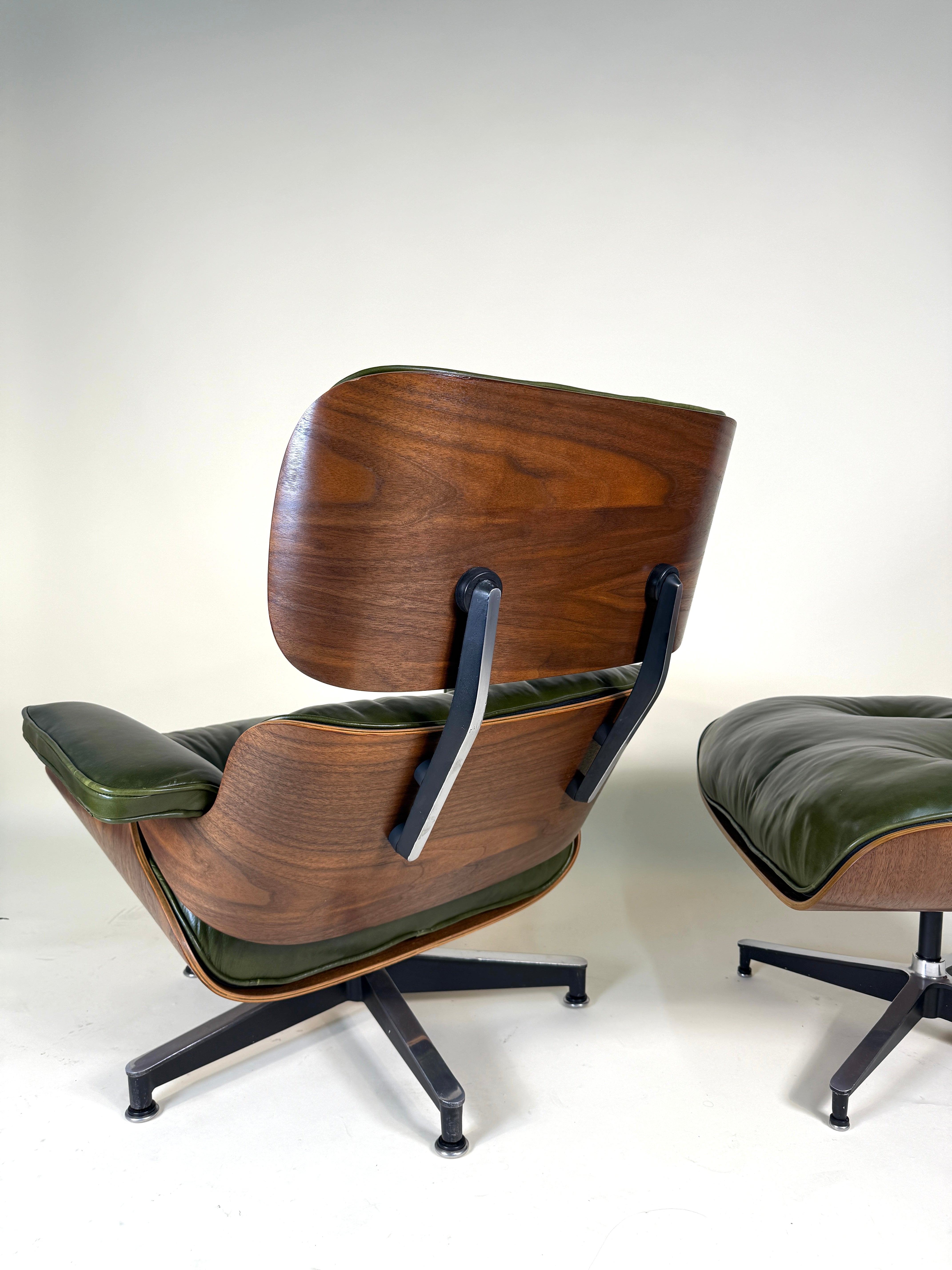 An iconic piece of 20th-century design, this authentic vintage Eames Lounge Chair and Ottoman (model 670/671) is a Second generation set produced in the early 1960s. This particular example is a rare customer ordered Walnut chair. With new, supple "Moss" Green Leather. Richly figured old growth Walnut shells.