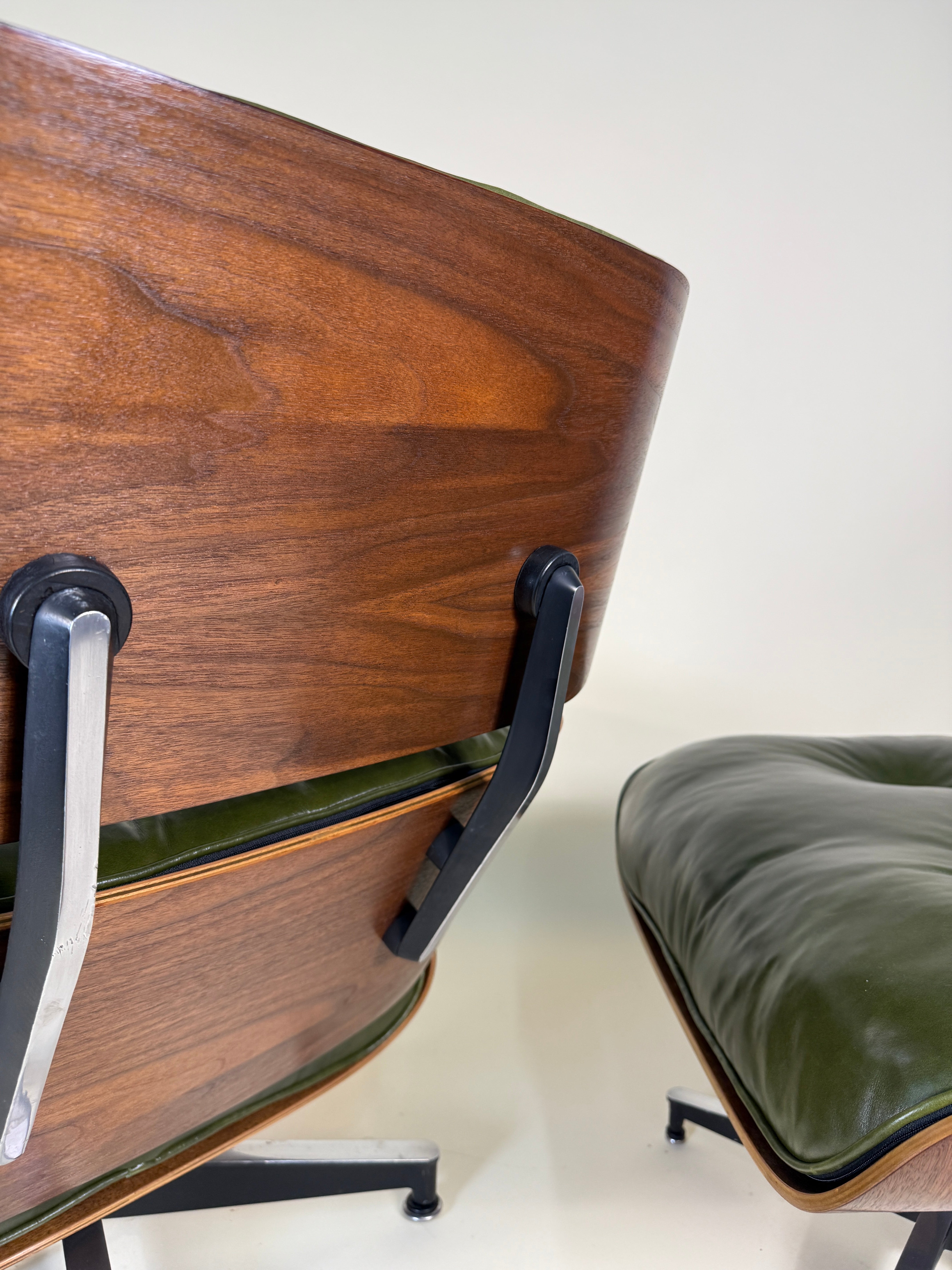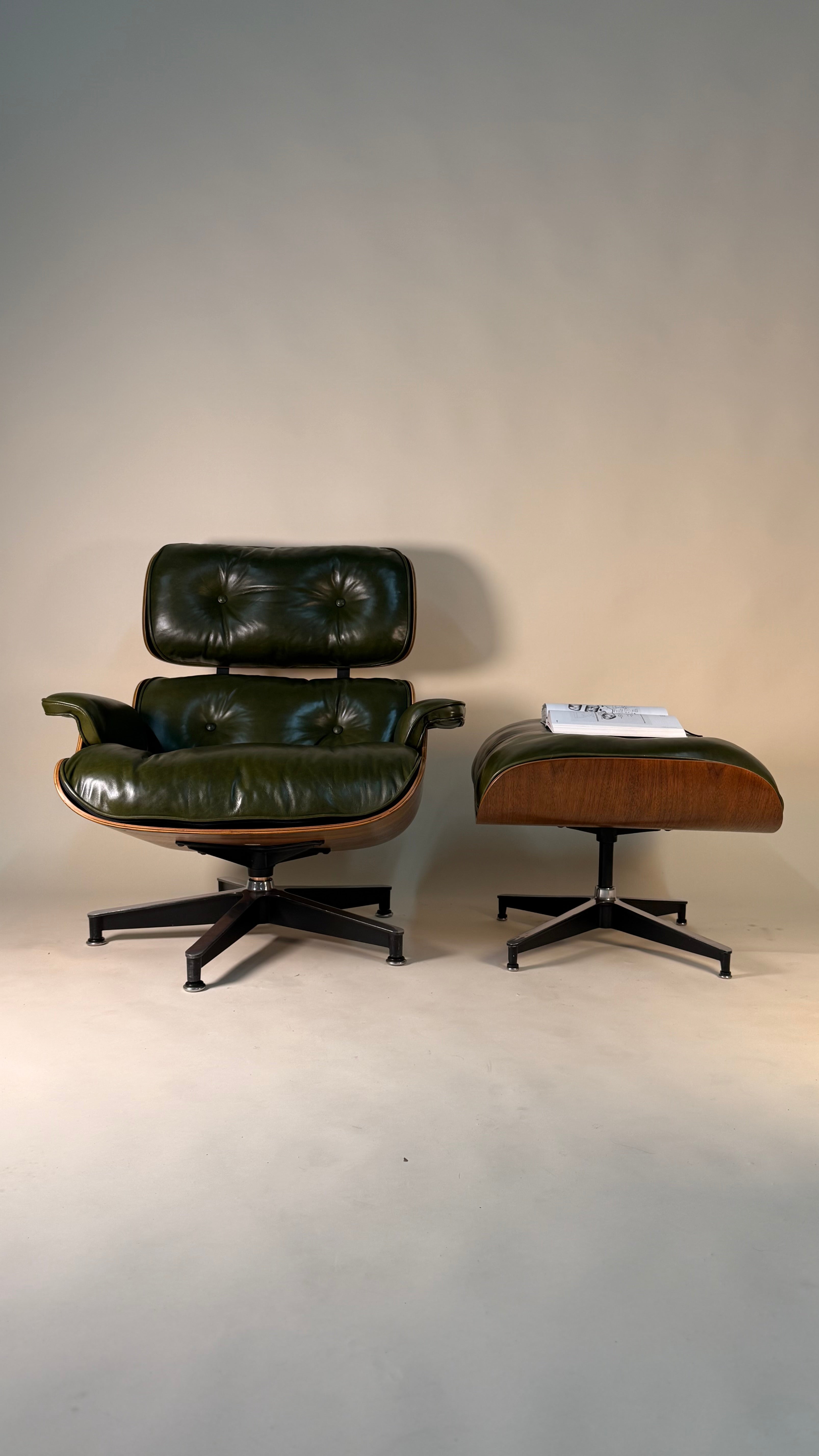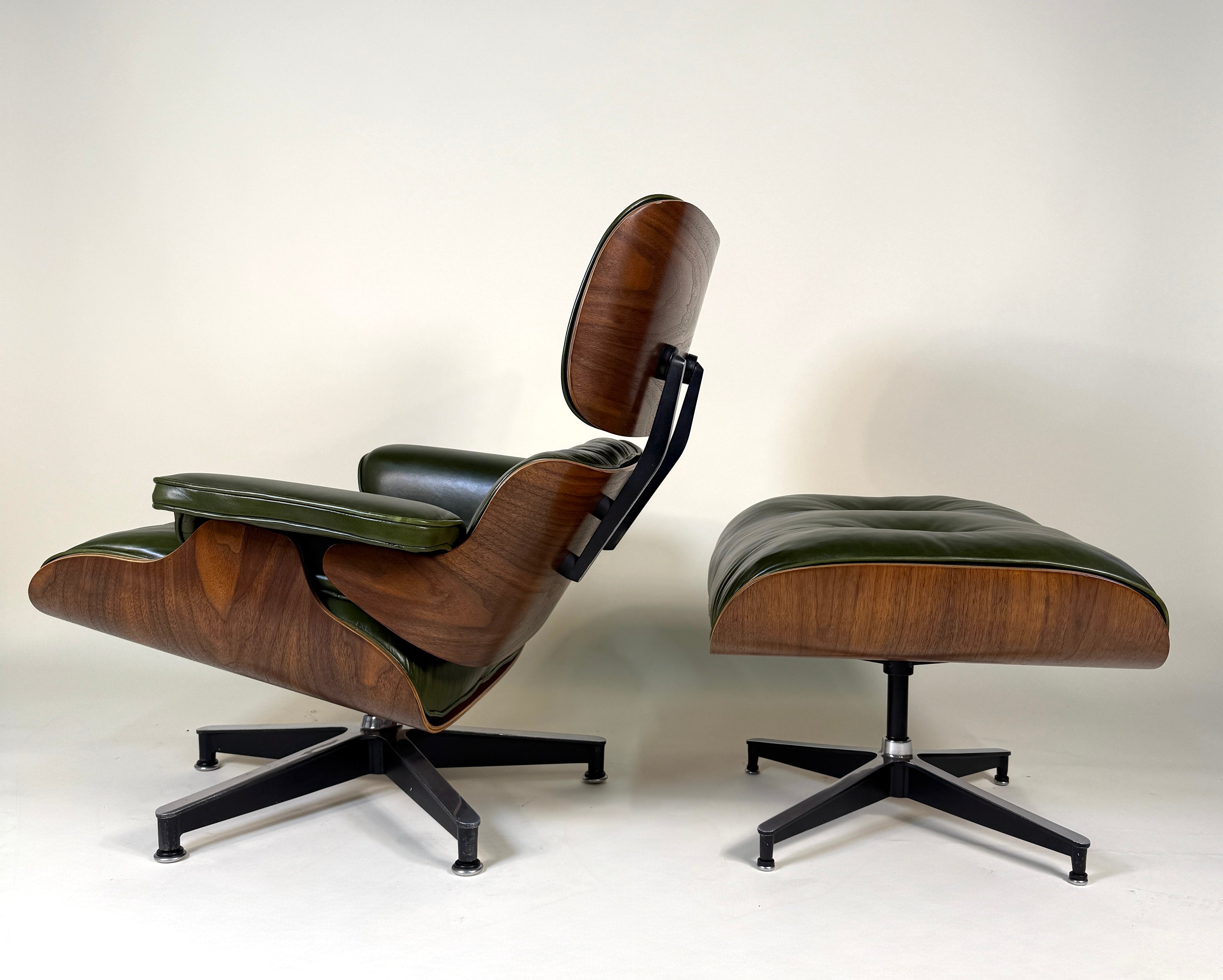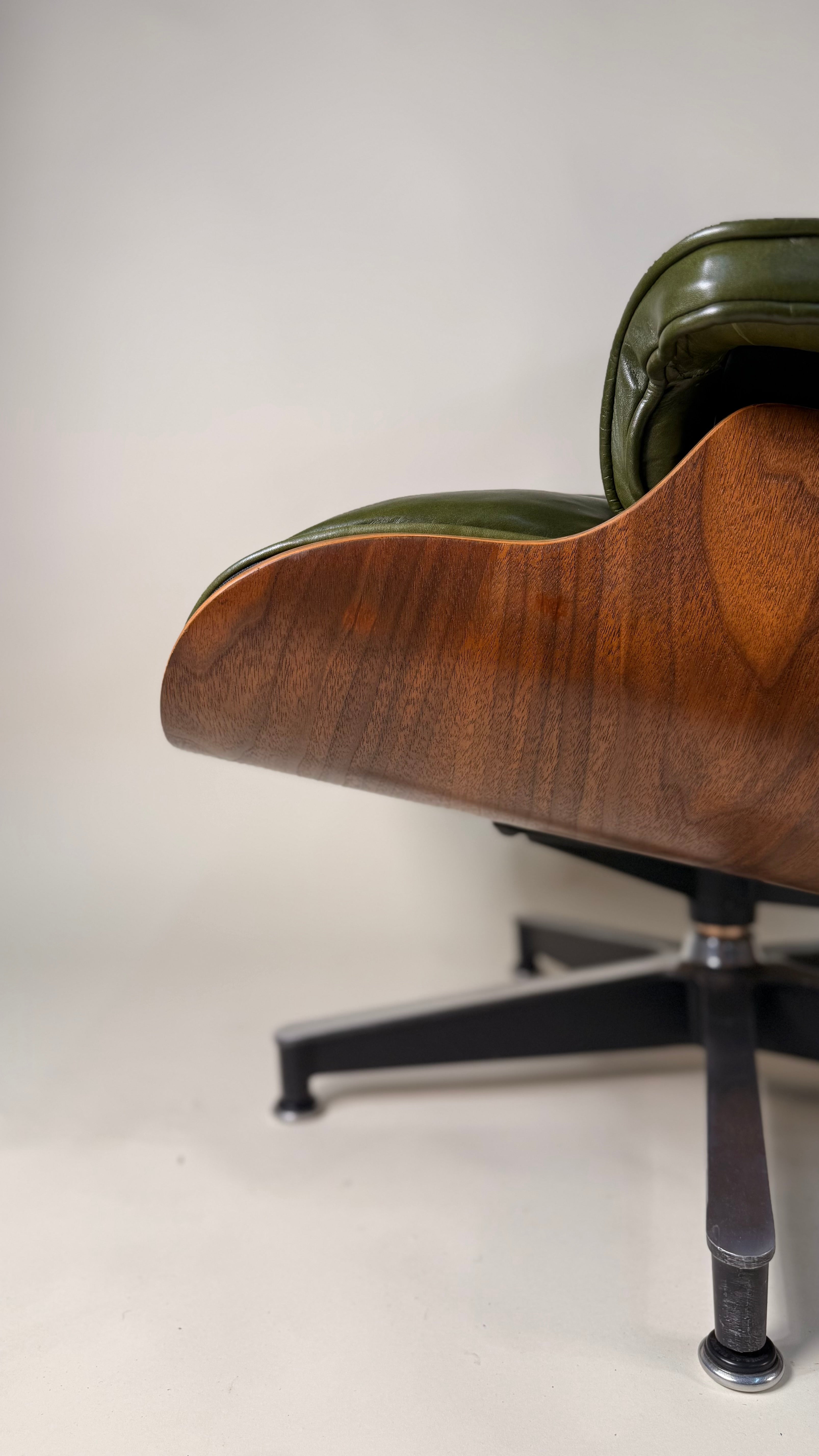 An iconic piece of 20th-century design, this authentic vintage Eames Lounge Chair and Ottoman (model 670/671) is a Second generation set produced in the early 1960s. This particular example is a rare customer ordered Walnut chair. With new, supple "Moss" Green Leather. Richly figured old growth Walnut shells.