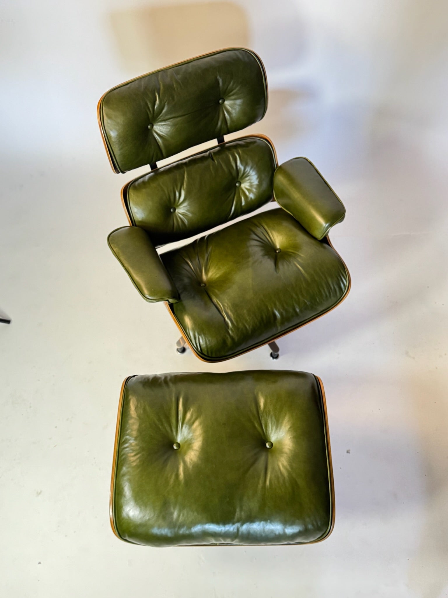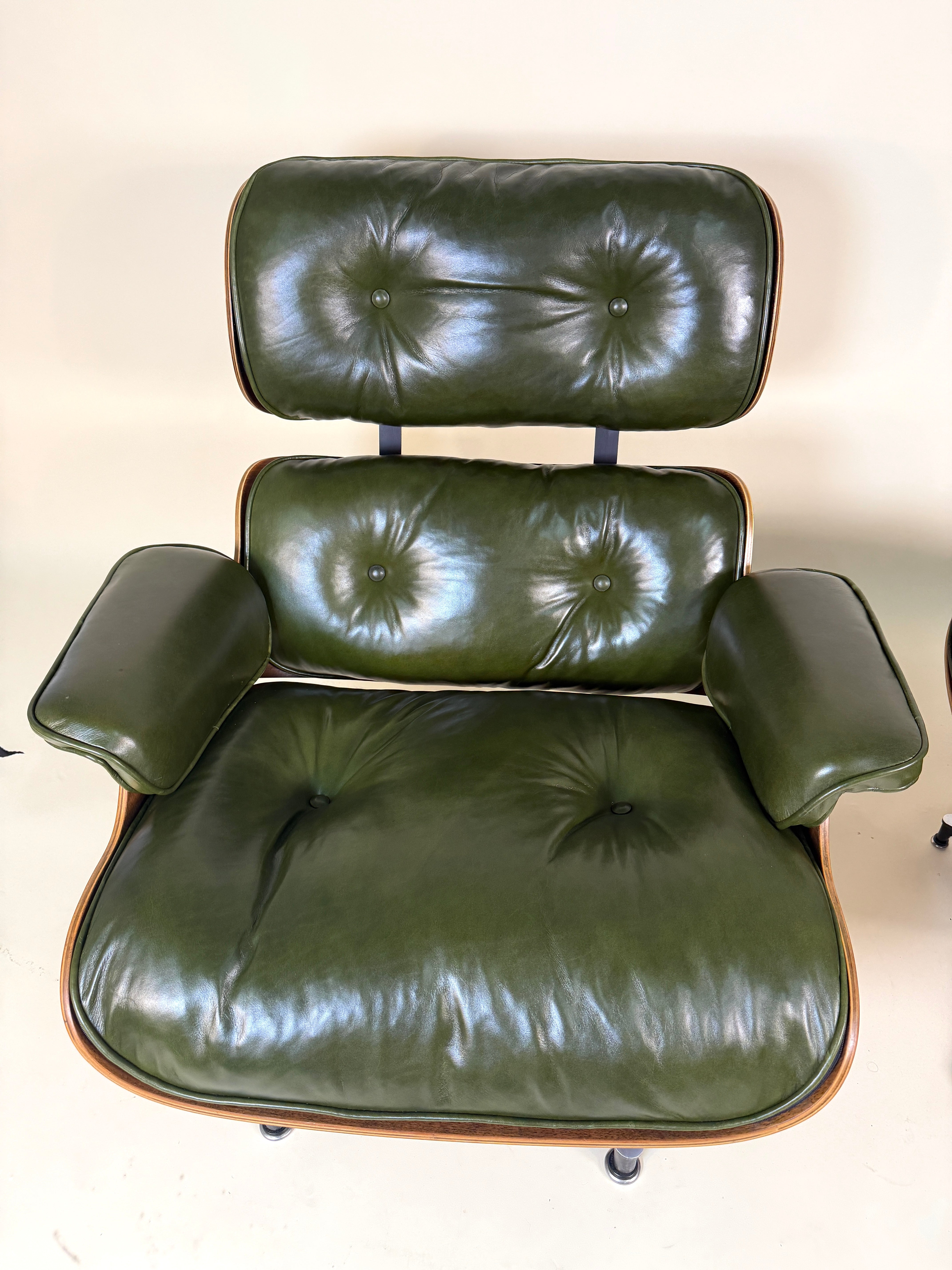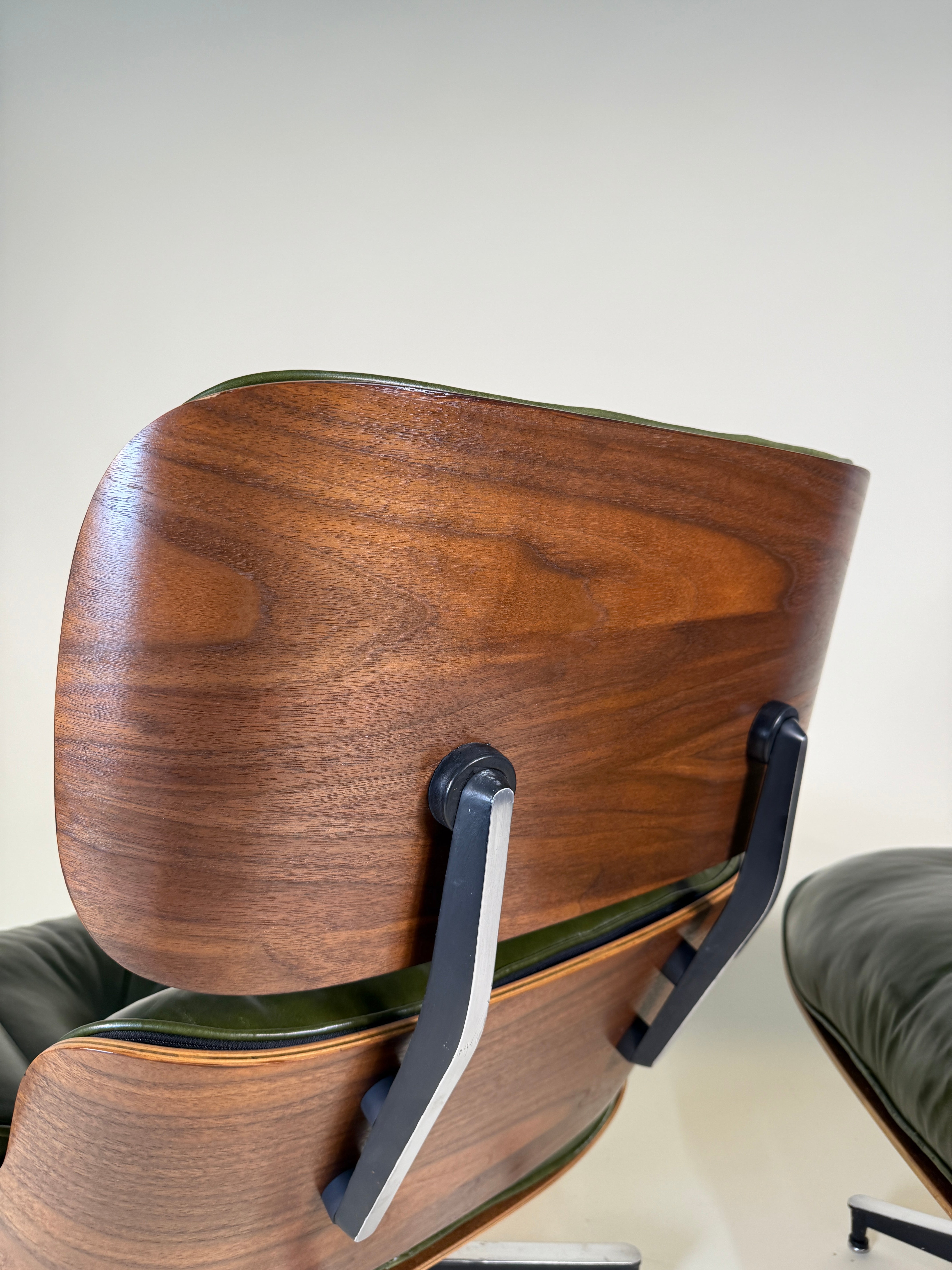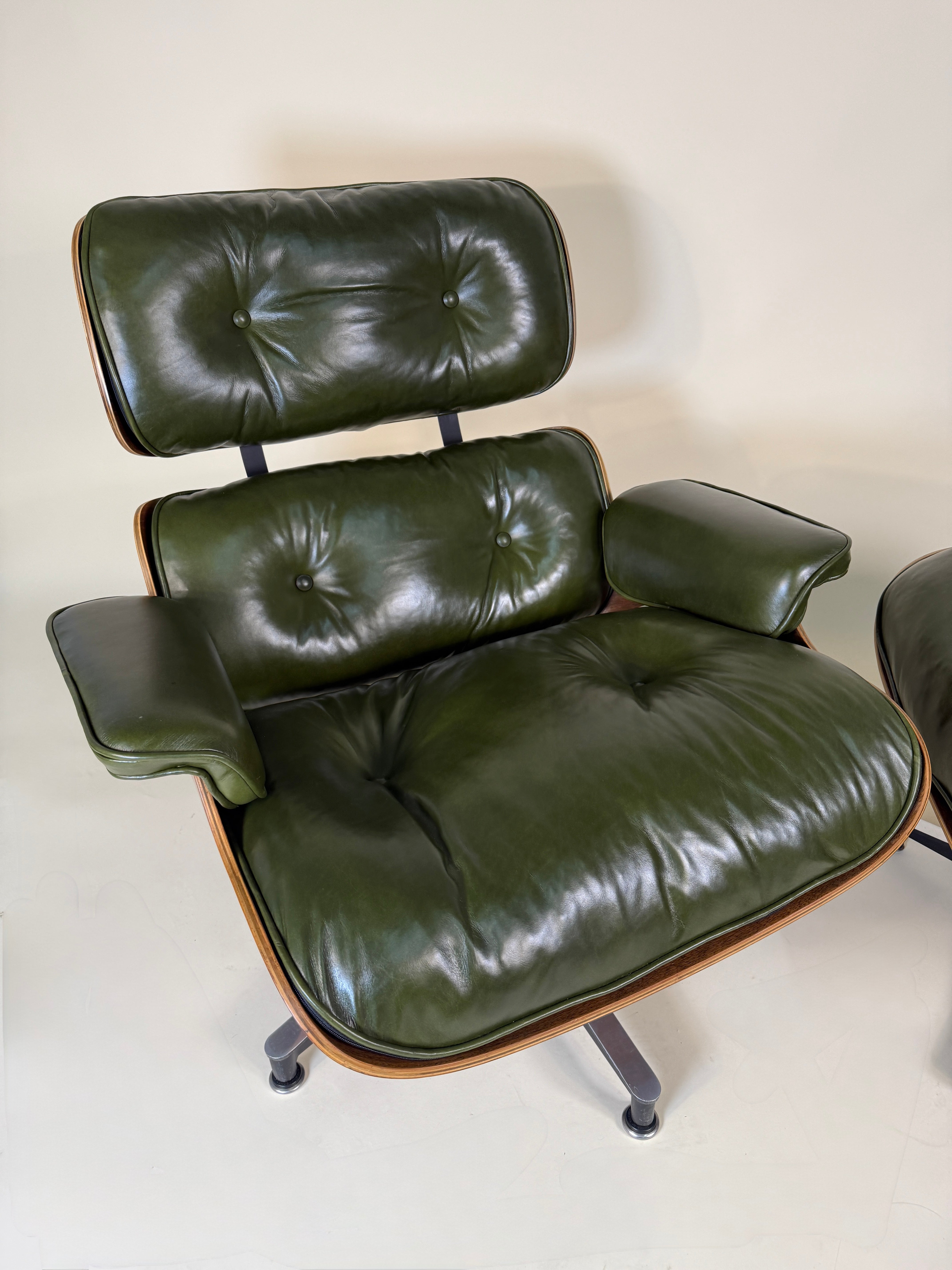 An iconic piece of 20th-century design, this authentic vintage Eames Lounge Chair and Ottoman (model 670/671) is a Second generation set produced in the early 1960s. This particular example is a rare customer ordered Walnut chair. With new, supple "Moss" Green Leather. Richly figured old growth Walnut shells.