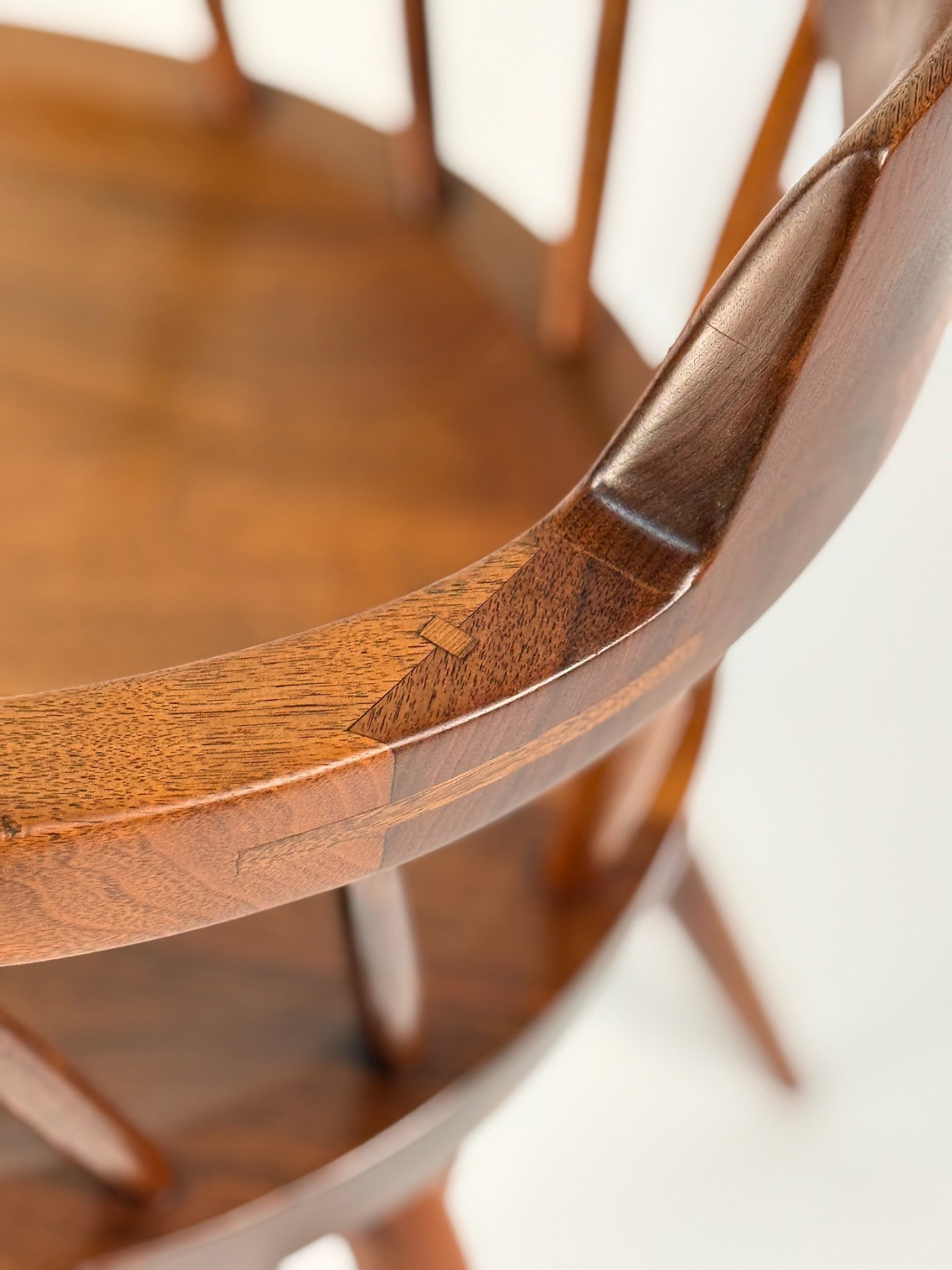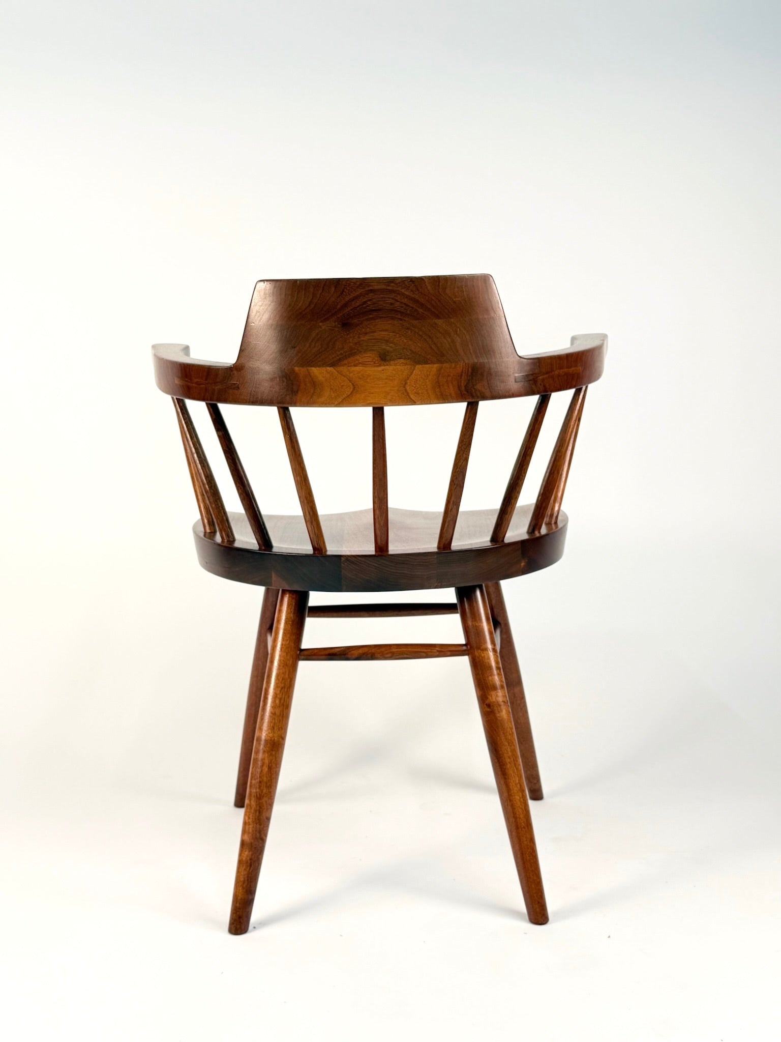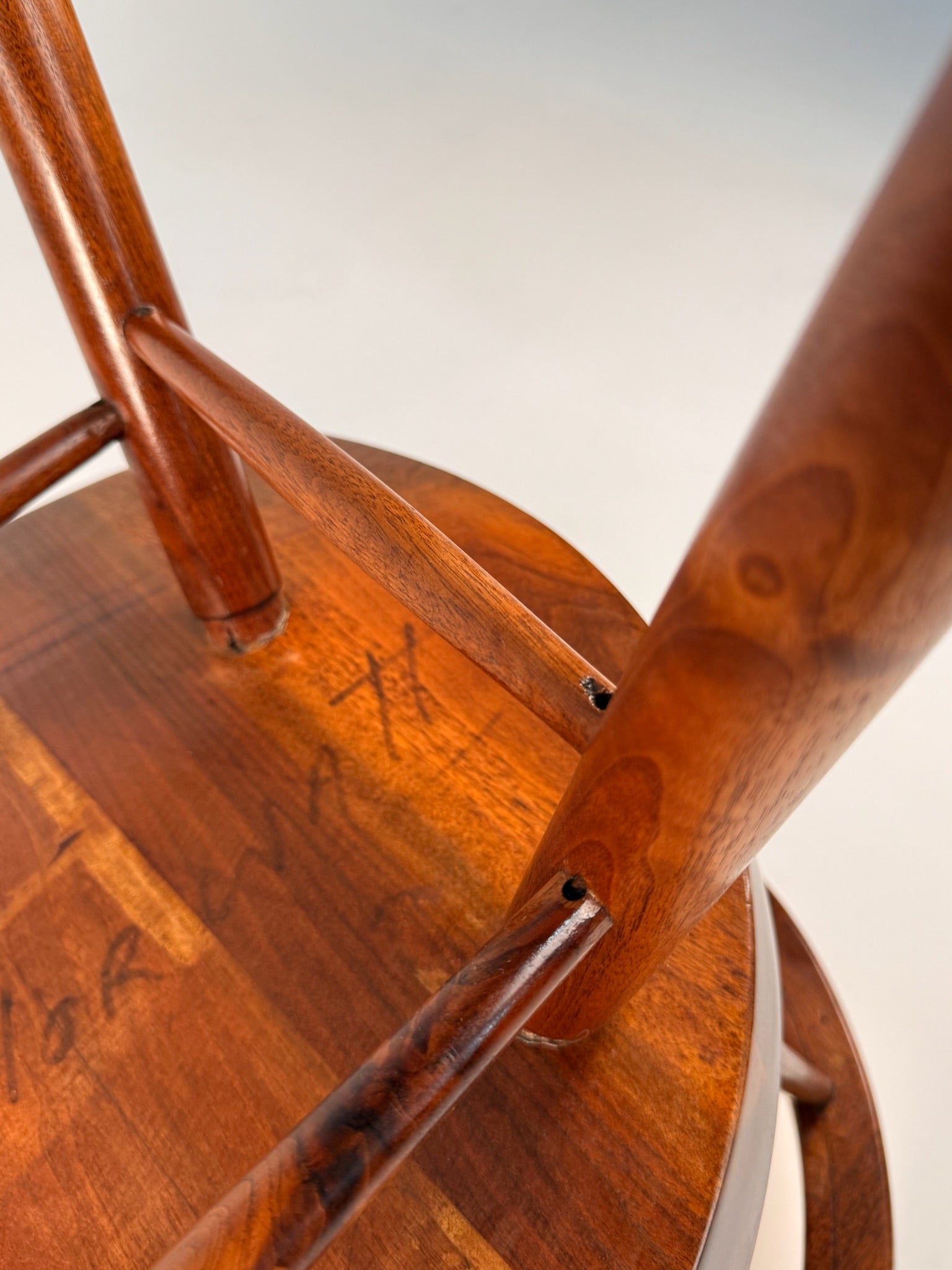 The sculpted armrests are a technical marvel—complex joinery joins the curved arms seamlessly into the backrest, revealing Nakashima’s mastery of structure and subtle angles. Each spindle hand-carved, showing slight variation and organic shaping that speaks to the human hand. Faint pencil markings remain throughout, especially at the spindle joints—traces of the meticulous layout and care taken during its original construction.