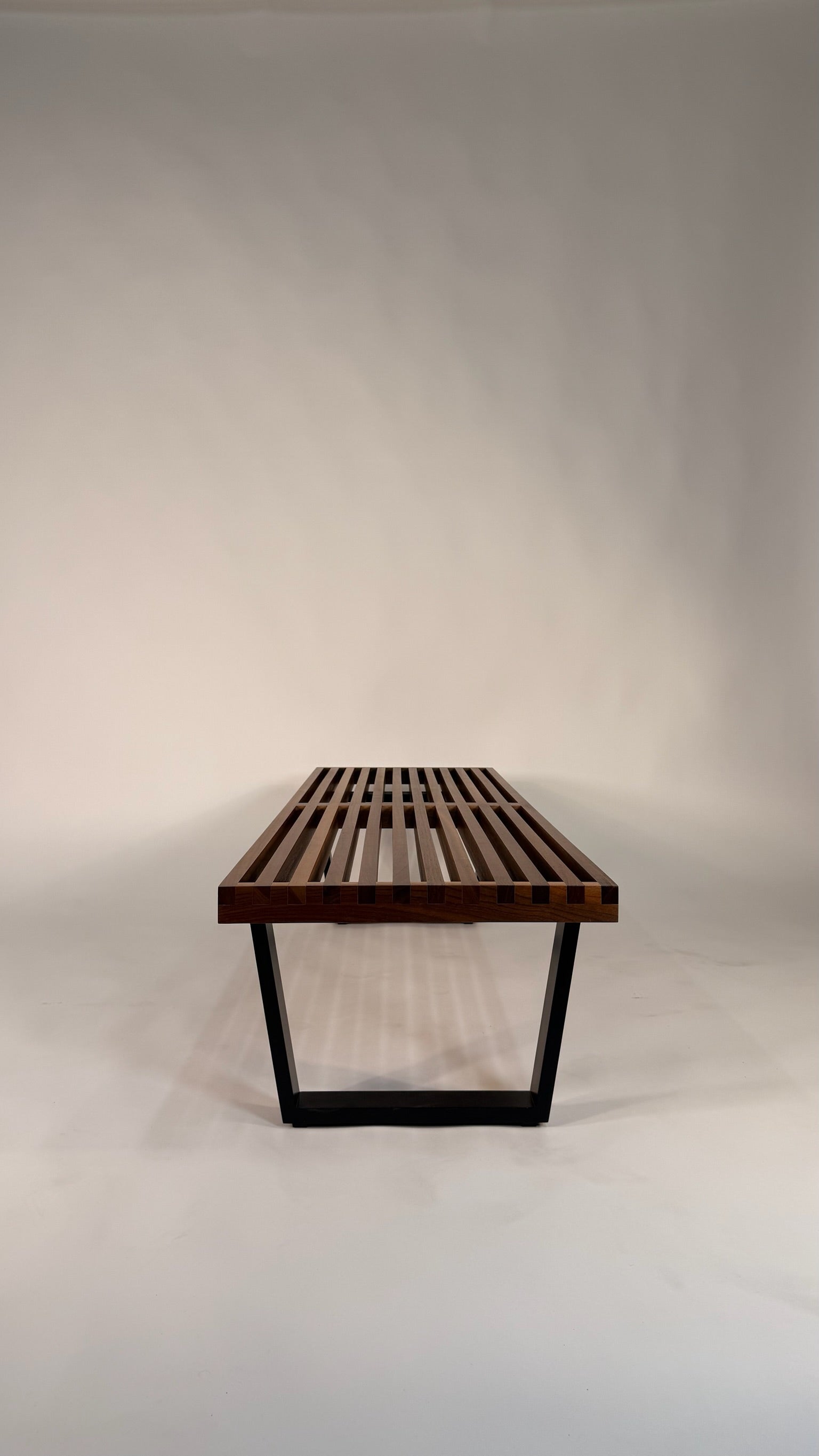 An iconic piece of American design, this George Nelson Platform Bench combines clean lines, natural materials, and timeless craftsmanship. Designed in 1946 by legendary mid‑century designer George Nelson for Herman Miller, this classic slat bench features a beautifully grained walnut top paired with a crisp black lacquered ebonized base.