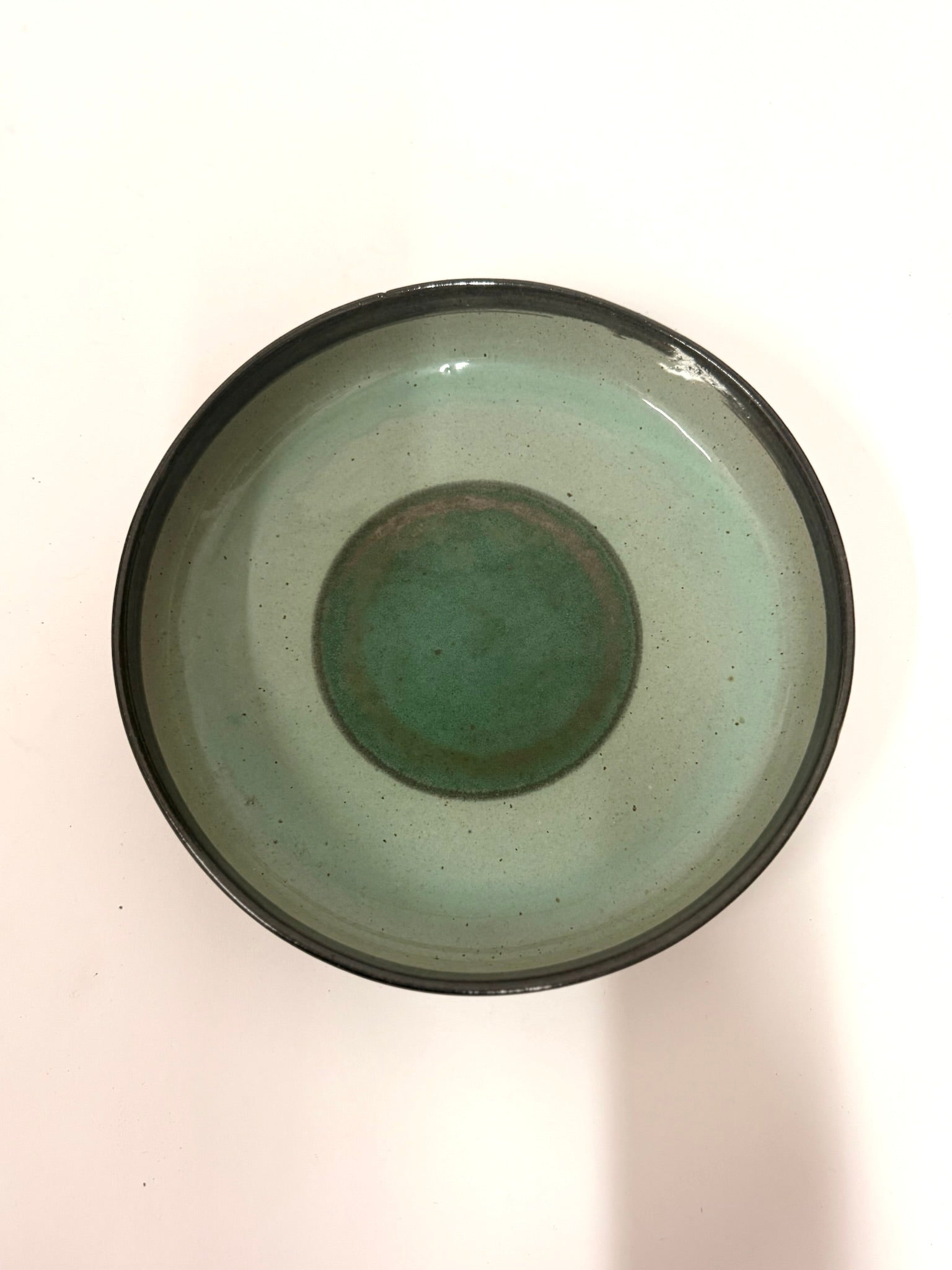 This beautiful Mid-Century Modern decorative dish by Gordon and Jane Martz for Marshall Studios showcases their signature artistry in ceramic glazes. The piece features a striking combination of soft green and deeper green hues, accented with an iridescent shimmer at the center that changes beautifully in the light. The subtle tonal variations give the dish a rich, handcrafted character typical of the Martz aesthetic.