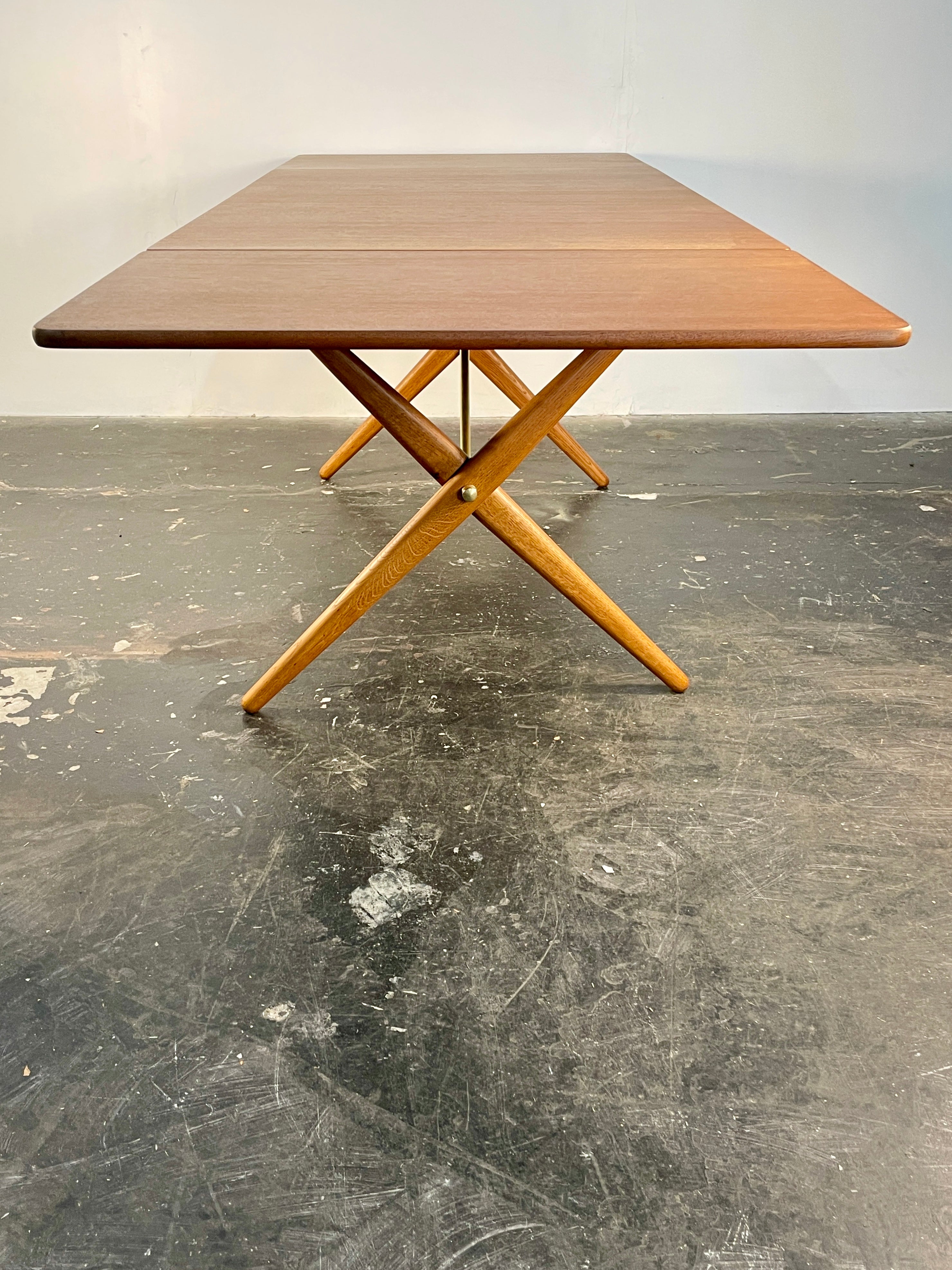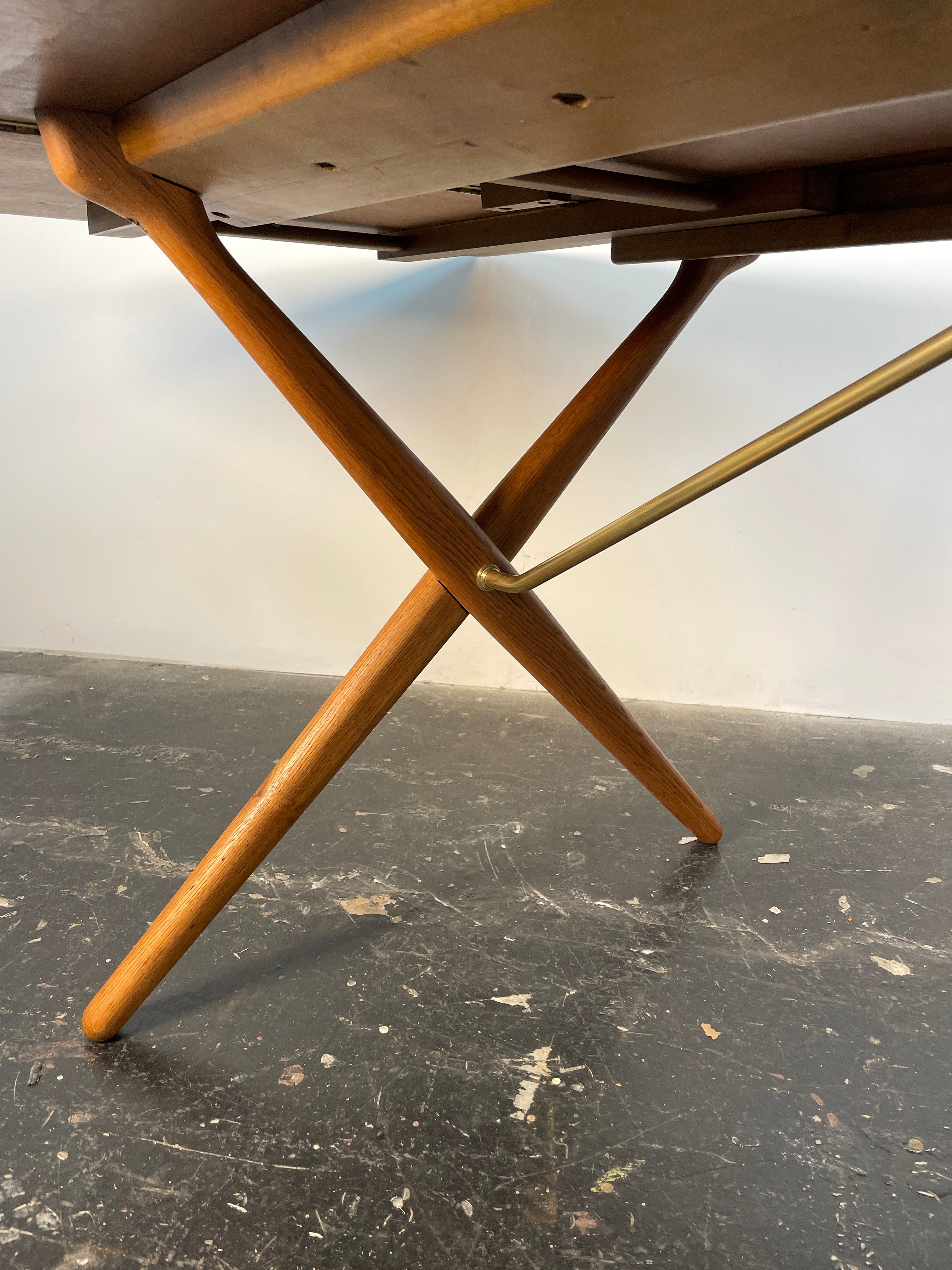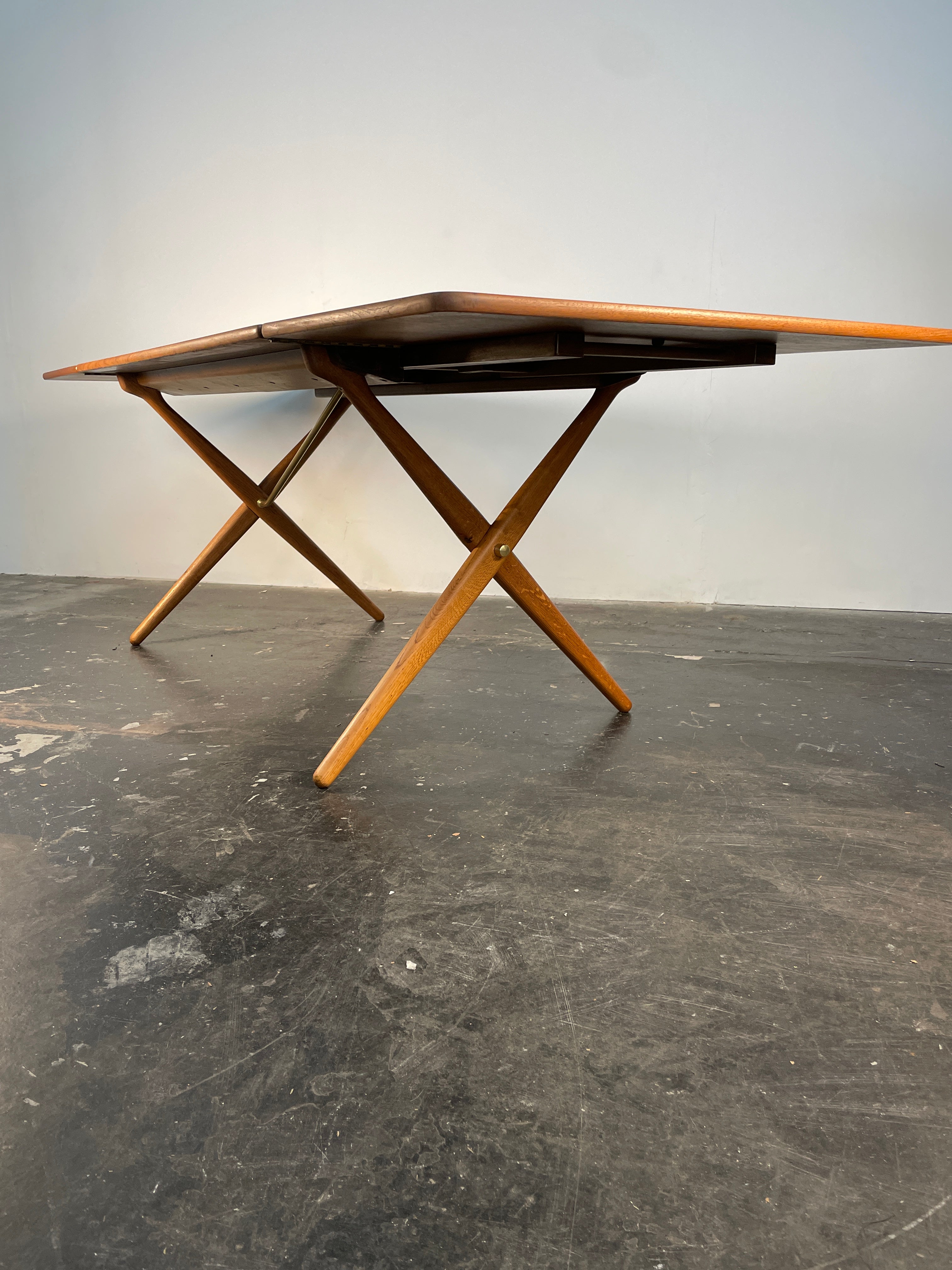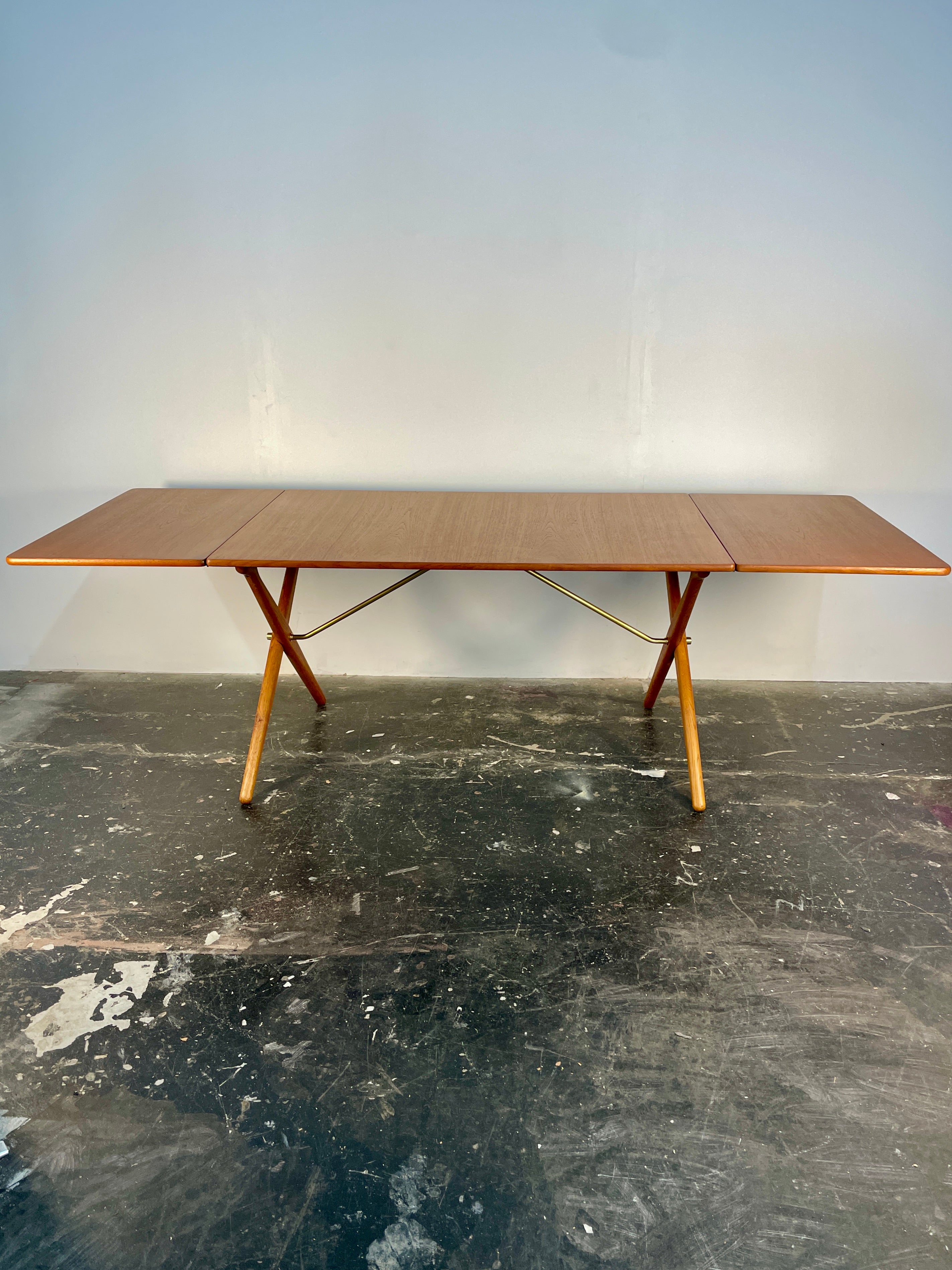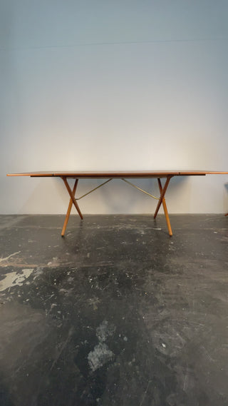 The “AT-309” model is also commonly referred to as the “saw-horse” for its trestle base. In woodworking, a saw-horse is a trestle structure used to support a board similarly to this model’s case. While Hans J. Wegner became world-renowned for his chairs, he also designed a broad range of tables, where he was just as thorough and artistic about the proportions, construction, function, and style. With a clear statement of simplicity, quality and respect for materials, this table is a great example of Danish Modern design. The massive teak tabletop with drop-leafs is stunning on its own, showcasing the wood’s grain and offering plenty of space with the extendable solution. However, to Wegner, the most important part of his tables was not the top, but rather what was underneath. For the supporting structure he used the distinctive saw-horse look with crossed legs and brass braces. The diagonal brass reinforcement is not only a significant structural feature, it is also a visually appealing detail that gives character to this dining table. Looking beneath the top, the elaborate oak structure becomes visible, showing both Wegner’s and the manufacturer’s expert skill and knowledge.