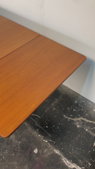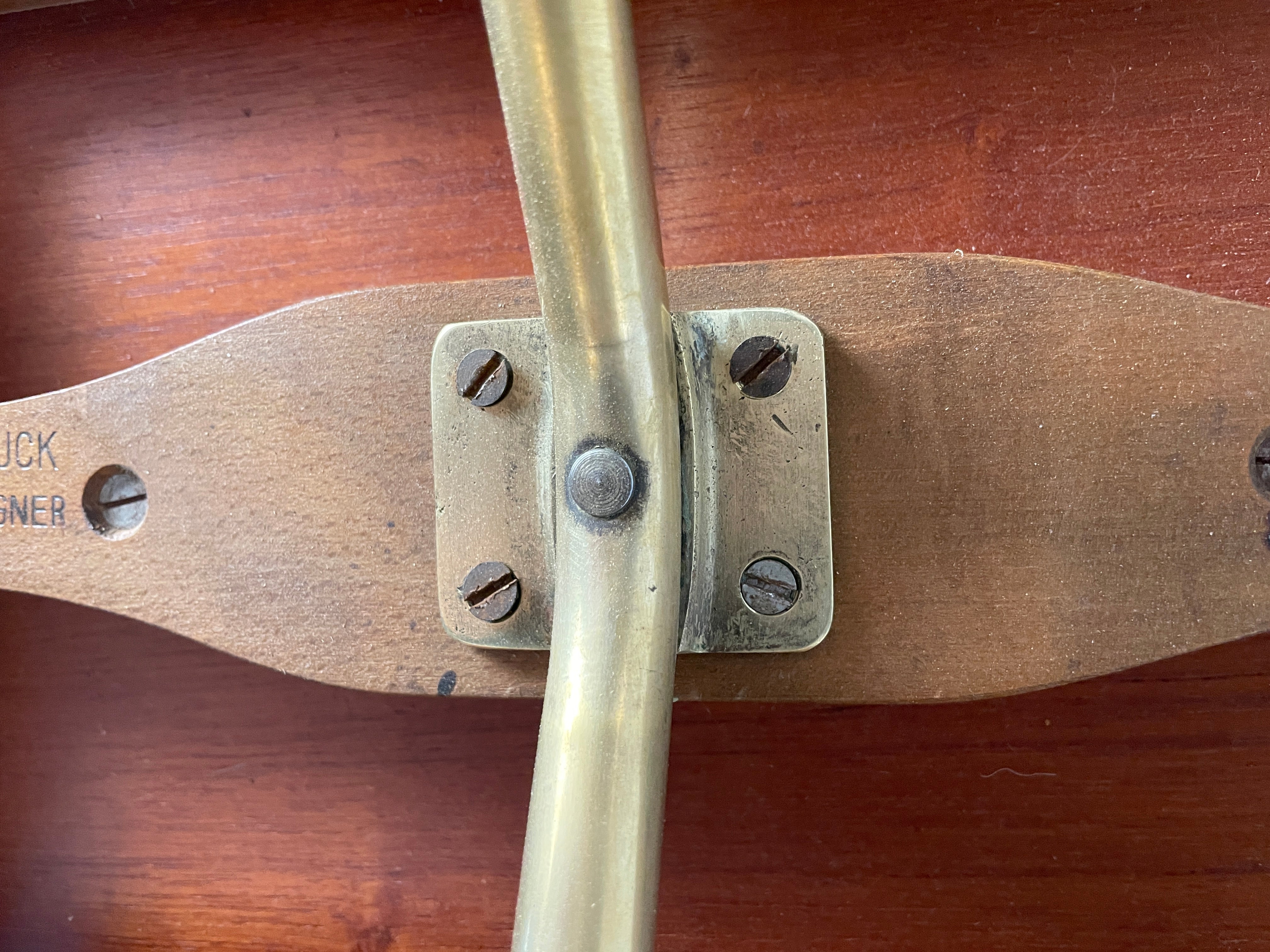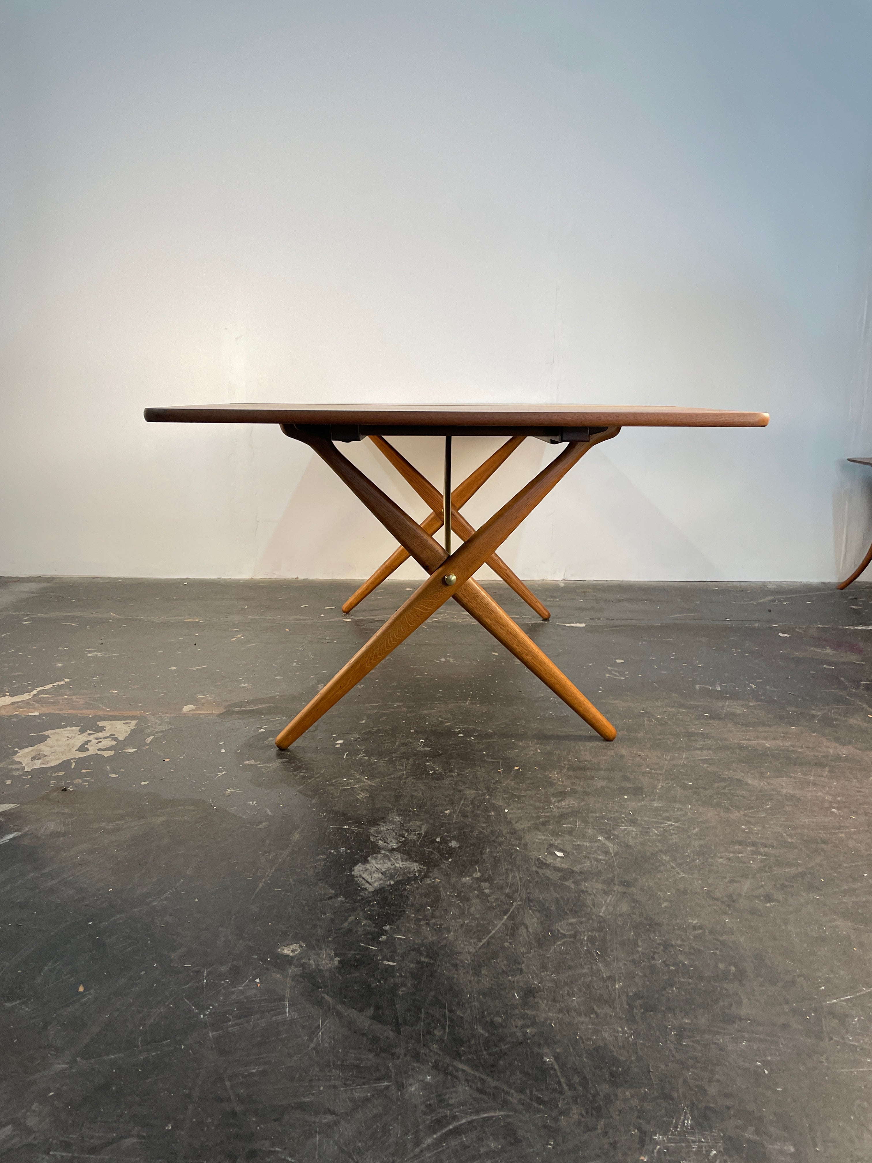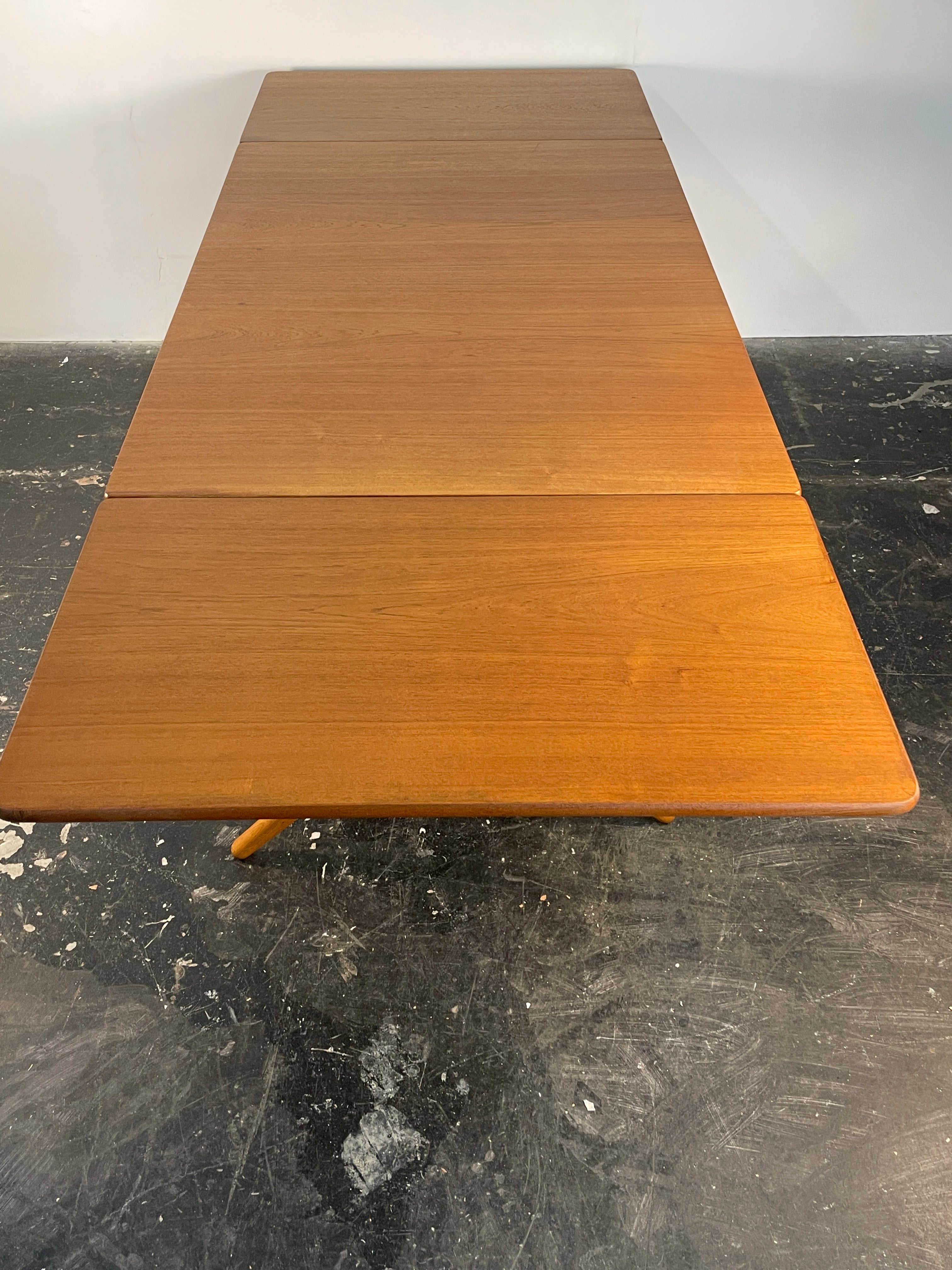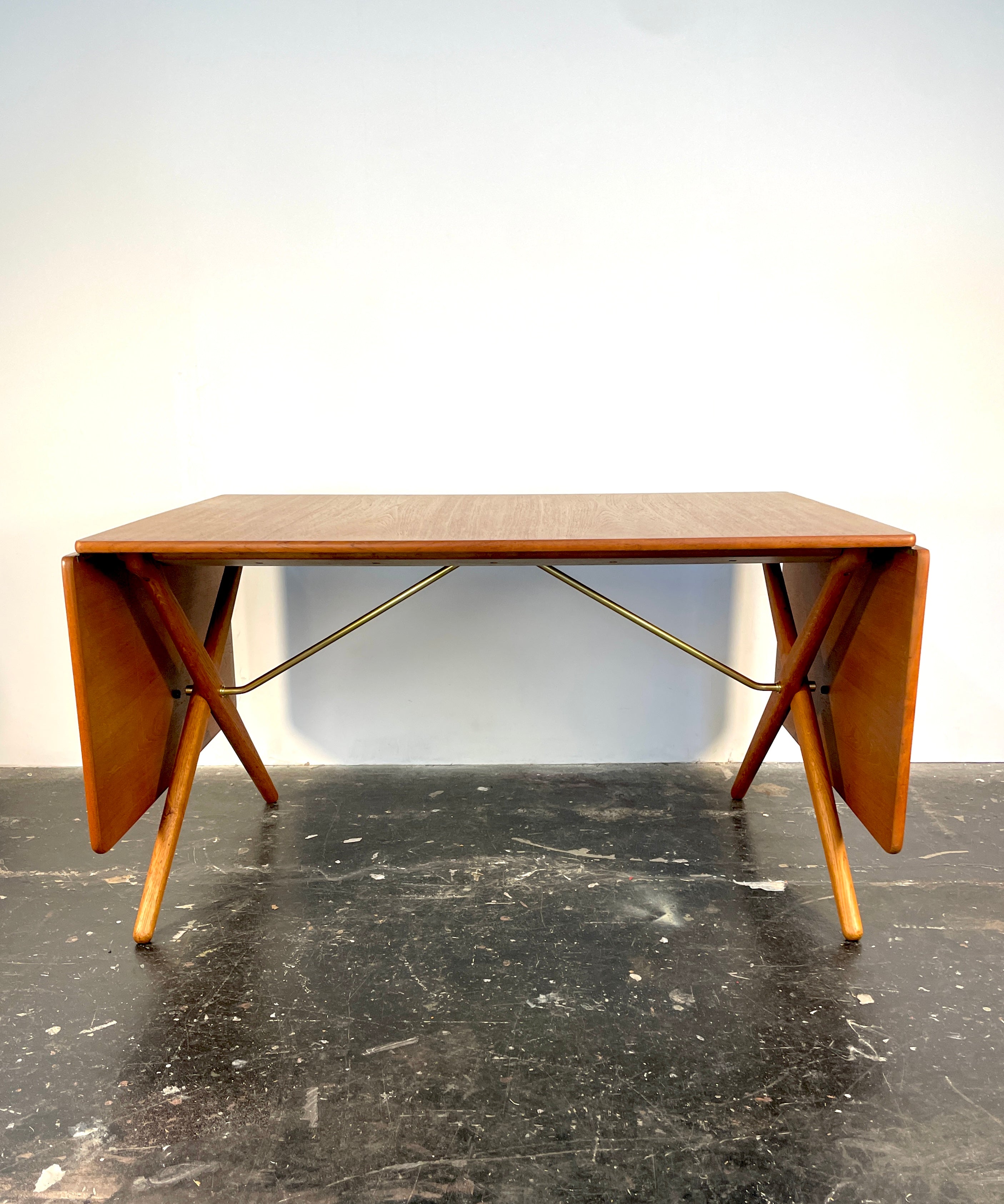 The “AT-309” model is also commonly referred to as the “saw-horse” for its trestle base. In woodworking, a saw-horse is a trestle structure used to support a board similarly to this model’s case. While Hans J. Wegner became world-renowned for his chairs, he also designed a broad range of tables, where he was just as thorough and artistic about the proportions, construction, function, and style. With a clear statement of simplicity, quality and respect for materials, this table is a great example of Danish Modern design. The massive teak tabletop with drop-leafs is stunning on its own, showcasing the wood’s grain and offering plenty of space with the extendable solution. However, to Wegner, the most important part of his tables was not the top, but rather what was underneath. For the supporting structure he used the distinctive saw-horse look with crossed legs and brass braces. The diagonal brass reinforcement is not only a significant structural feature, it is also a visually appealing detail that gives character to this dining table. Looking beneath the top, the elaborate oak structure becomes visible, showing both Wegner’s and the manufacturer’s expert skill and knowledge.