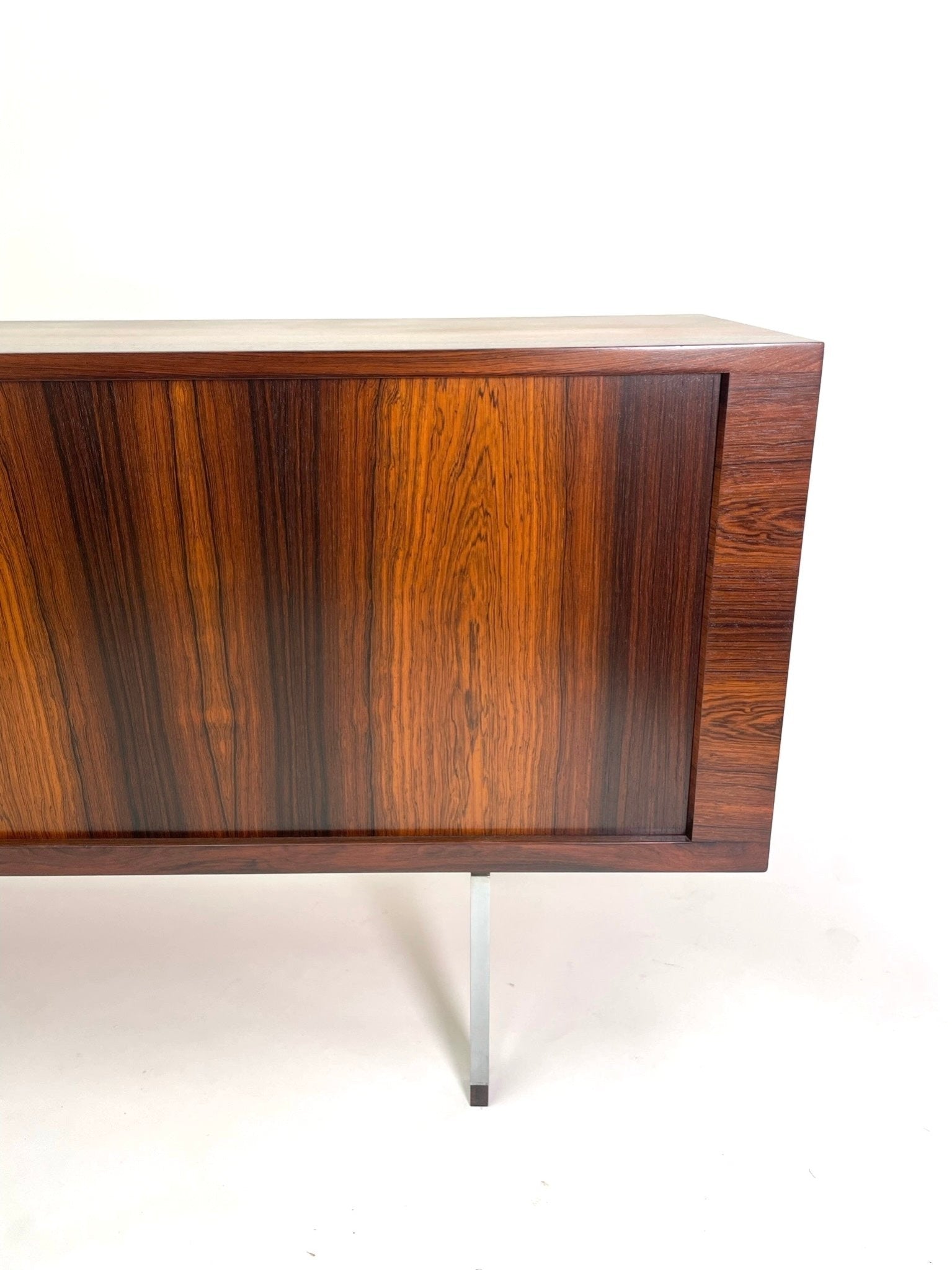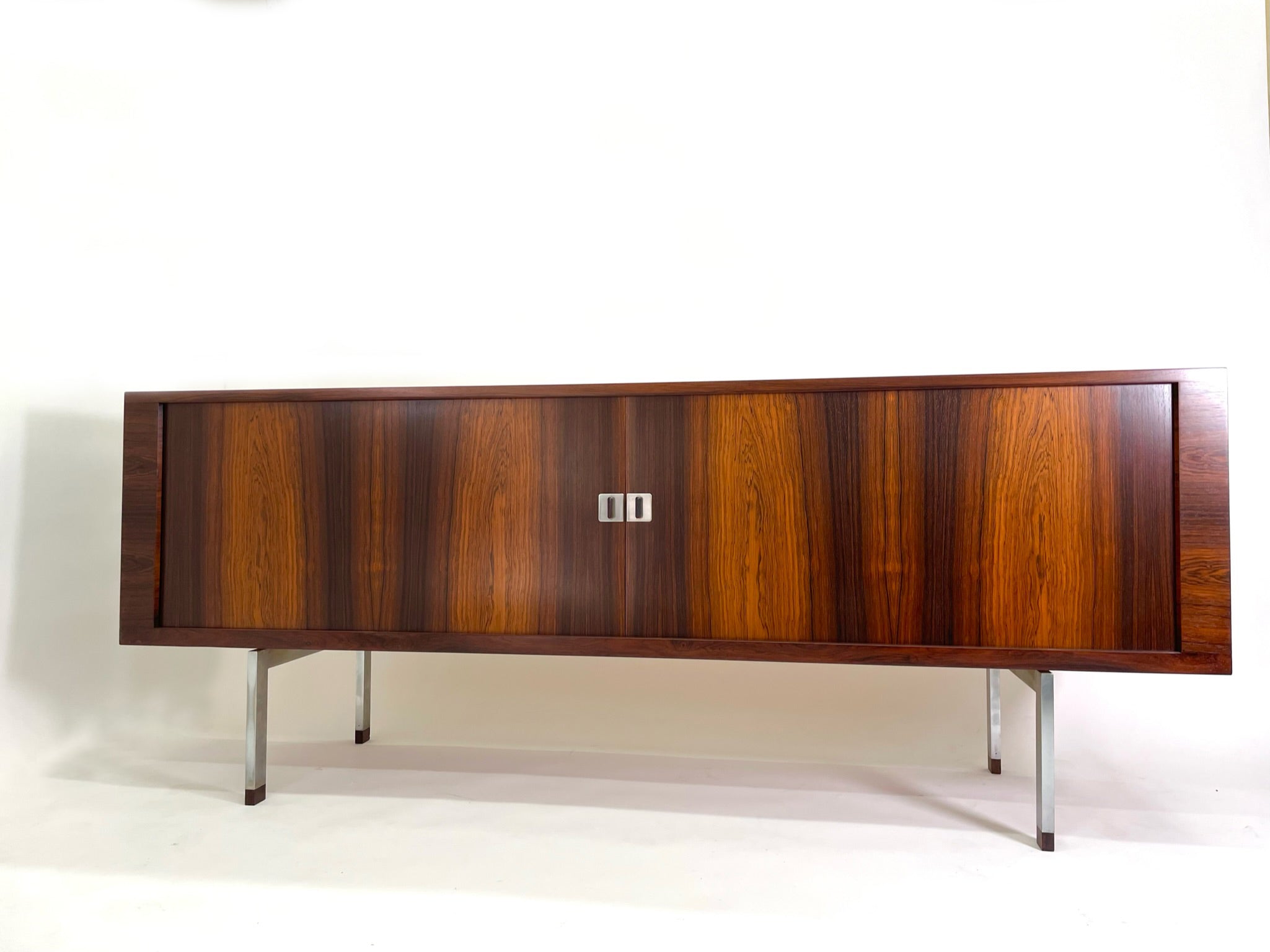 • The rarest and most sophisticated credenza designed by the master of Danish Modern design in Brazilian rosewood and white oak on brushed stainless steel legs capped in solid rosewood. 4 adjustable drawers and shelves and ultra smooth tambour doors that are so finely made that when closed the door looks like solid wood. This stunning credenza from features exquisitely book-matched wood grain. Stamped by Ry Mรธblerย  A fine example of Danish Modern design for the discerning collector. This case piece hasย been completely restored and is in excellent condition. The pictures do not do this credenza justice.ย