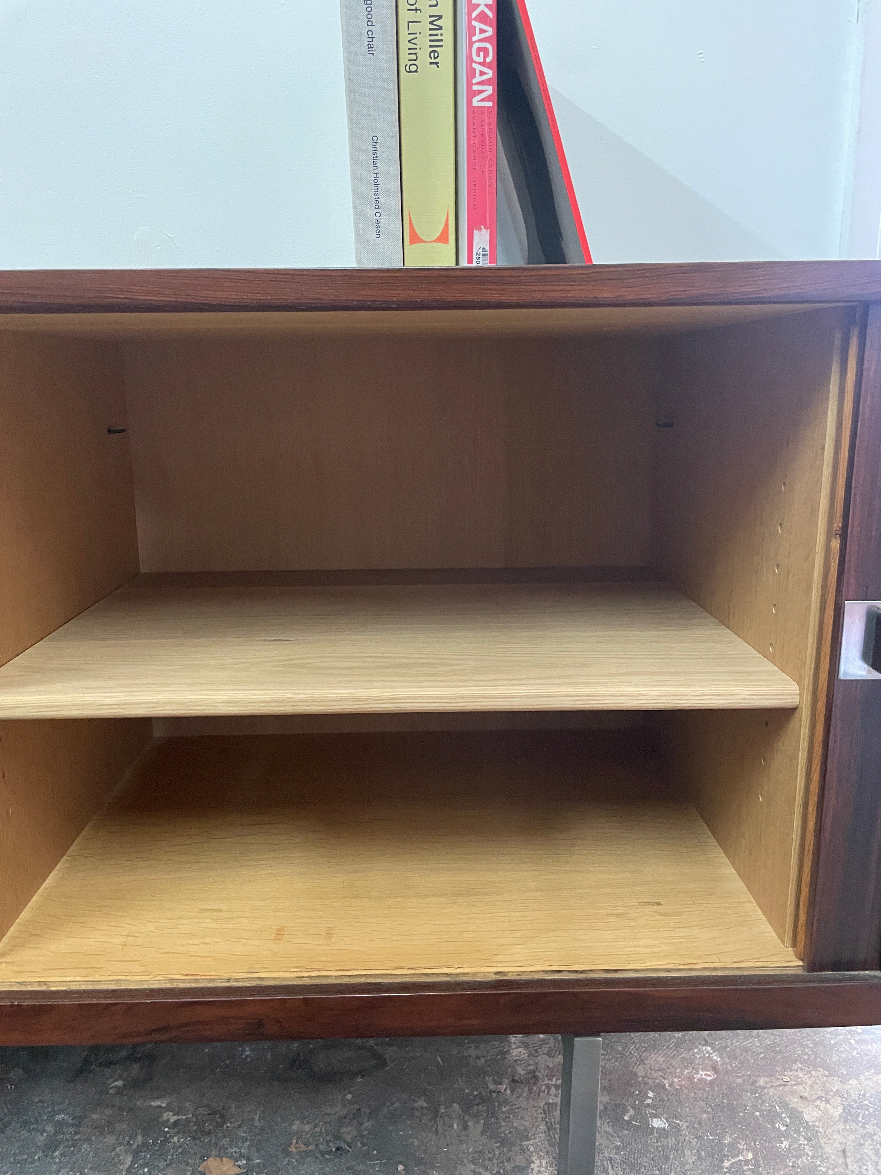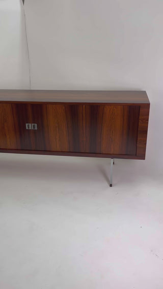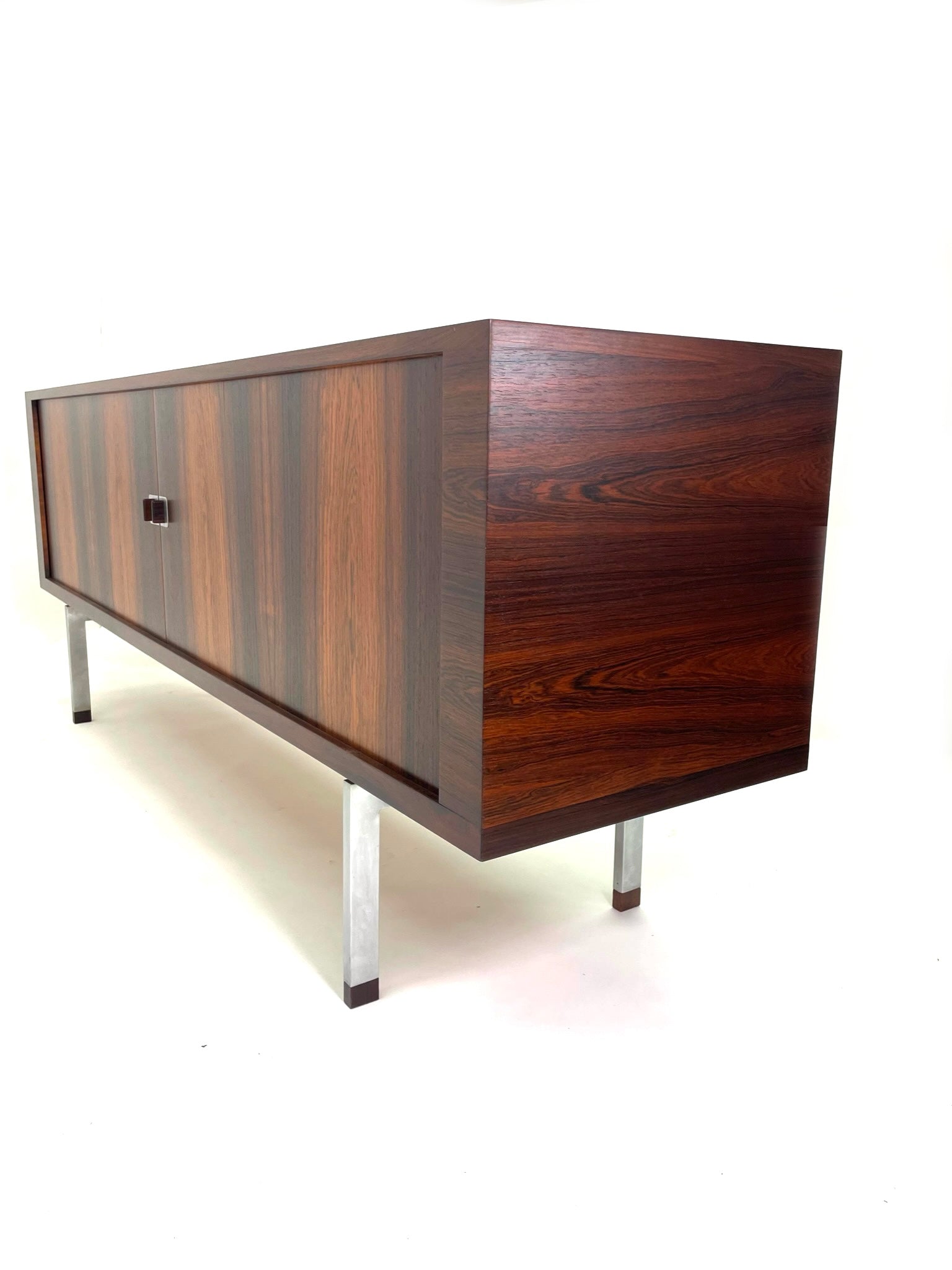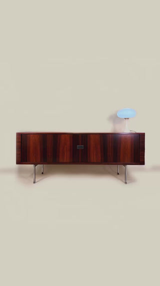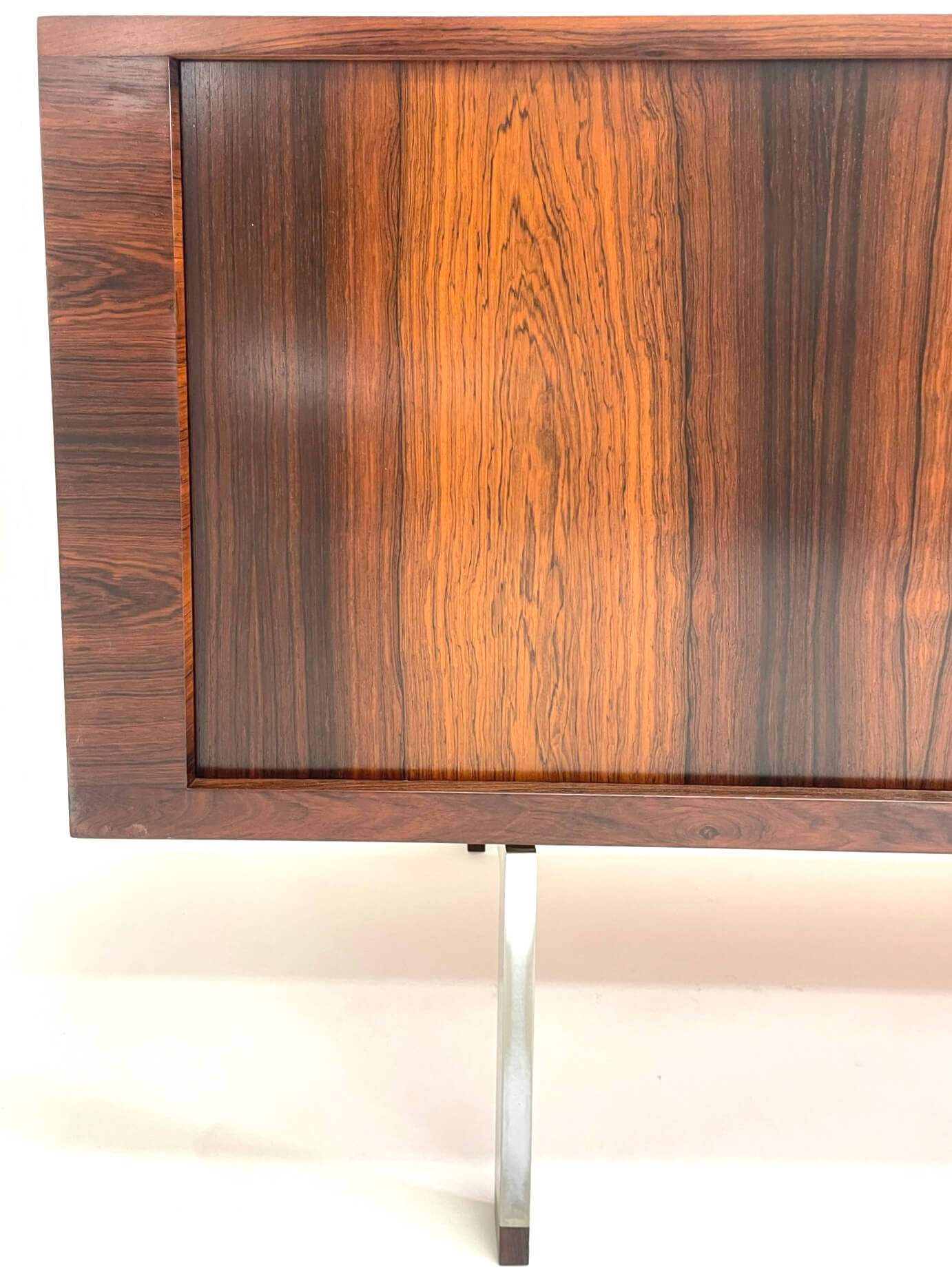 The rarest and most sophisticated credenza designed by the master of Danish Modern design in Brazilian rosewood and white oak on brushed stainless steel legs capped in solid rosewood. 4 adjustable drawers and shelves and ultra smooth tambour doors that are so finely made that when closed the door looks like solid wood. This stunning credenza from features exquisitely book-matched wood grain. Stamped by Ry Mรธblerย  A fine example of Danish Modern design for the discerning collector. This case piece hasย been completely restored and is in excellent condition. The pictures do not do this credenza justice.ย