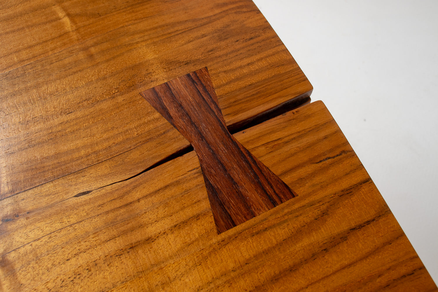 The tabletop features a dramatic, highly figured walnut slab with a single Rosewood butterfly key, chamfered and shaved live edges. hallmarks of authentic Nakashima Studio work. The intersecting trestle-style base anchors the form visually and structurally, elevating the organic slab while allowing the wood’s natural character to take center stage.