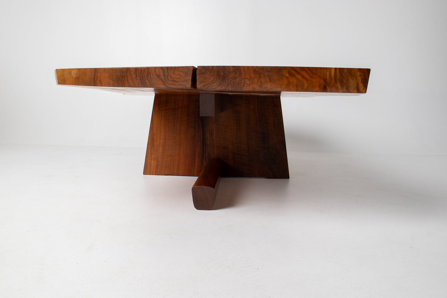 Handmade from a single free-form English walnut slab and supported by a sculptural black walnut Minguren pedestal base, this table exemplifies the poetic harmony between nature, craftsmanship, and architectural form that defines Nakashima furniture.