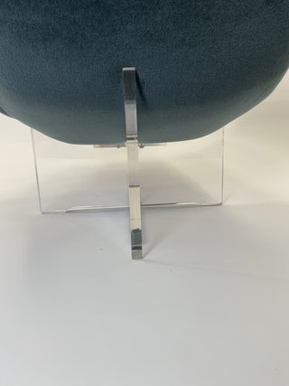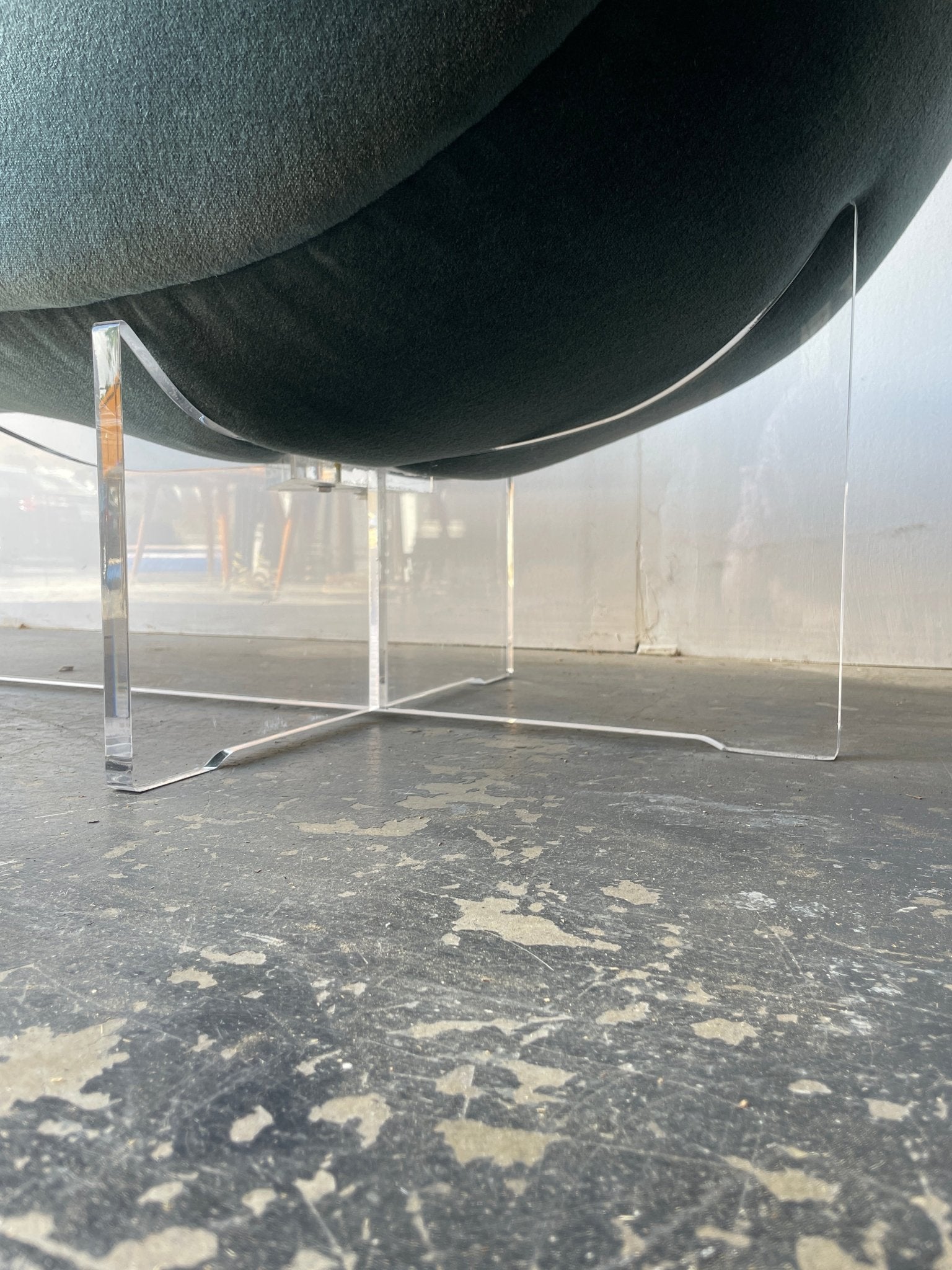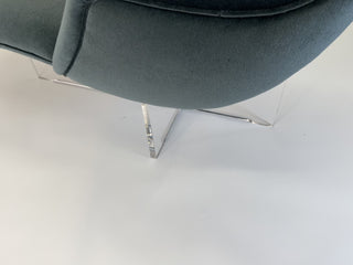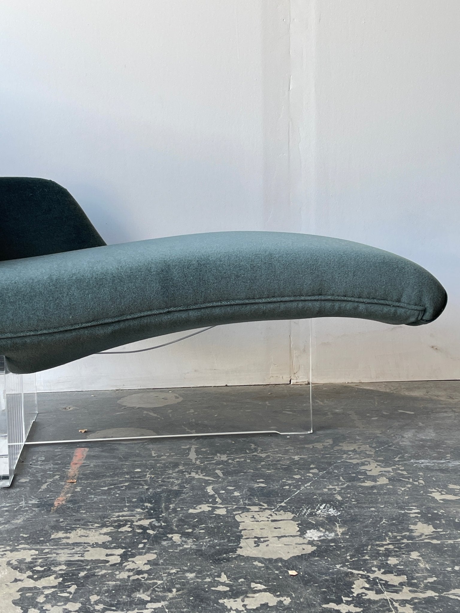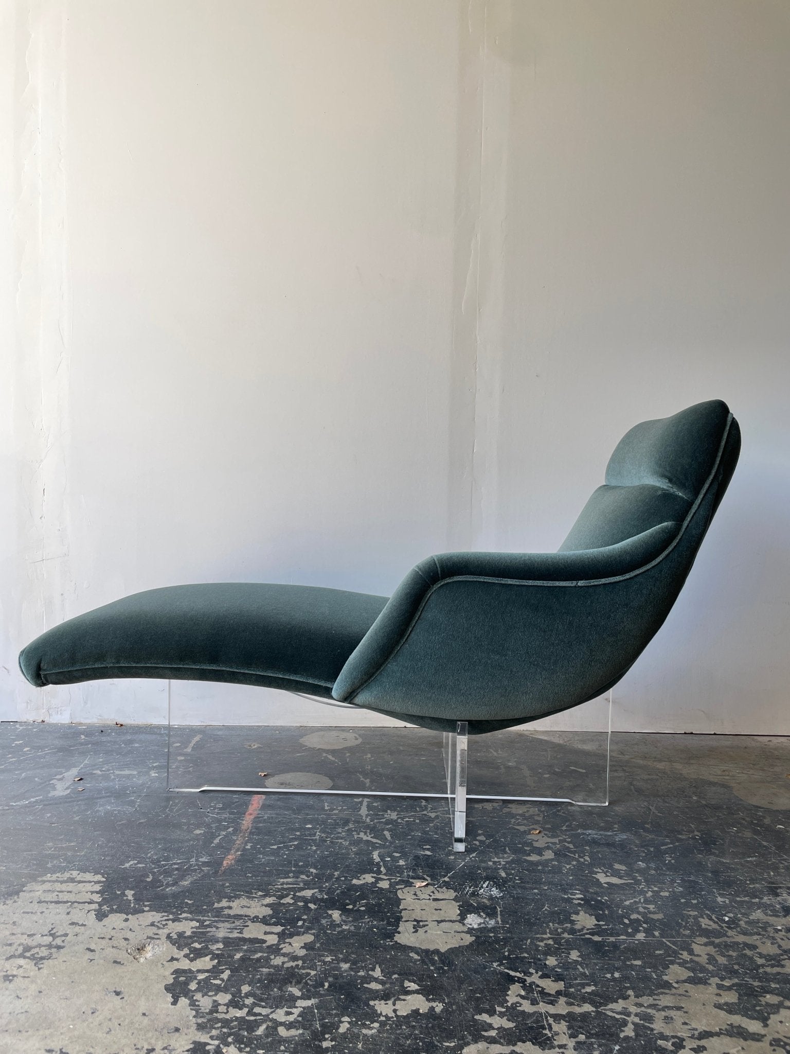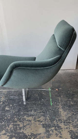 The Erica Chaise was first designed in 1969 and named after Vladimir Kaganโs wife, needlework maven Erica Wilson. Redesigned with the clean lines and classic feel of the prototype Vladimir kept in his own home, the chaise effortlessly cradles the back and supports the head with its sculpted upholstery. The lucite base give the chair the illusion it is floating off the ground. This vintage piece has been restored and upholstered in Holly Hunt 4800/16 | TAKE DIRECTION TURQUISH 100% Mohair.ย