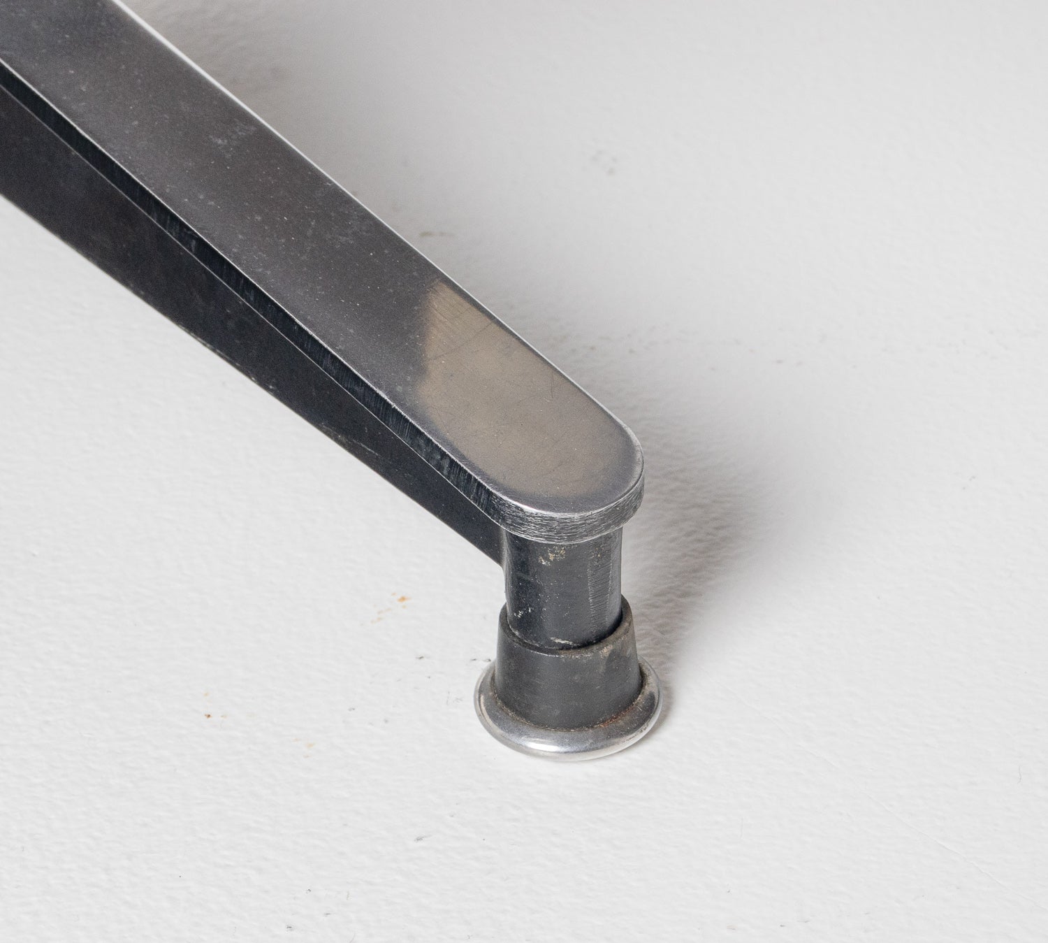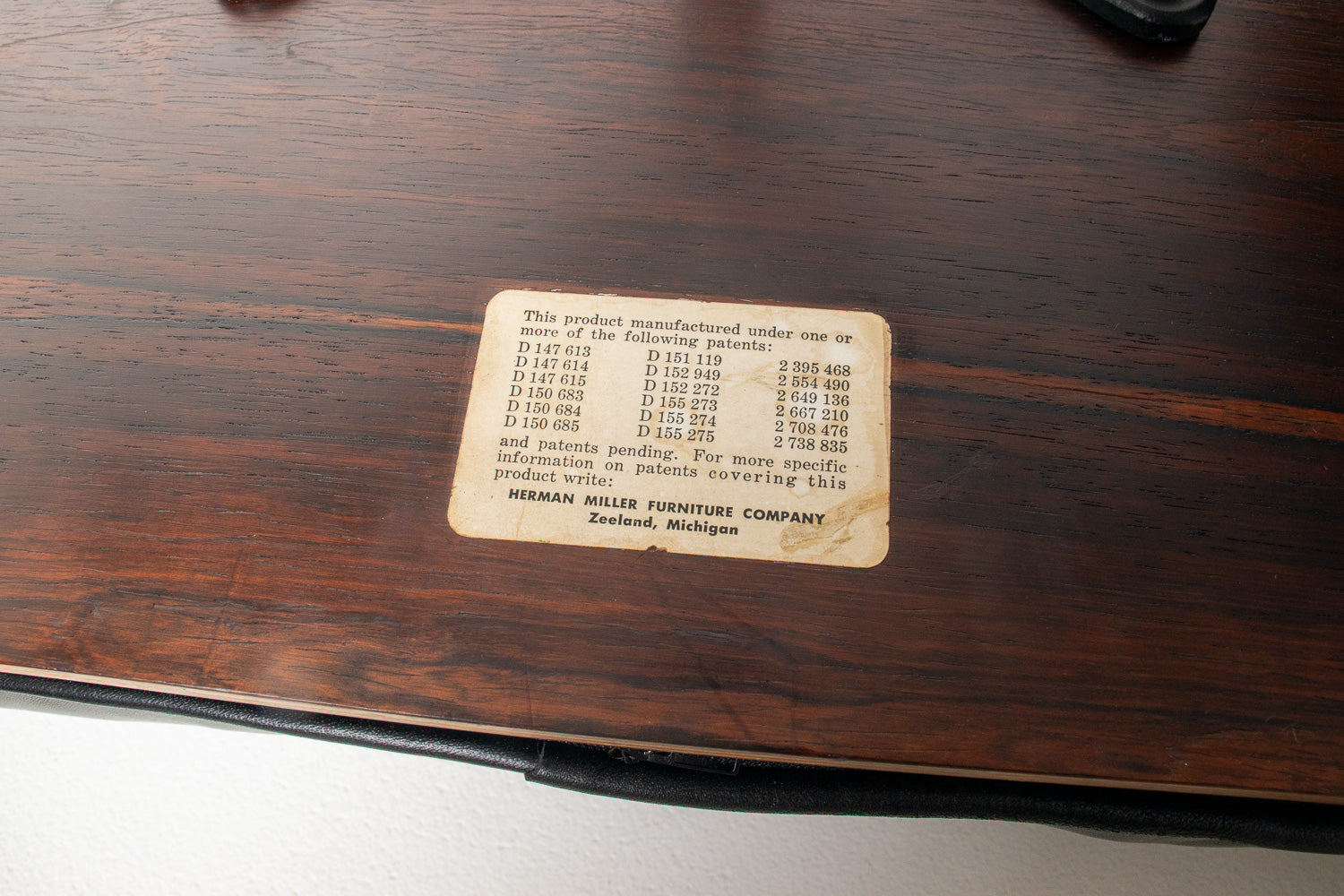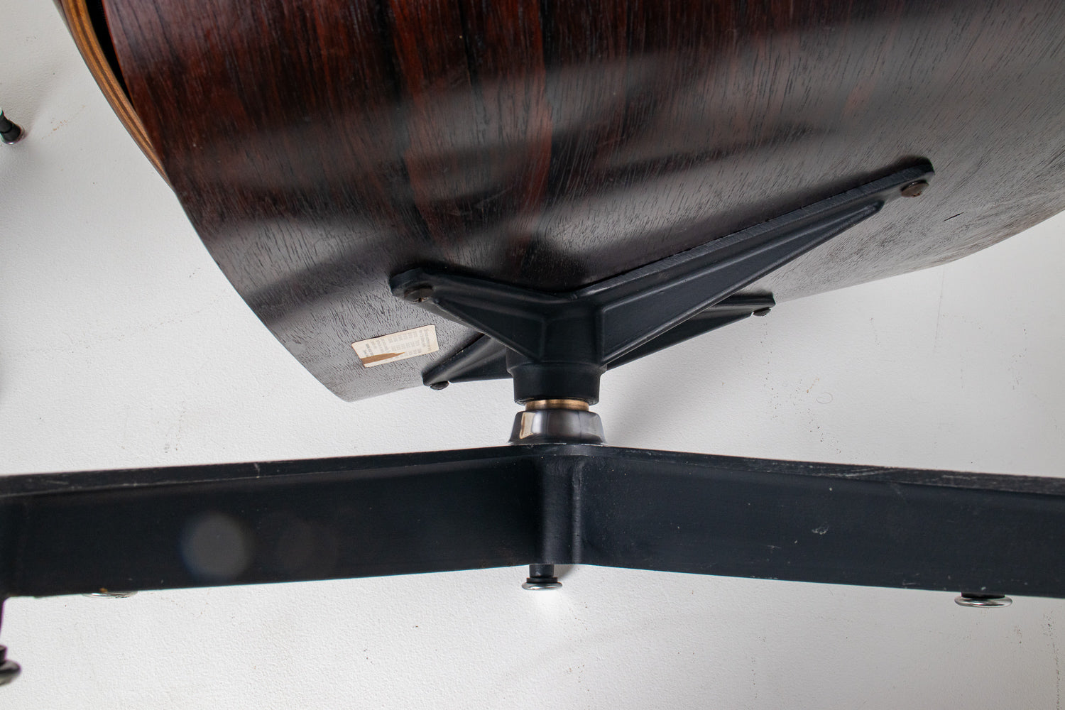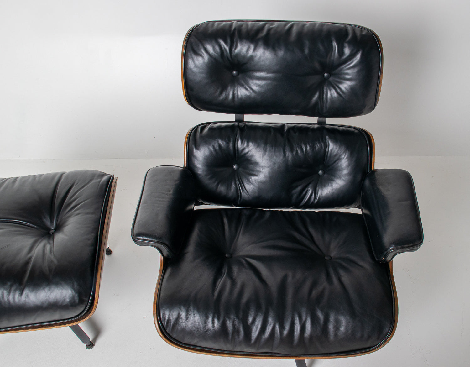 The cushions have been newly upholstered in premium Italian black leather, filled with down feathers for the relaxed, luxurious sit Ray and Charles Eames originally intended โ soft, enveloping, and exceptionally comfortable. The arms retain their original upholstery, showing honest patina and light wear that speak to authenticity and age โ a detail many collectors prefer over over-restoration.