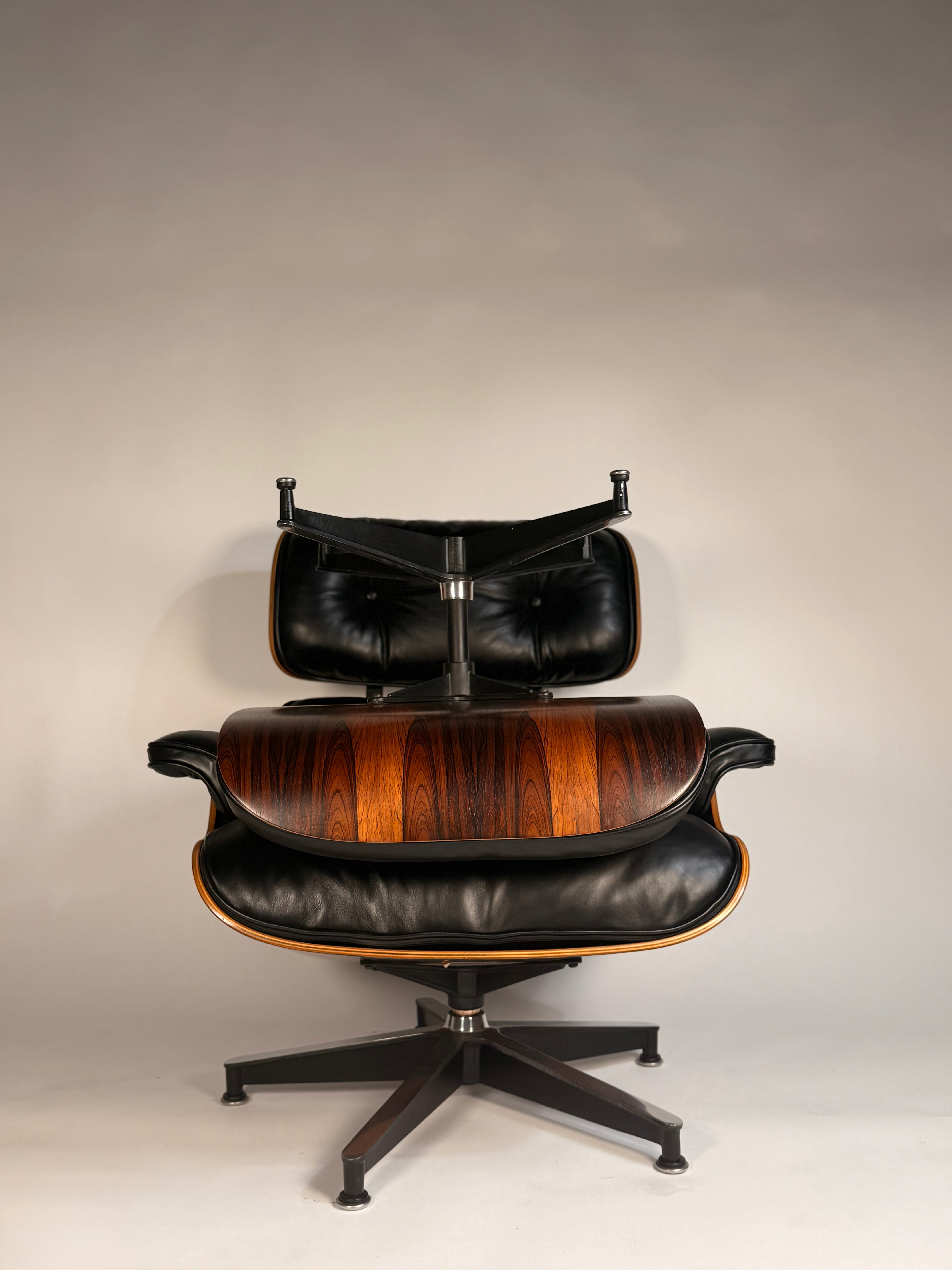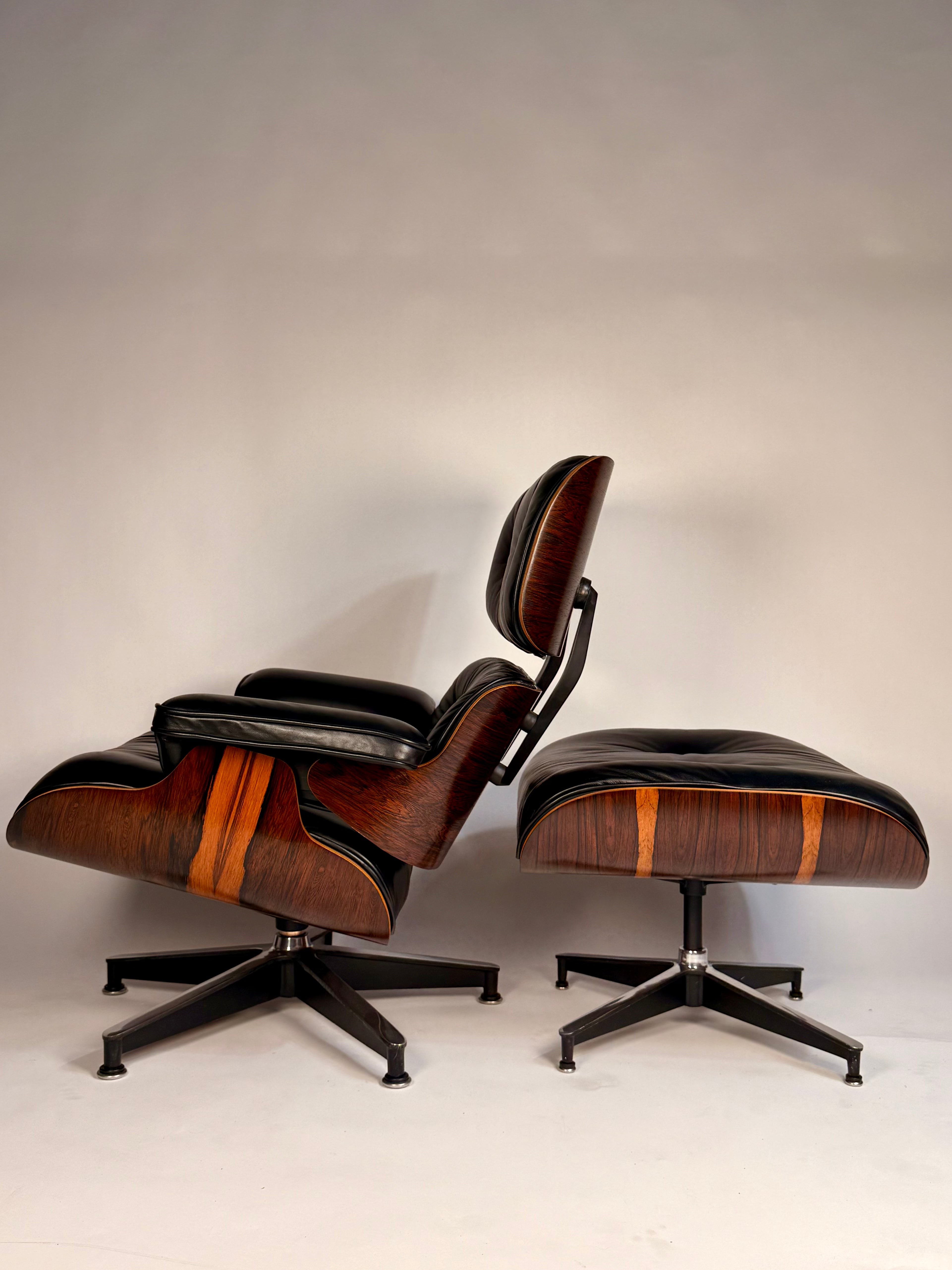 An icon of 20th-century design, this Eames Lounge Chair and Ottoman (670/671) is presented in beautifully figured rosewood. The shells display striking natural grain patterns, with the seat highlighted by elegant ribbons of sapwood that bring depth and visual intrigue to the composition.