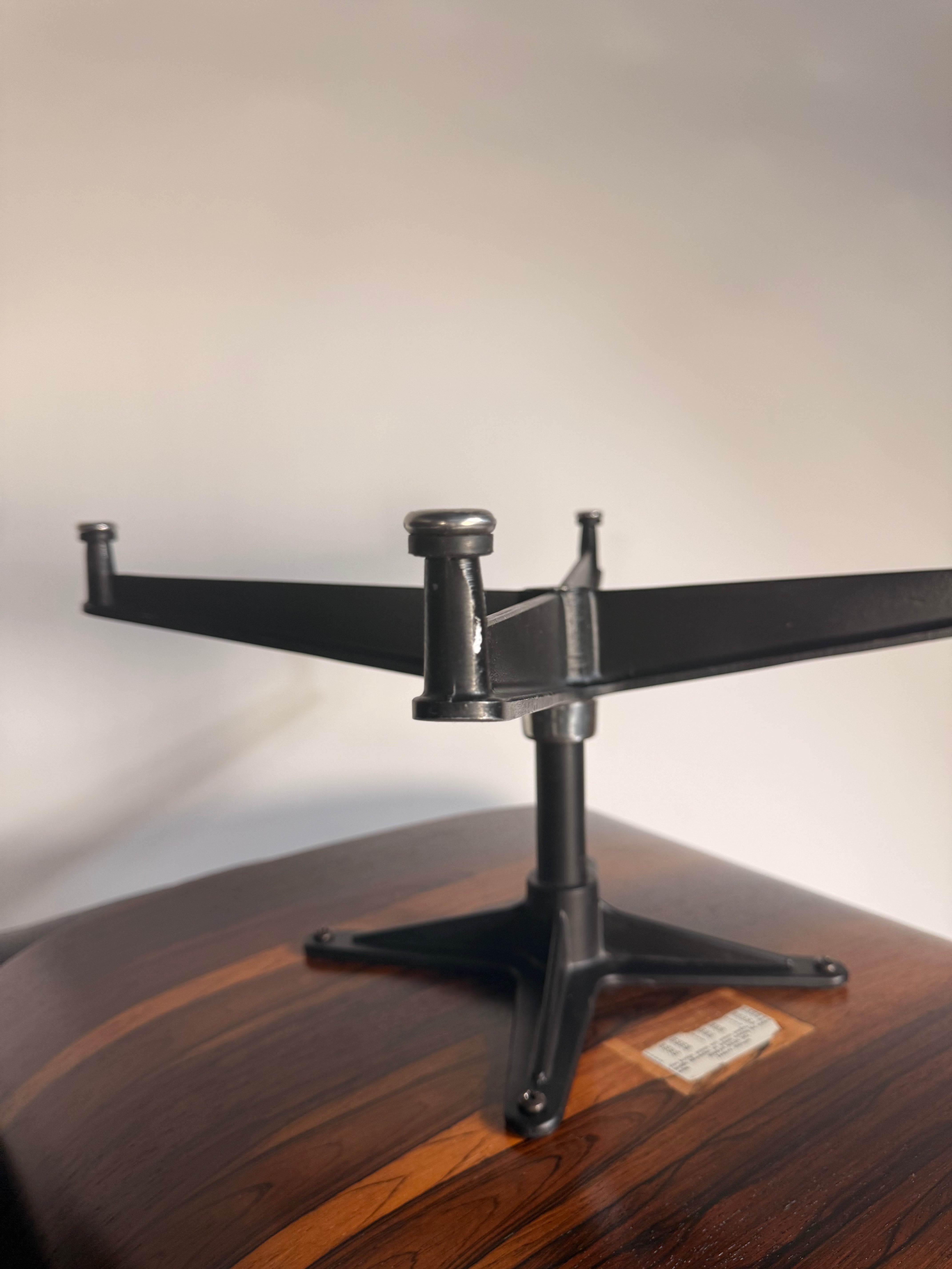 Fully restored for both beauty and comfort, the chair has been reupholstered in supple new black leather, and the shells have been expertly refinished to honor the woodโs original warmth and glow. Four newly replaced shock mounts under the arms ensure proper support and longevity while maintaining the chairโs authentic design integrity.