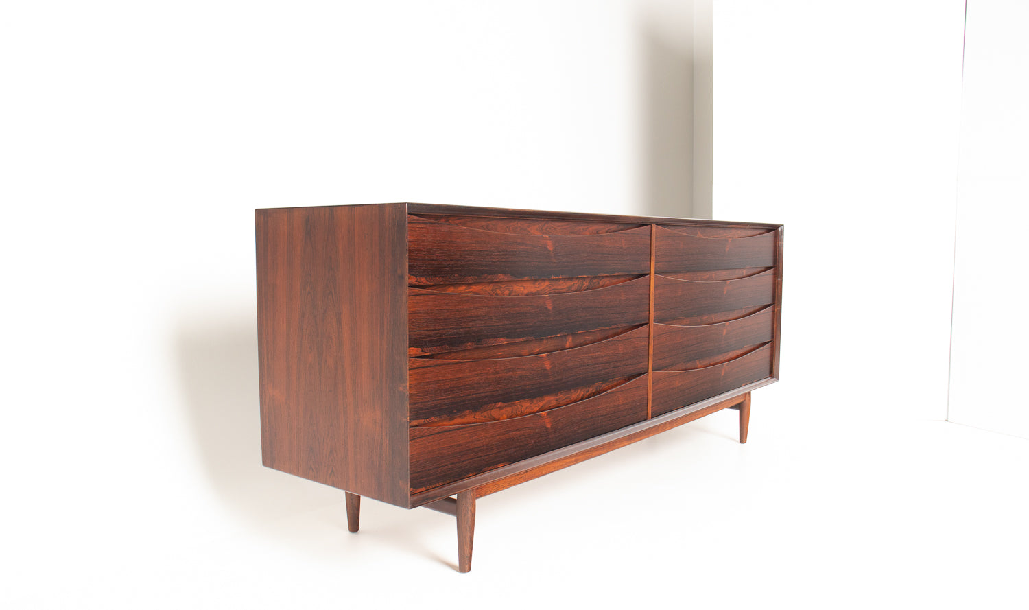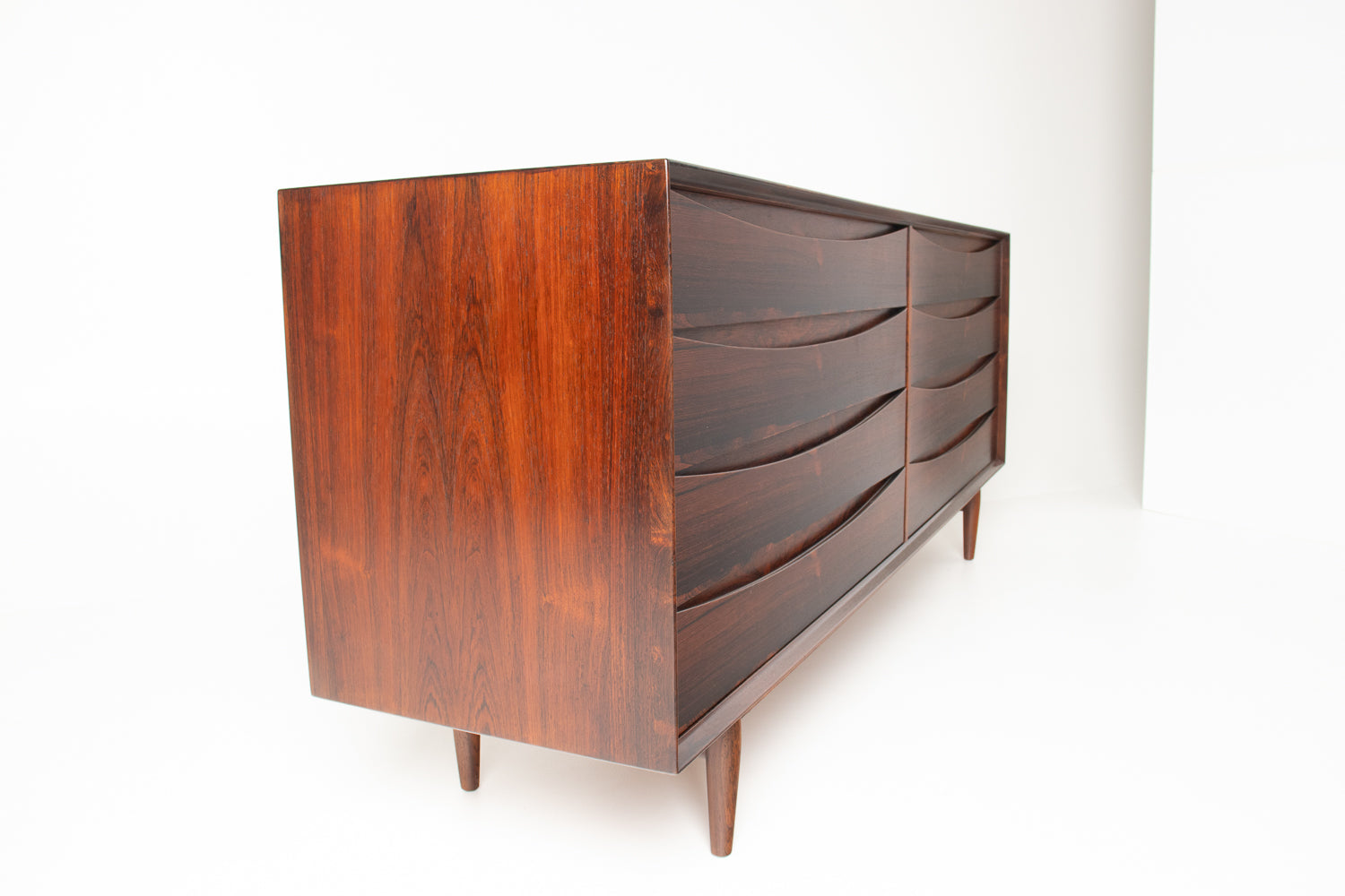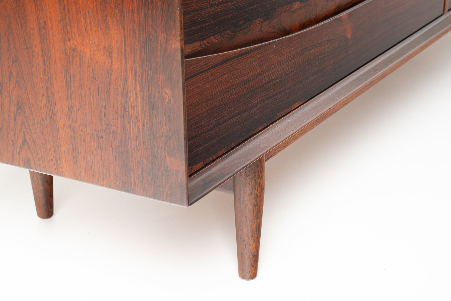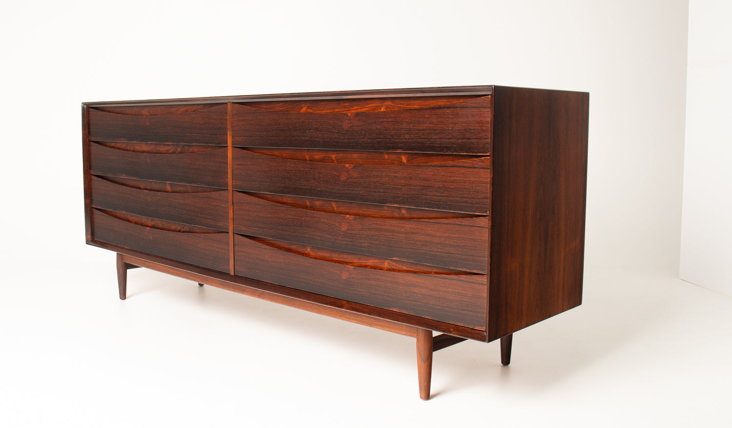 • This exceptional Arne Vodder dresser, crafted for Sibast Møbelfabrik, is a rare and highly sought-after example executed in Brazilian rosewood—a material prized for its dramatic grain, deep coloration, and increasing scarcity. Vodder’s sculptural drawer fronts showcase the wood to its fullest expression: waves of dark, glowing rosewood that shift beautifully in the light, creating an elegant sense of movement across the entire piece.