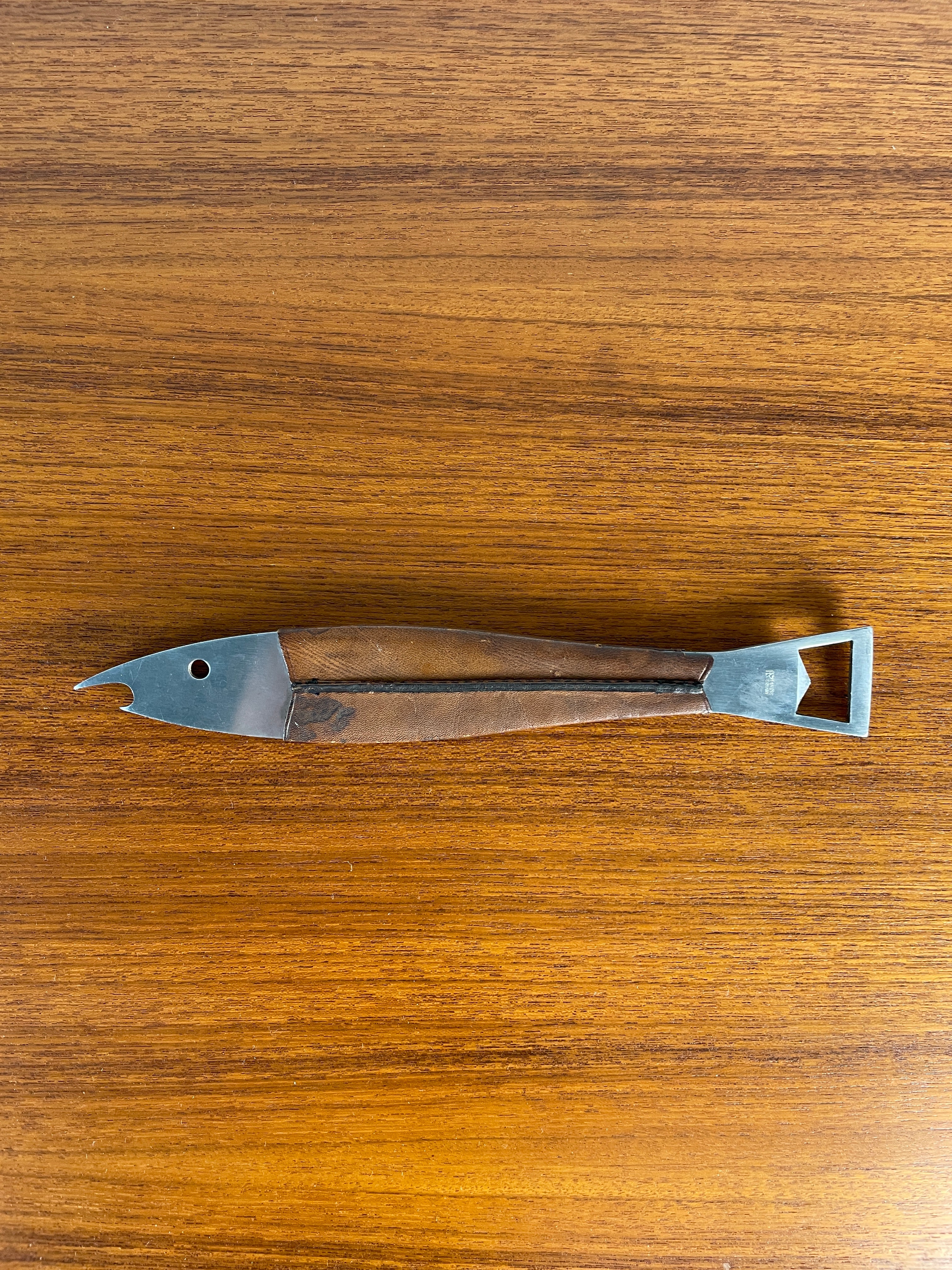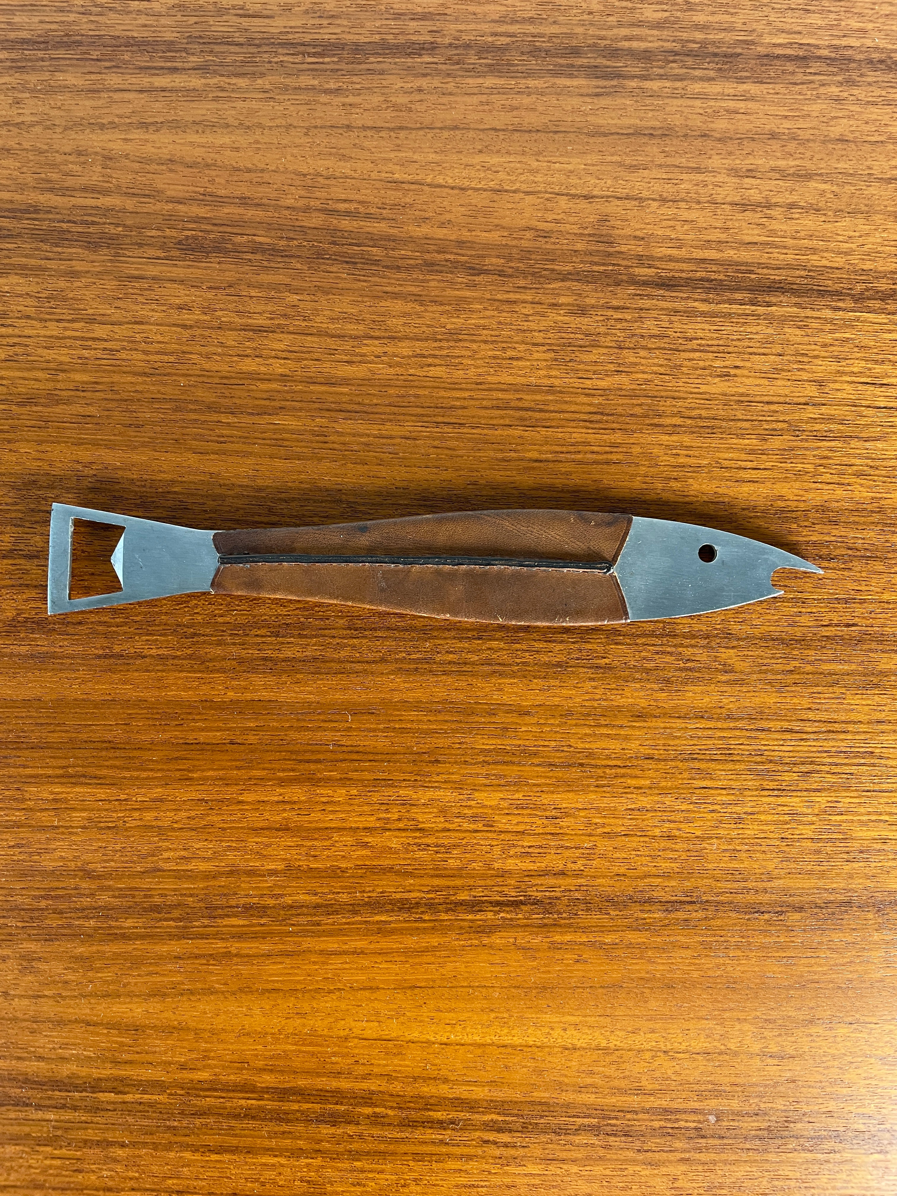 Beautiful Carl Aubock Neptune Fish Bottle Opener. Heavy Steel. The leather has gorgeous patina and shows well.