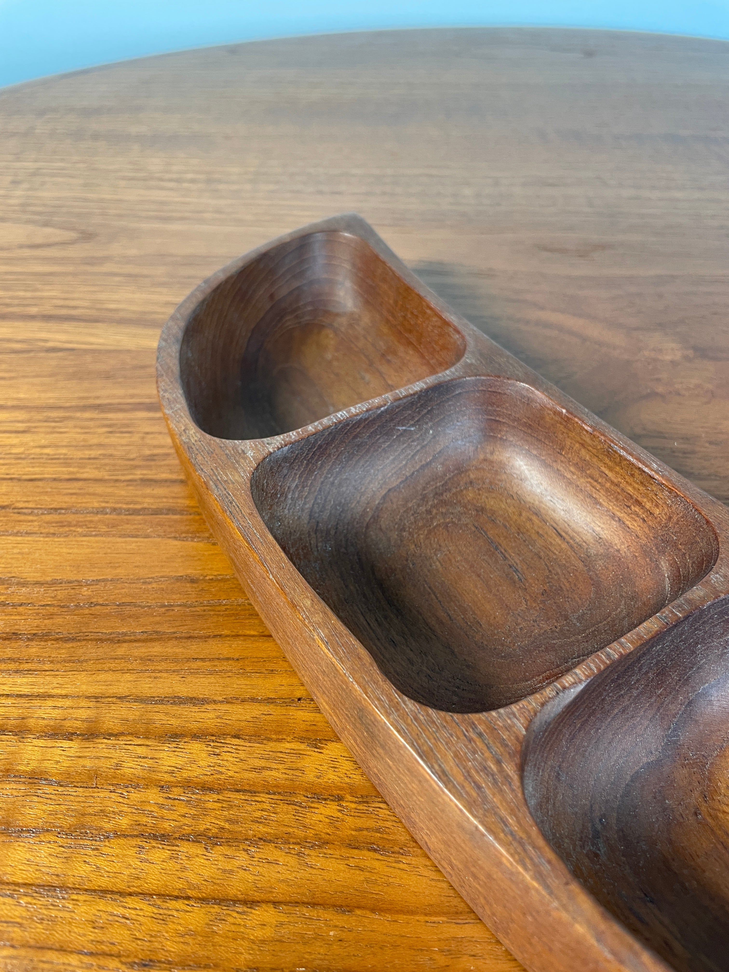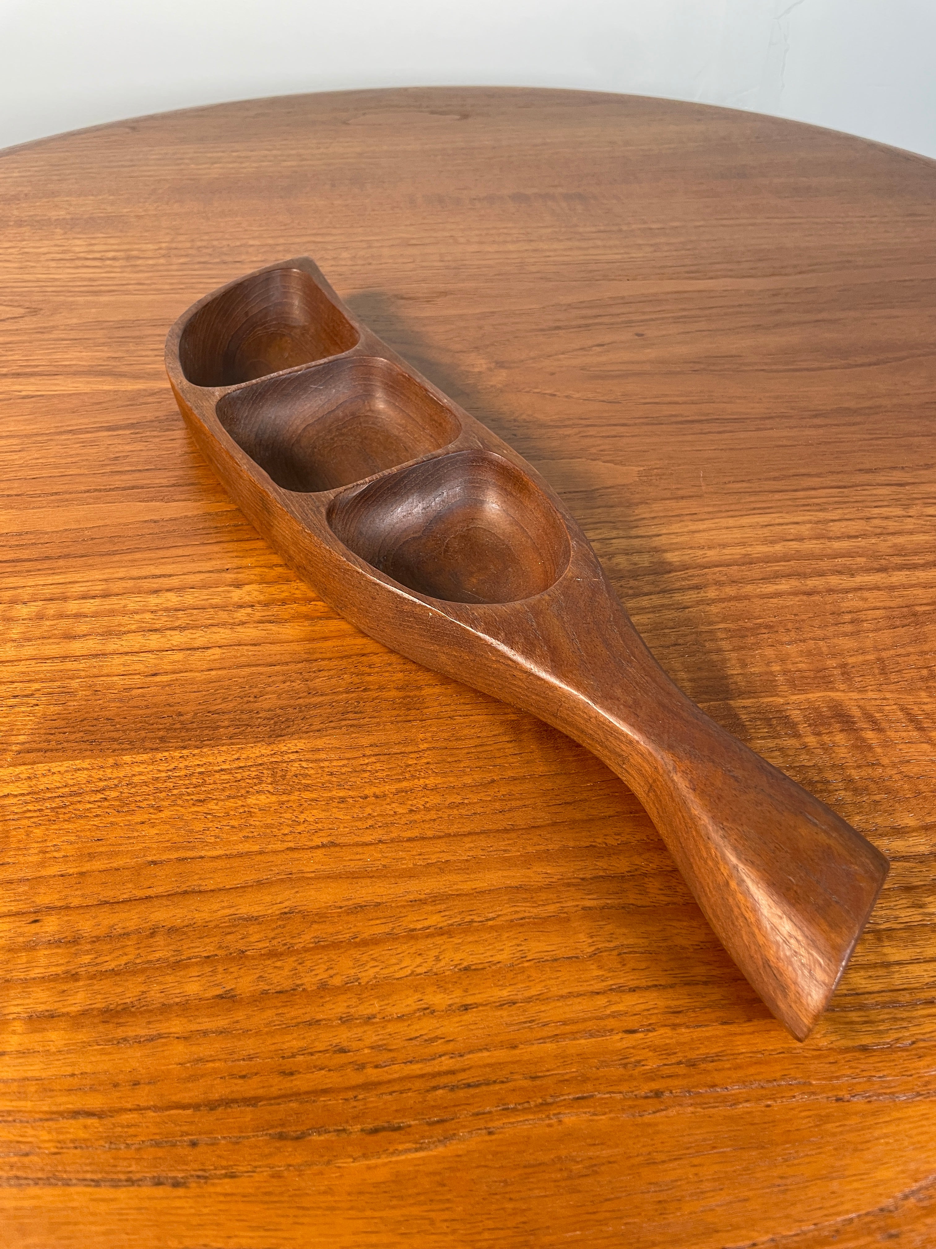 Solid Teak Catch All Tray with Handle. Beautiful organic shape. Made of old growth teak. Wonderful Decor item for a large dining table or a top an entry way Console.