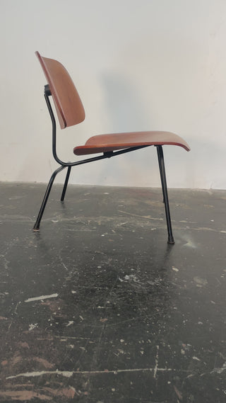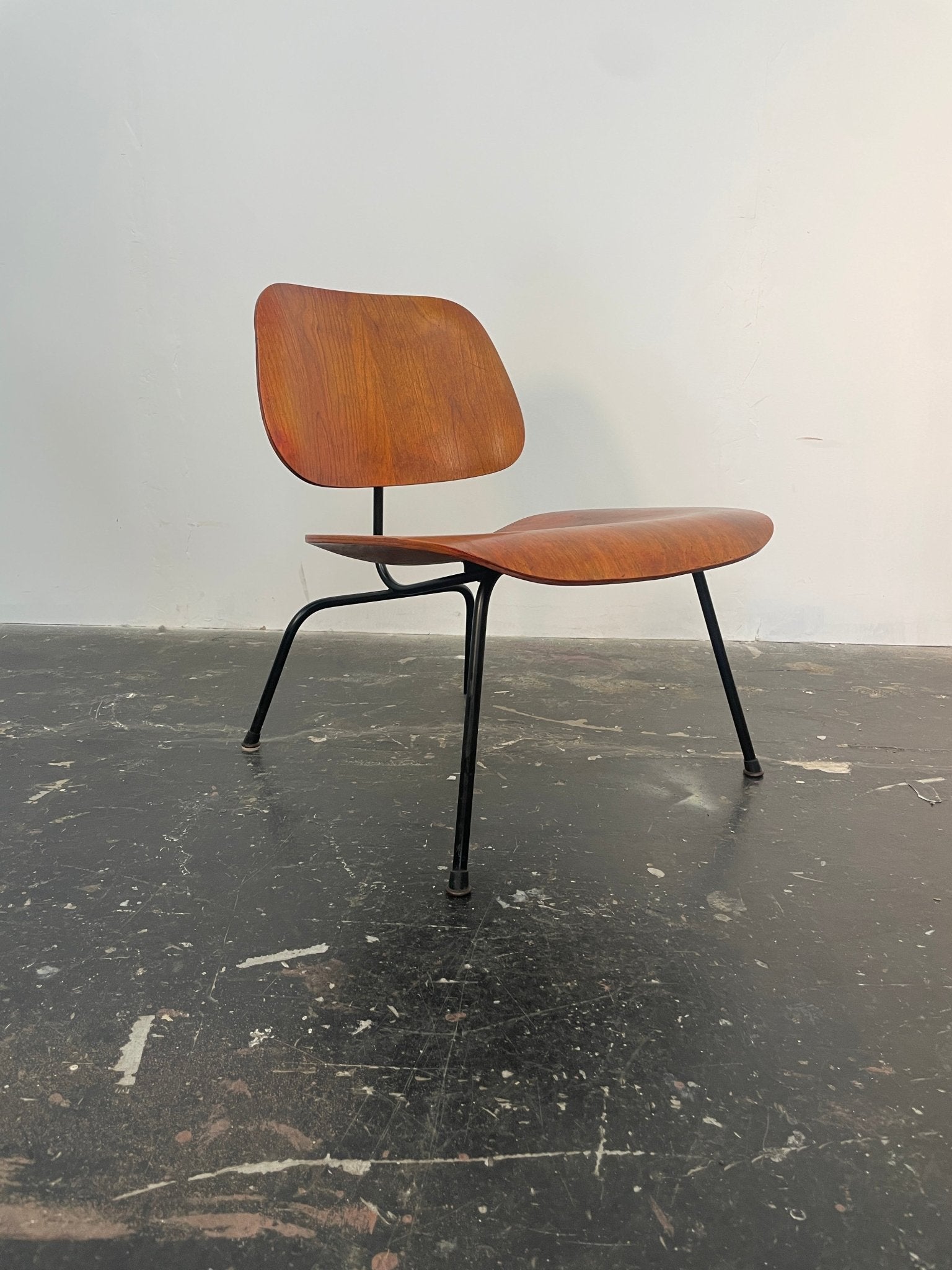 Charles and Ray Eames LCM (Lounge Chair Metal) by Herman Miller made of ash plywood in rare aniline Red, black enameled steel. Impressed mark to underside 'LCM'. Great patina on this piece. This chair is deceptively comfortable. Seat shock mounts in working order. Back shock mounts have been replaced.ย This is a Third Generation Circa 1954-1960.ย