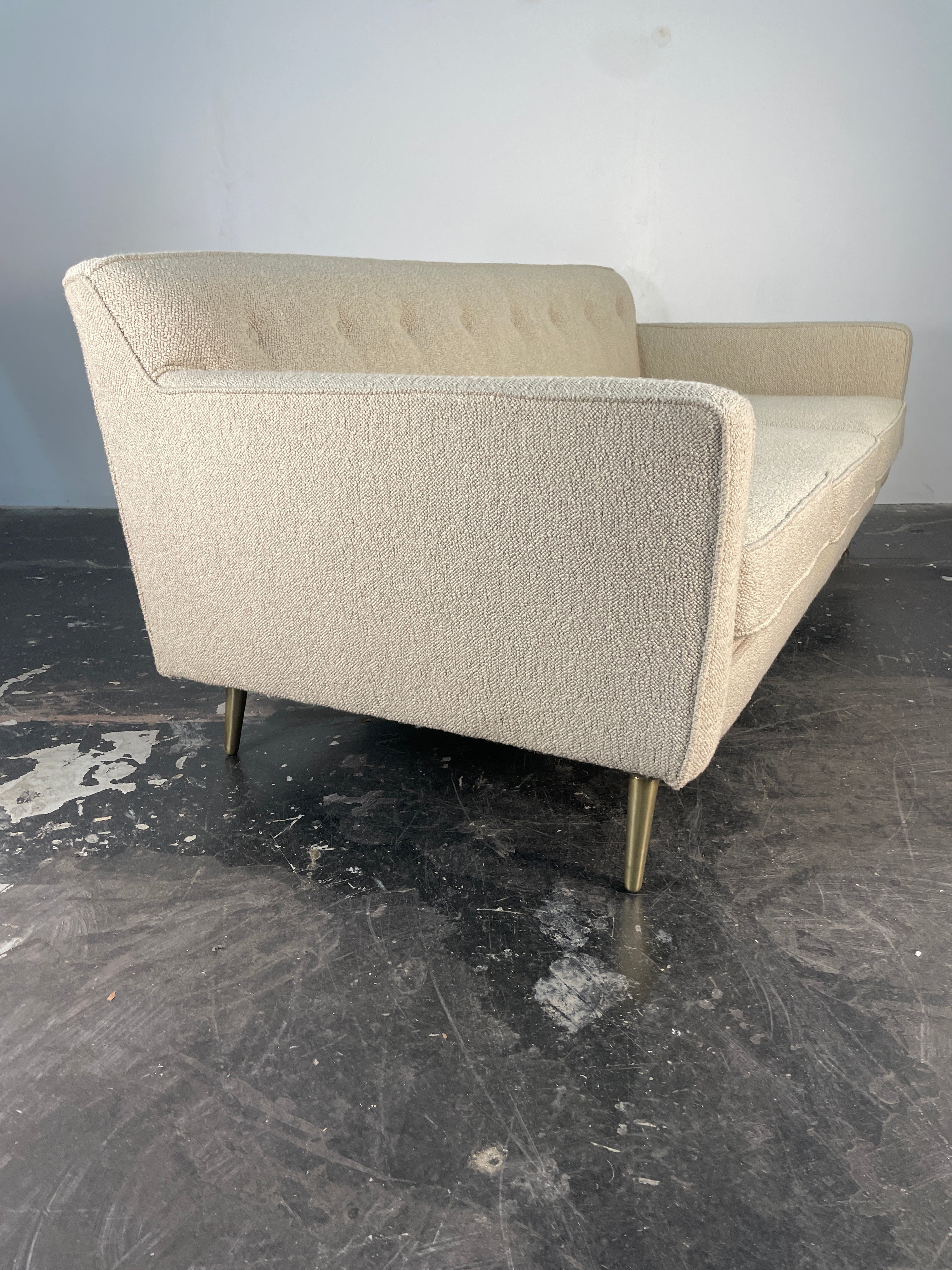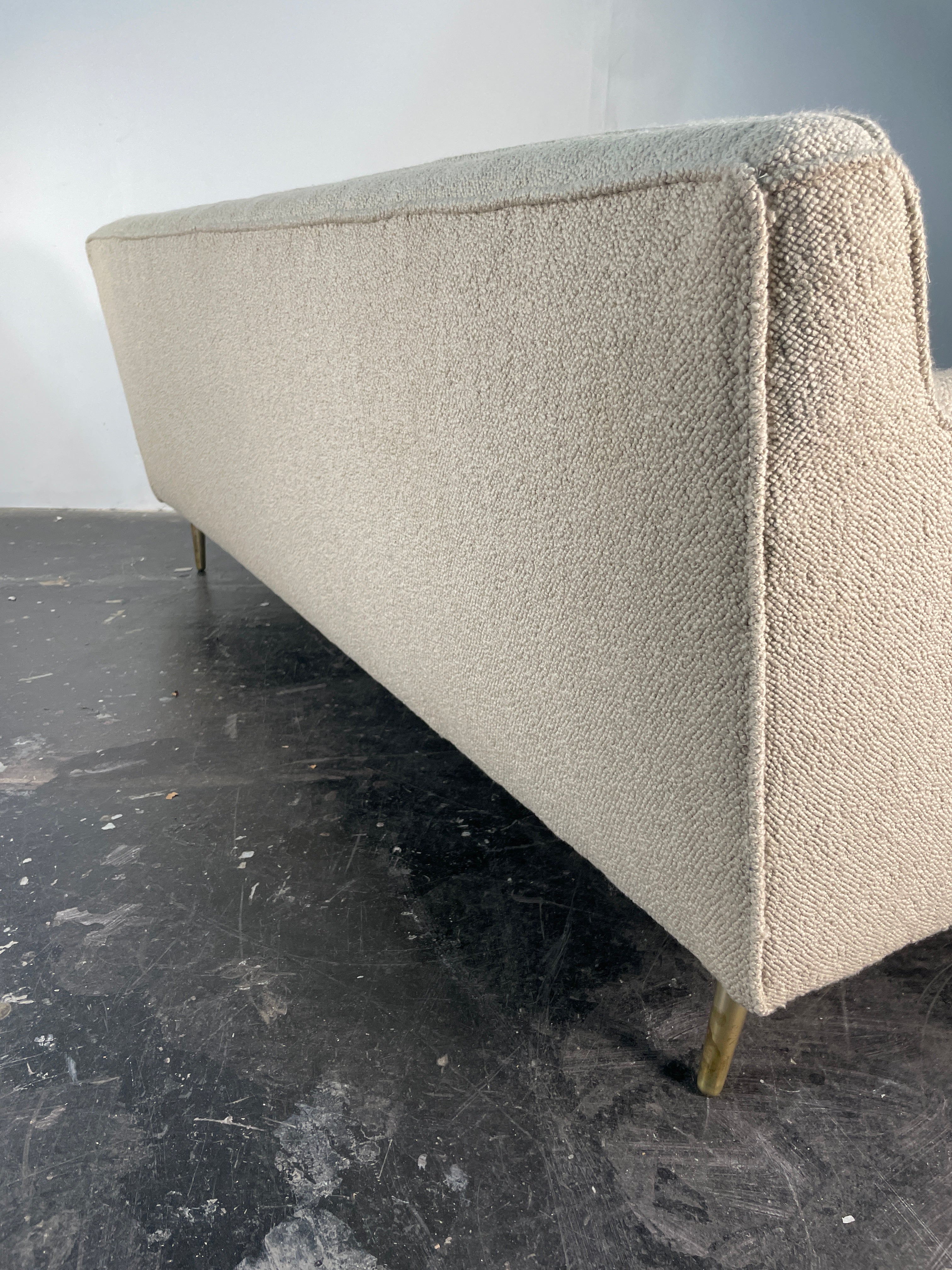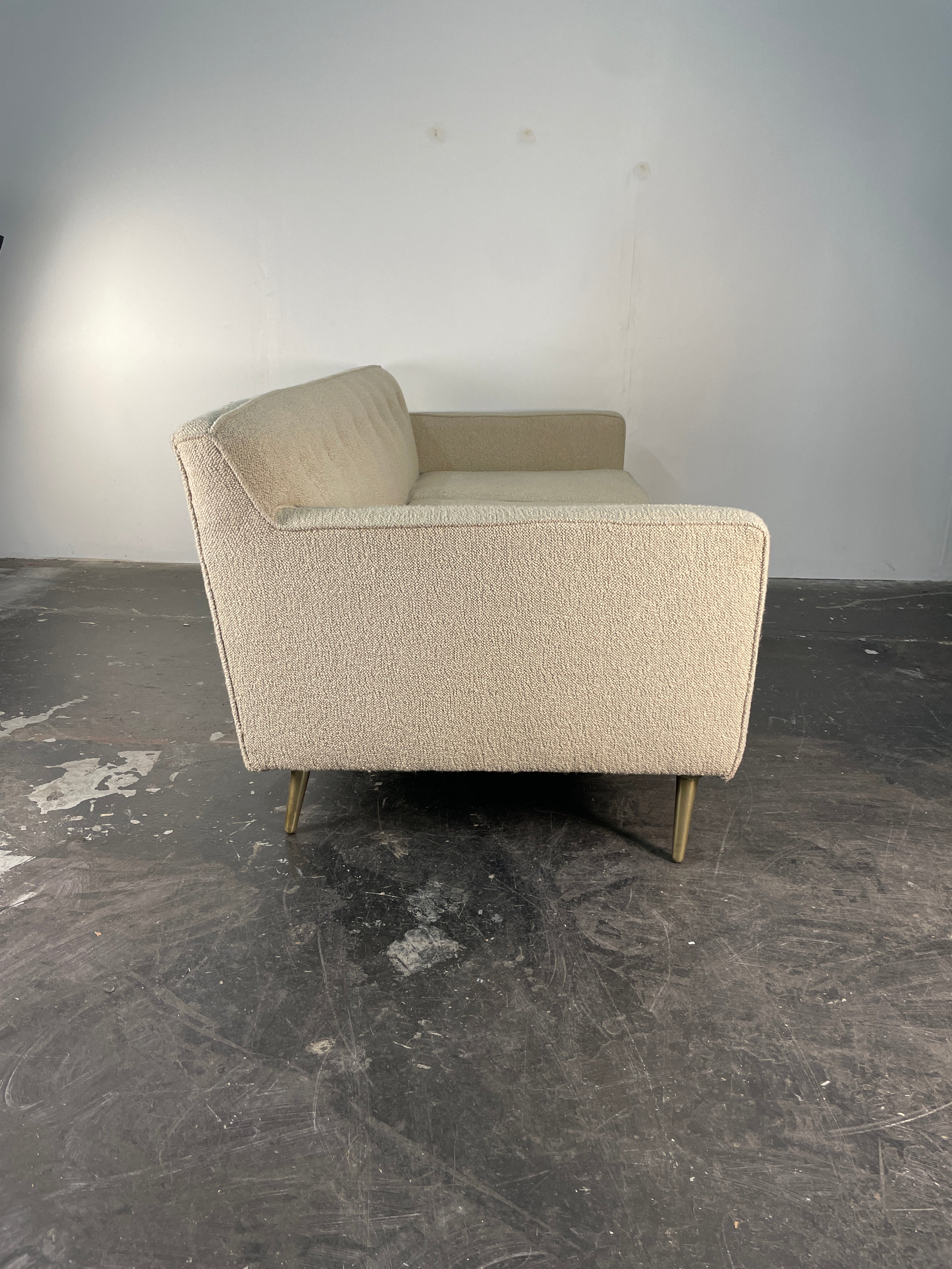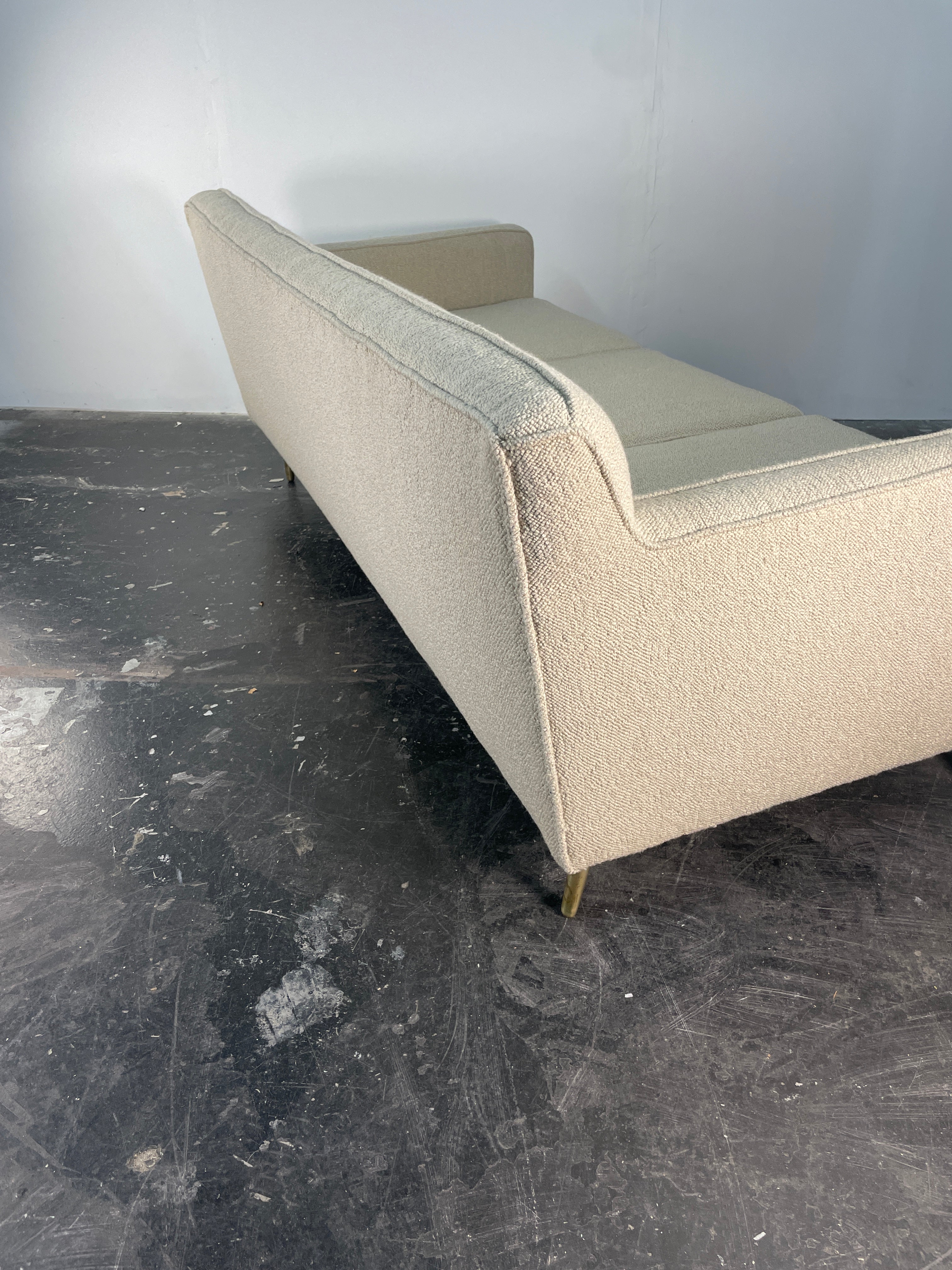 • Sophisticated 3 seater sofa designed by Edward Wormley with Brass legs for Dunbar. We have newly upholstered it in Maharam / Hearth / Amphitheater boucle made in Belgium. Beautiful structured clean lines and brass legs makes this sofa a classic and perfect for any home or design style. Dunbar Label attached.