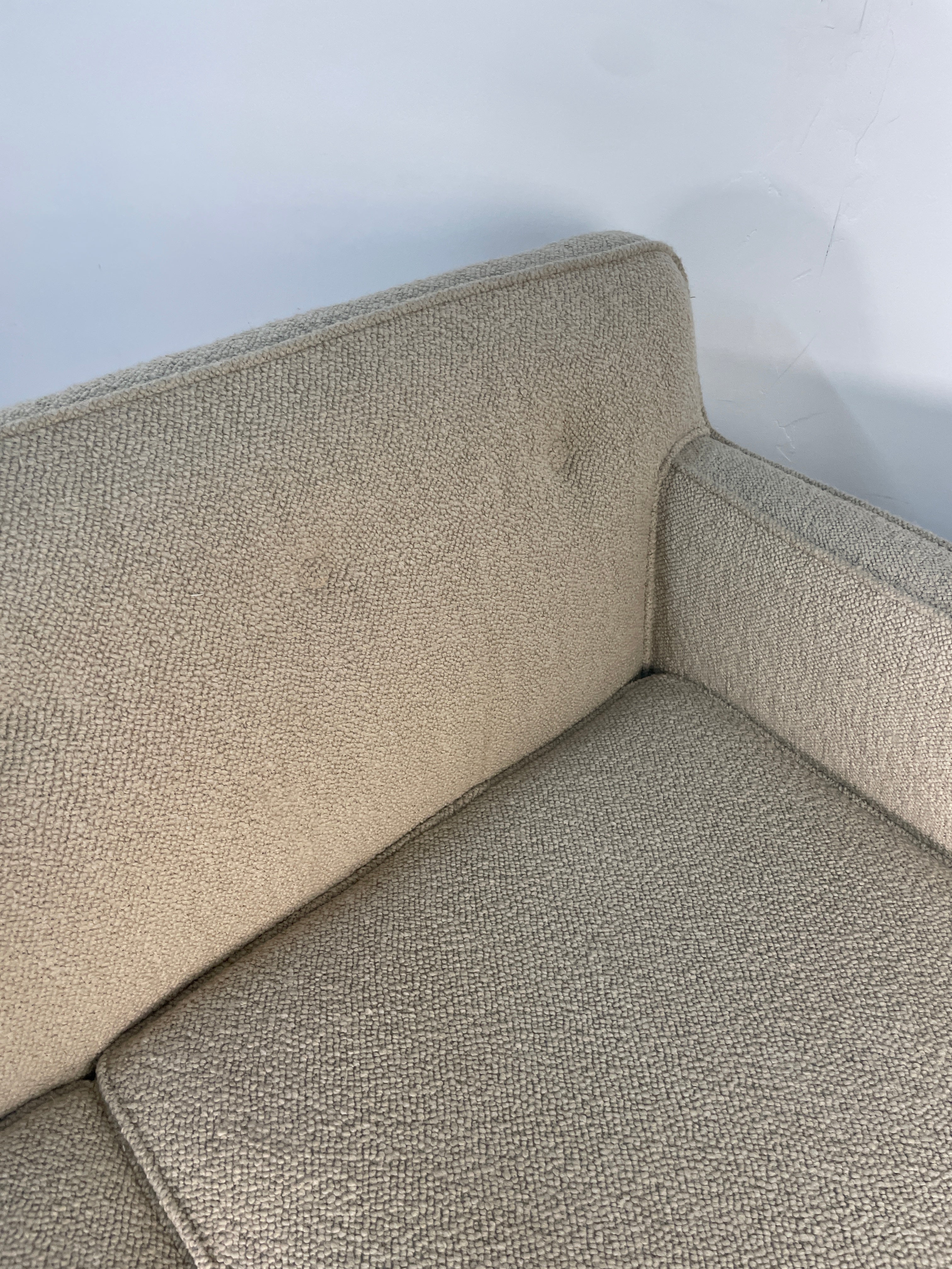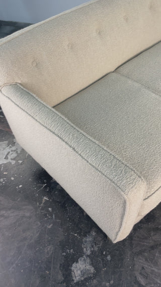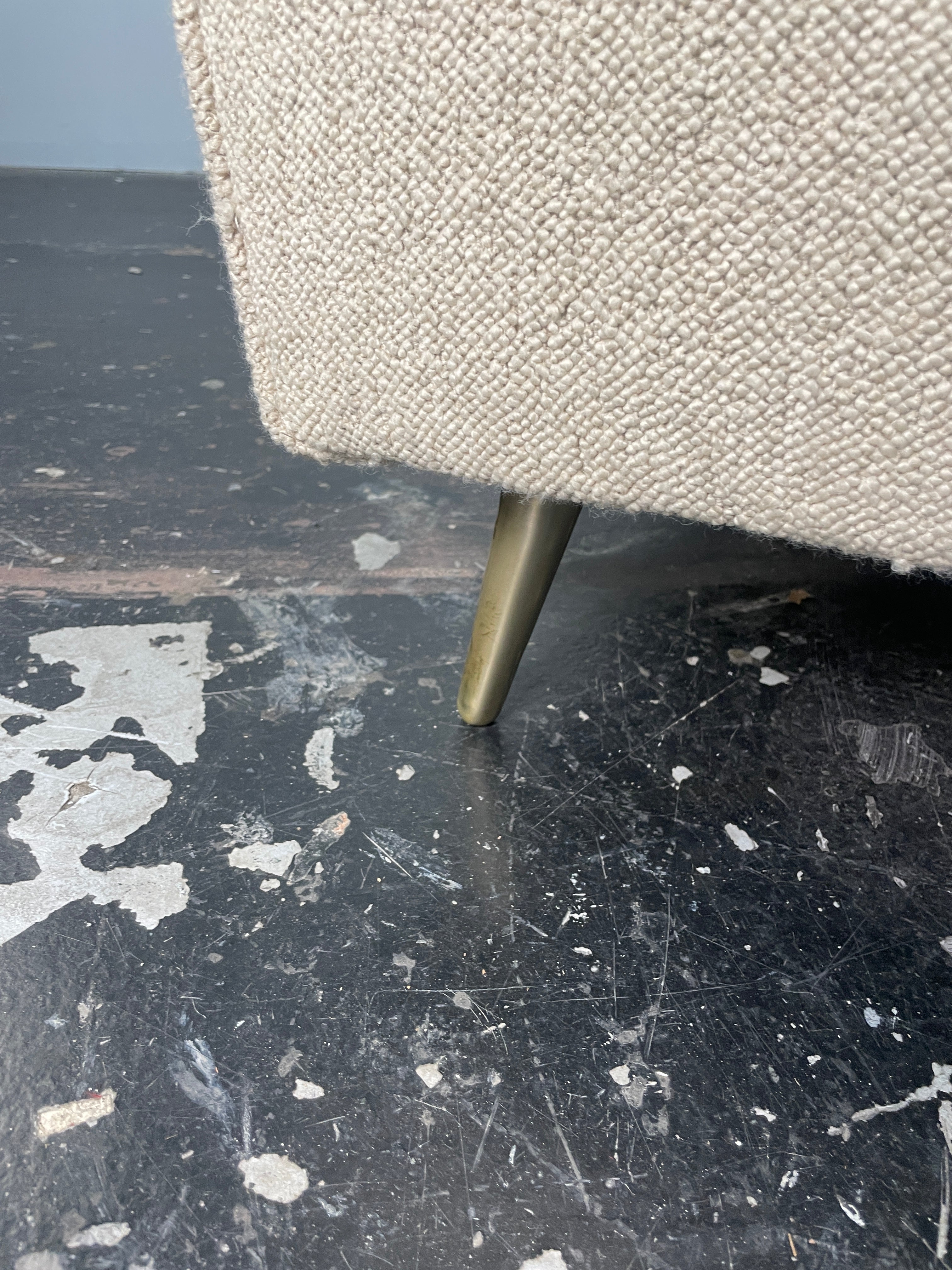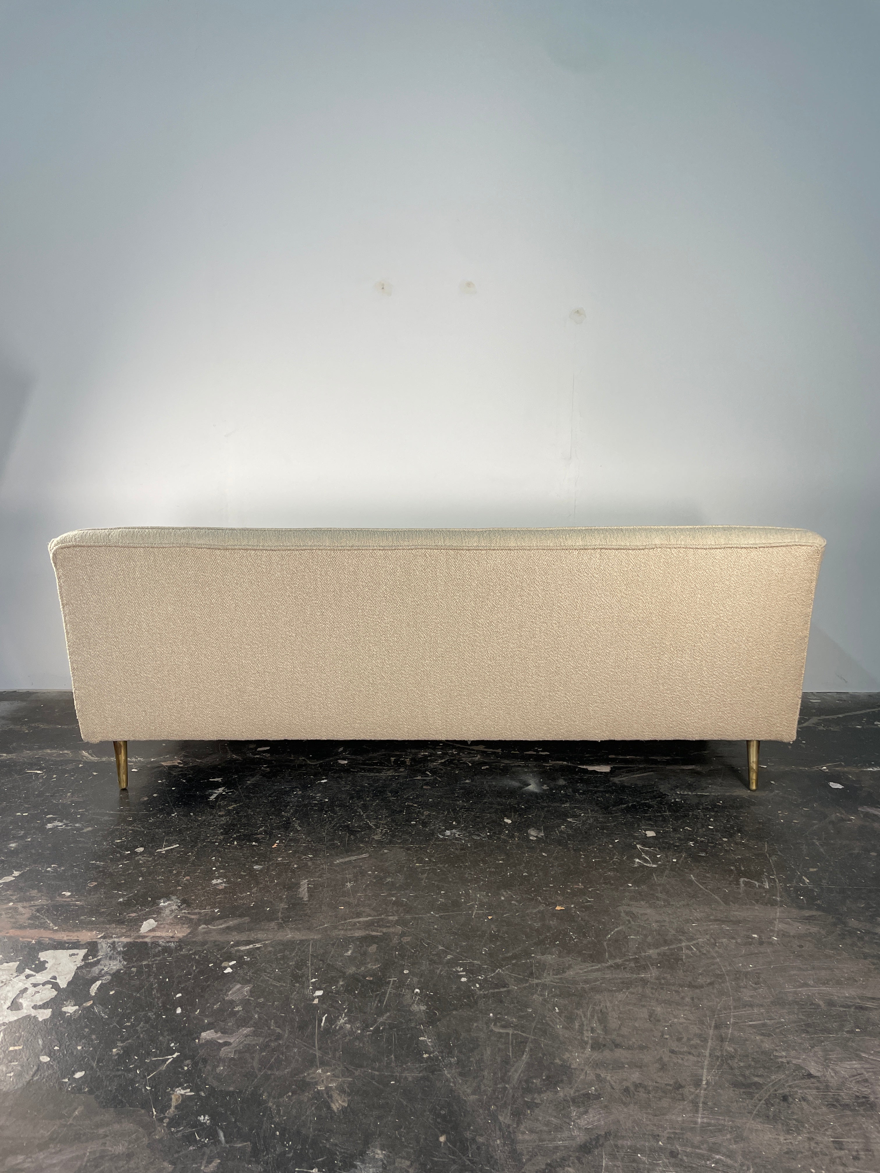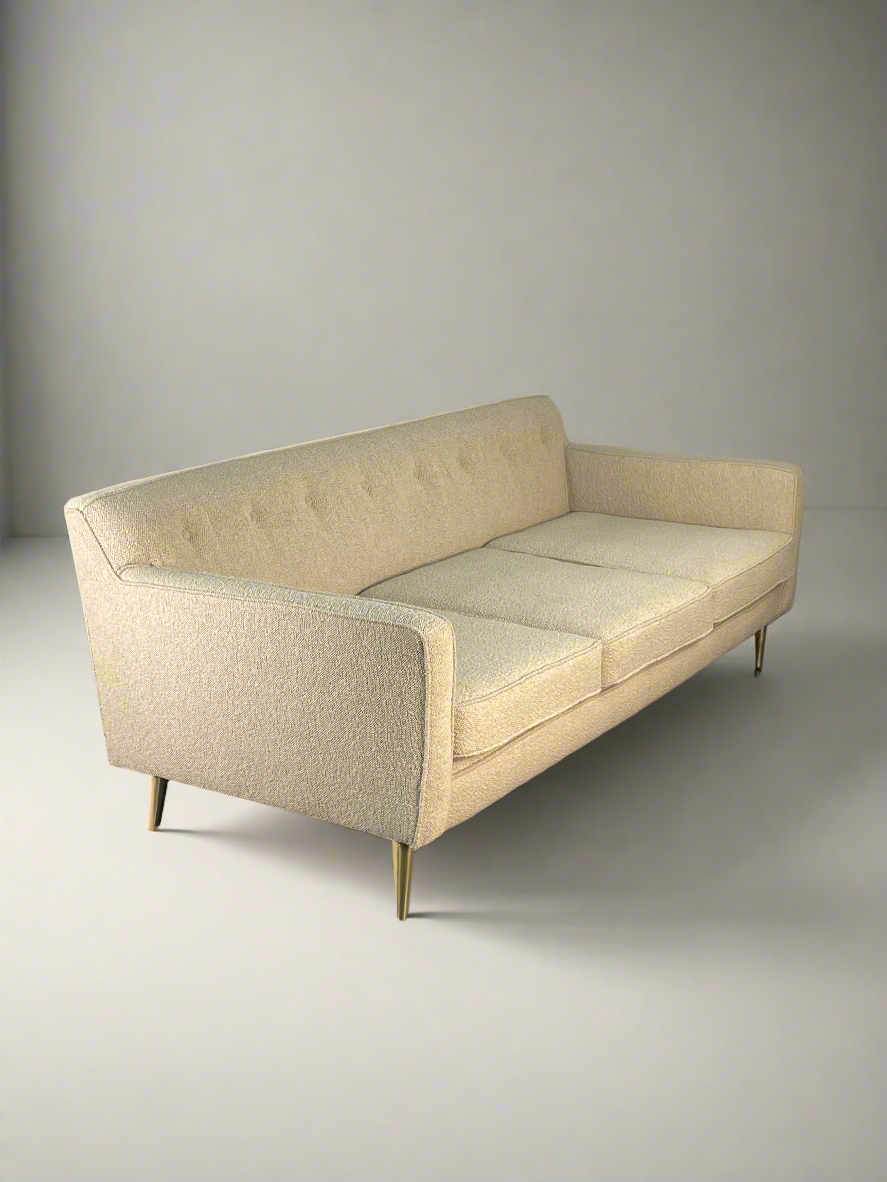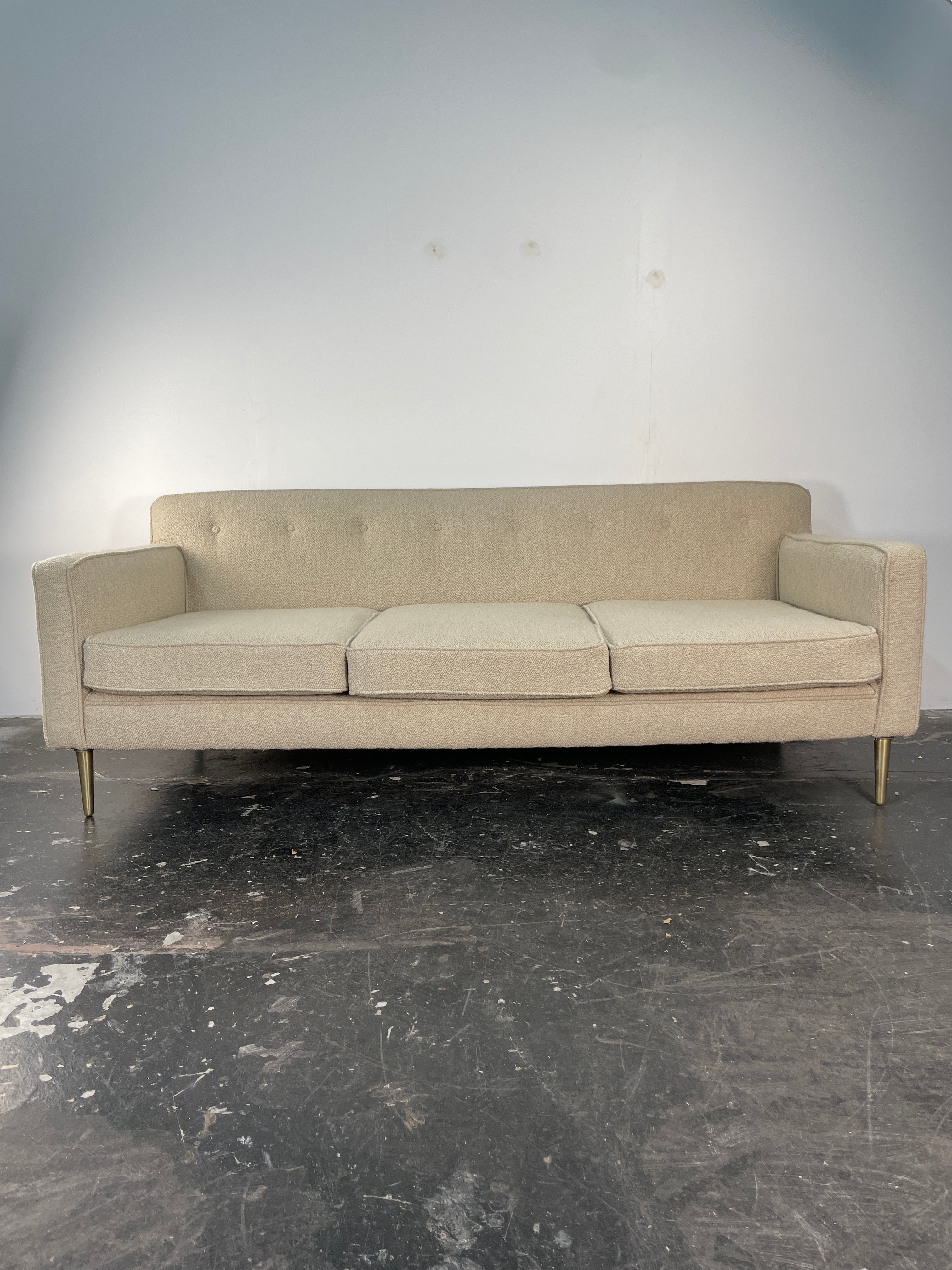 • Sophisticated 3 seater sofa designed by Edward Wormley with Brass legs for Dunbar. We have newly upholstered it in Maharam / Hearth / Amphitheater boucle made in Belgium. Beautiful structured clean lines and brass legs makes this sofa a classic and perfect for any home or design style. Dunbar Label attached.