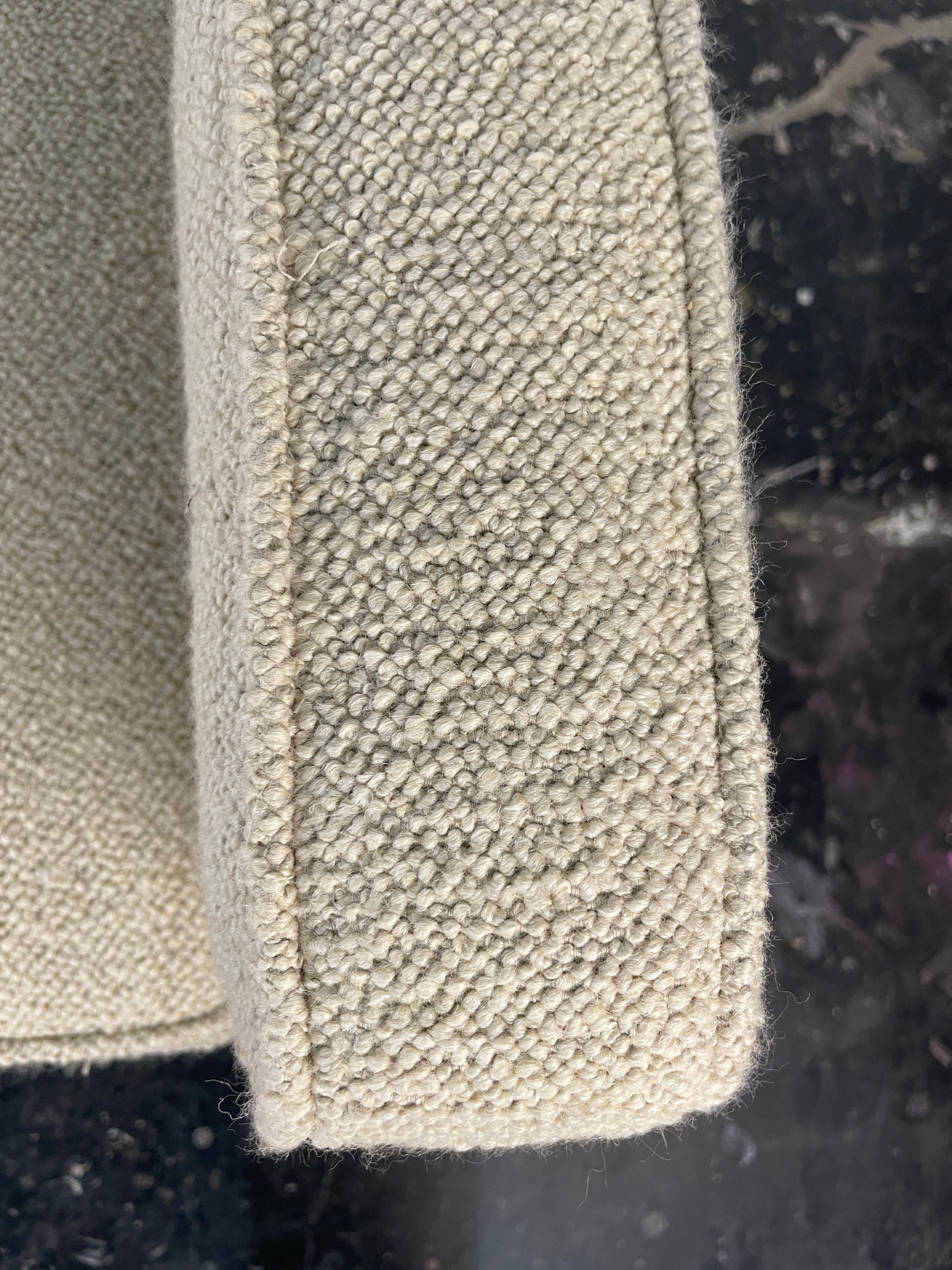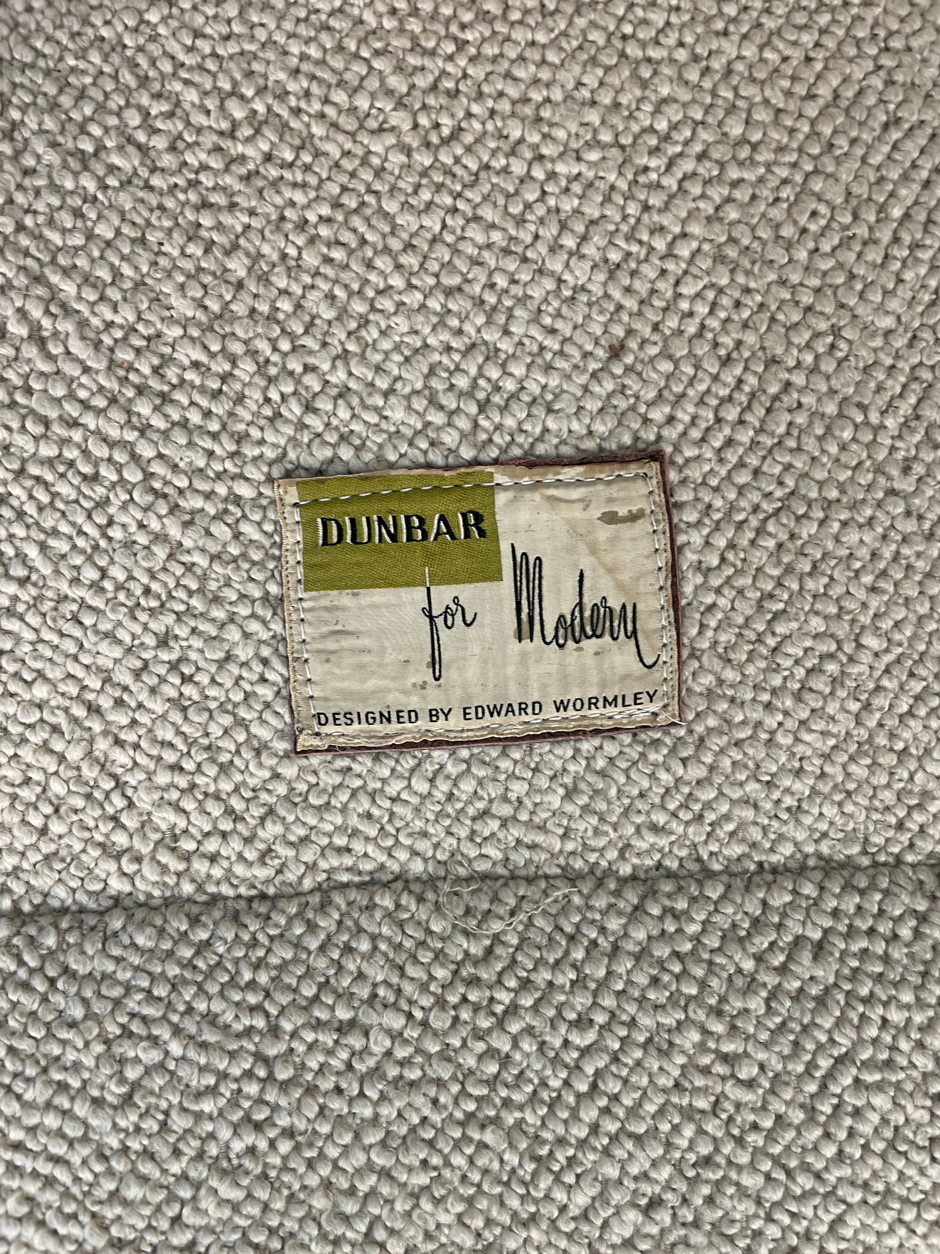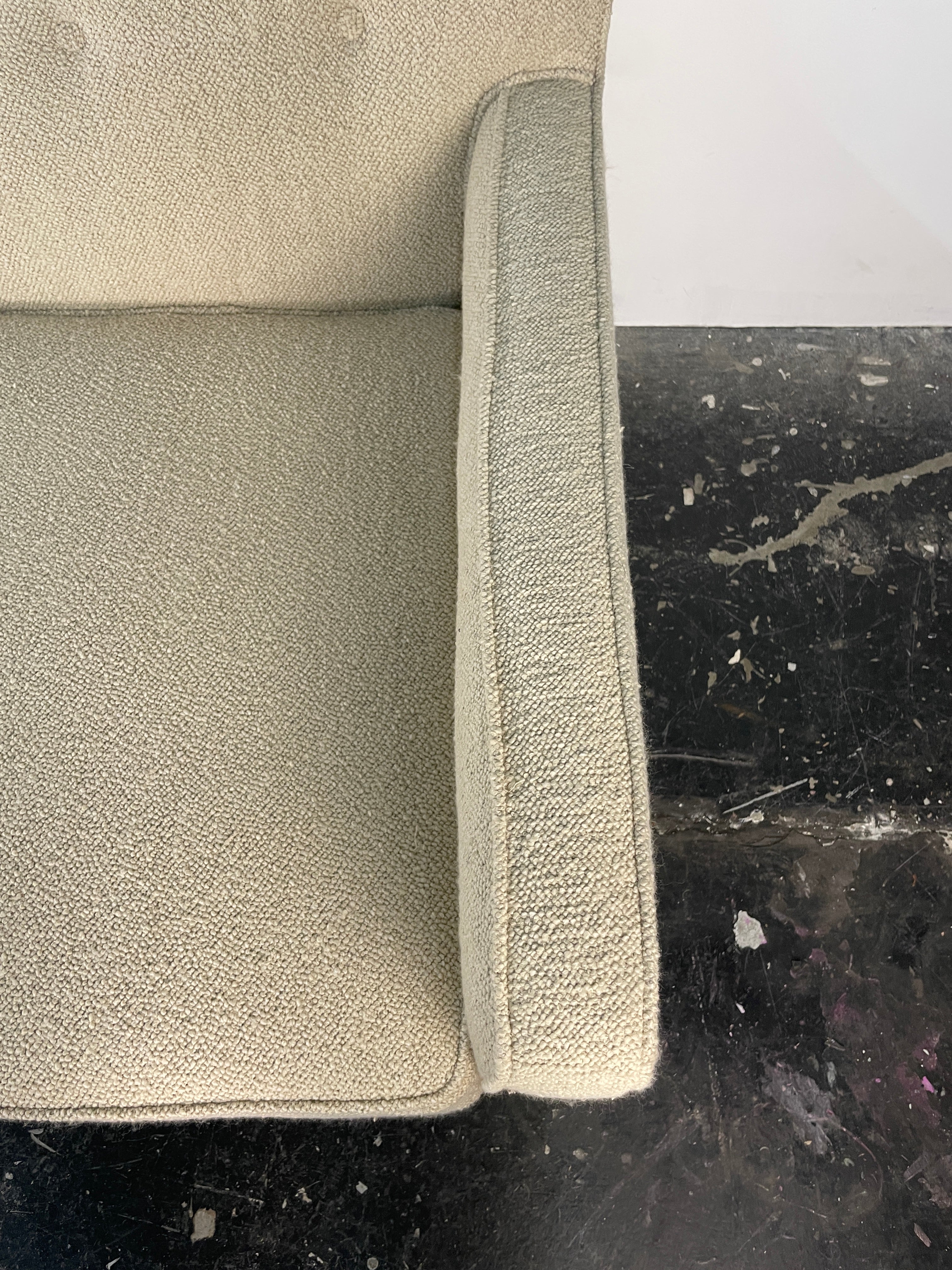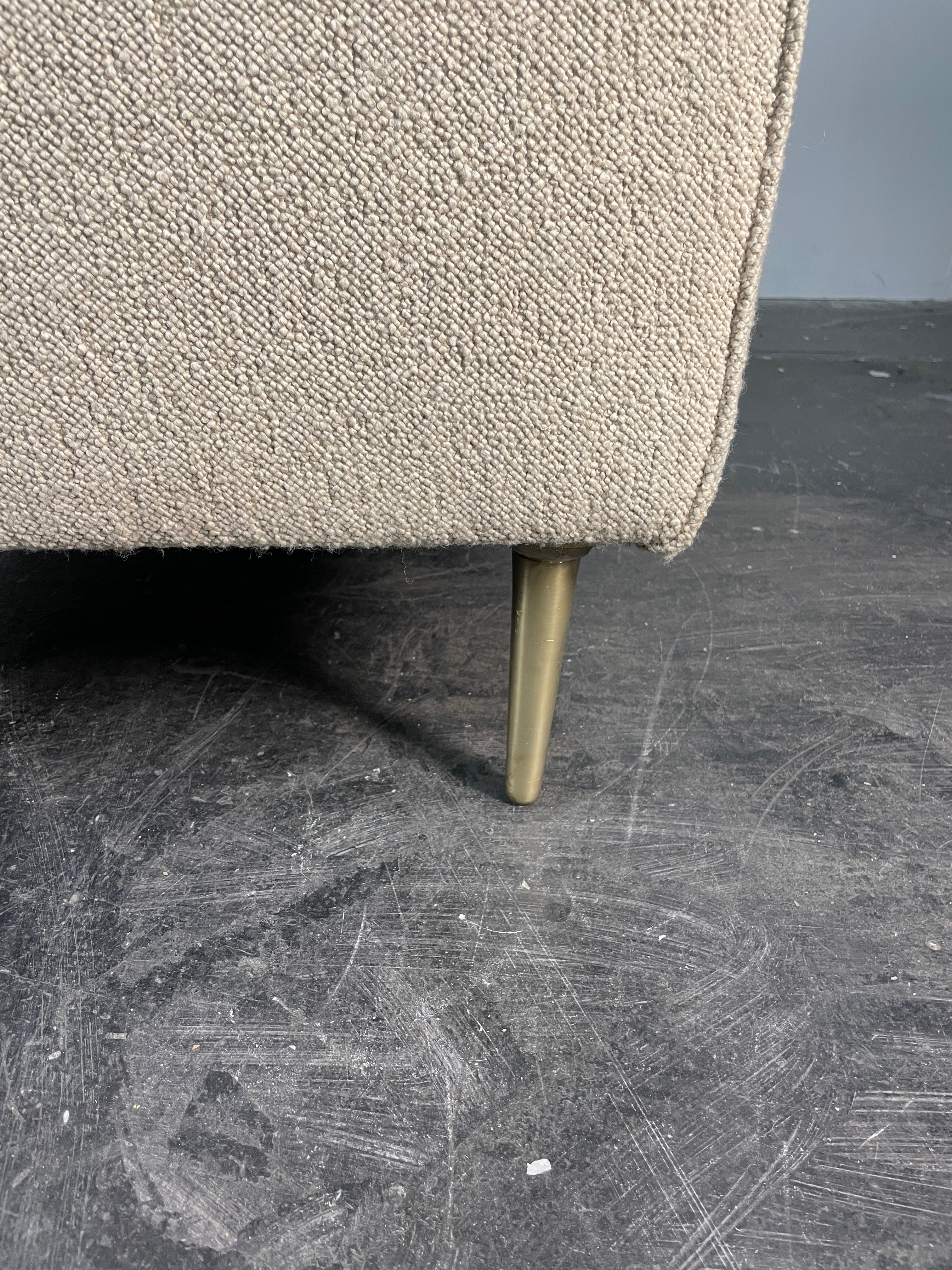 • Sophisticated 3 seater sofa designed by Edward Wormley with Brass legs for Dunbar. We have newly upholstered it in Maharam / Hearth / Amphitheater boucle made in Belgium. Beautiful structured clean lines and brass legs makes this sofa a classic and perfect for any home or design style. Dunbar Label attached.