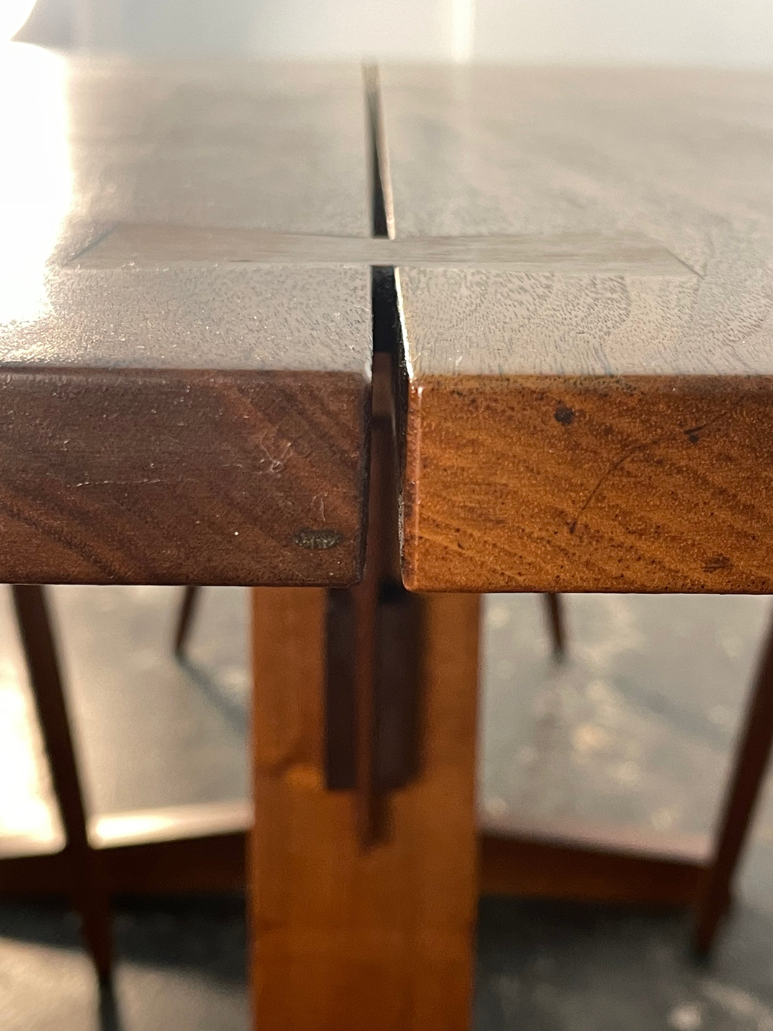 This piece has beautiful patina. We have cleaned it and oil it again with Nakashima recommended Tung oil. This piece shows original patina (ie chips and dents and scratches) but is in very good condition. Unless you would like the table refinished, we can do that too. Nakashima believed furniture should not be overly precious and it should be used. Kevinization, is what he called the natural patina that comes with daily use. We have tried to preserve.Β George Nakashima was largely influenced by the Japanese belief of wabi-sabi, Nakashima revered in seeking beauty in imperfection β€” and had an uncanny ability and an almost psychic connection to the wood.Β