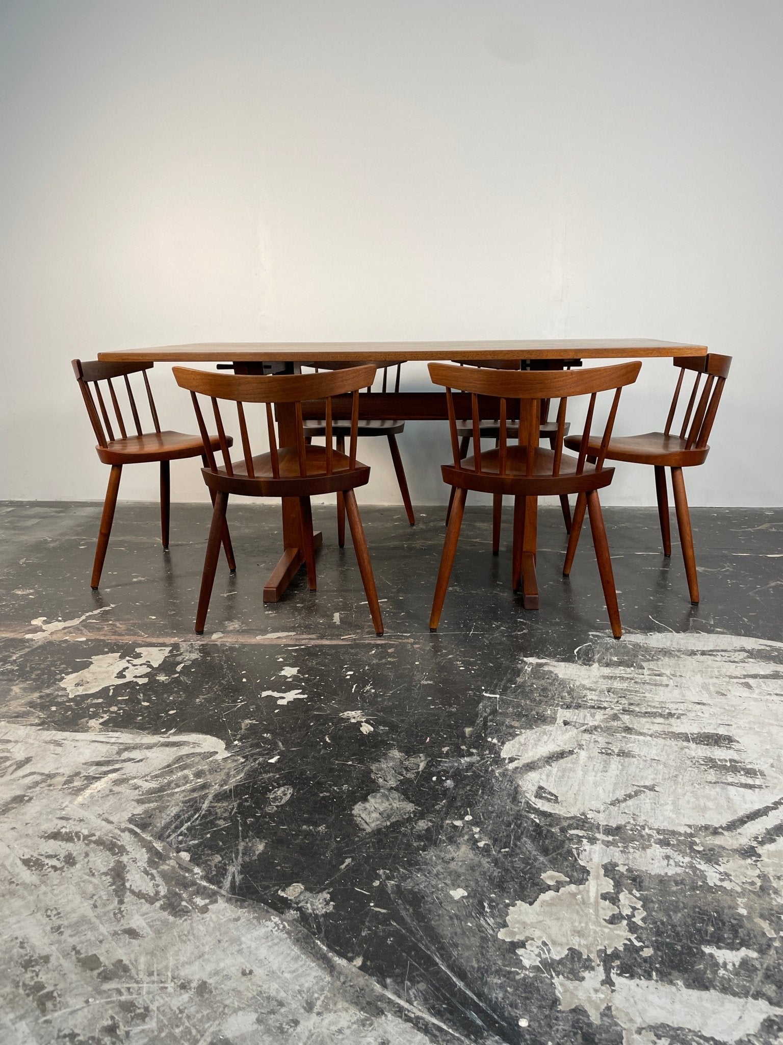 • One of the earliest designs of George Nakashima, this piece was inspired by the simple lifestyle of early American Shakers. The knock-down design allows for an easily removable table-top. The table stop is secured to the legs with wedge and pin system. Each pin looks perfectly round but in each was chiseled by hand.Β