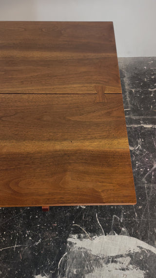 This table was ordered in the 1945-1950's. This table was owned from new by one family who had it custom made to fit their kitchen nook. Made of solid walnut with three walnut butterfly joints that stabilize the slabs of walnut as well as create small gap in the wood top.Β