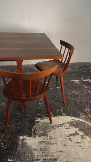 One of the earliest designs of George Nakashima, this piece was inspired by the simple lifestyle of early American Shakers. The knock-down design allows for an easily removable table-top. The table stop is secured to the legs with wedge and pin system. Each pin looks perfectly round but in each was chiseled by hand.Β