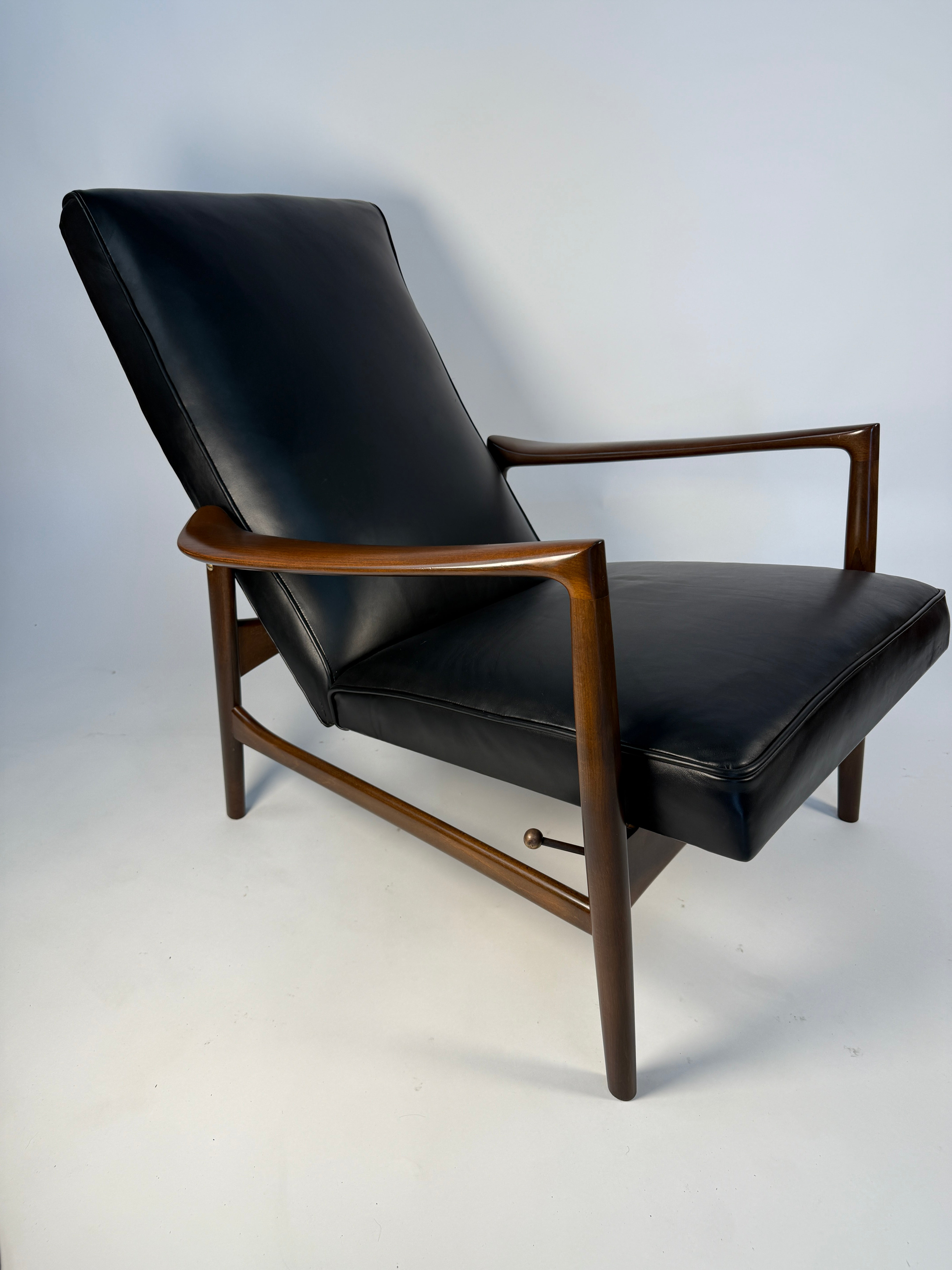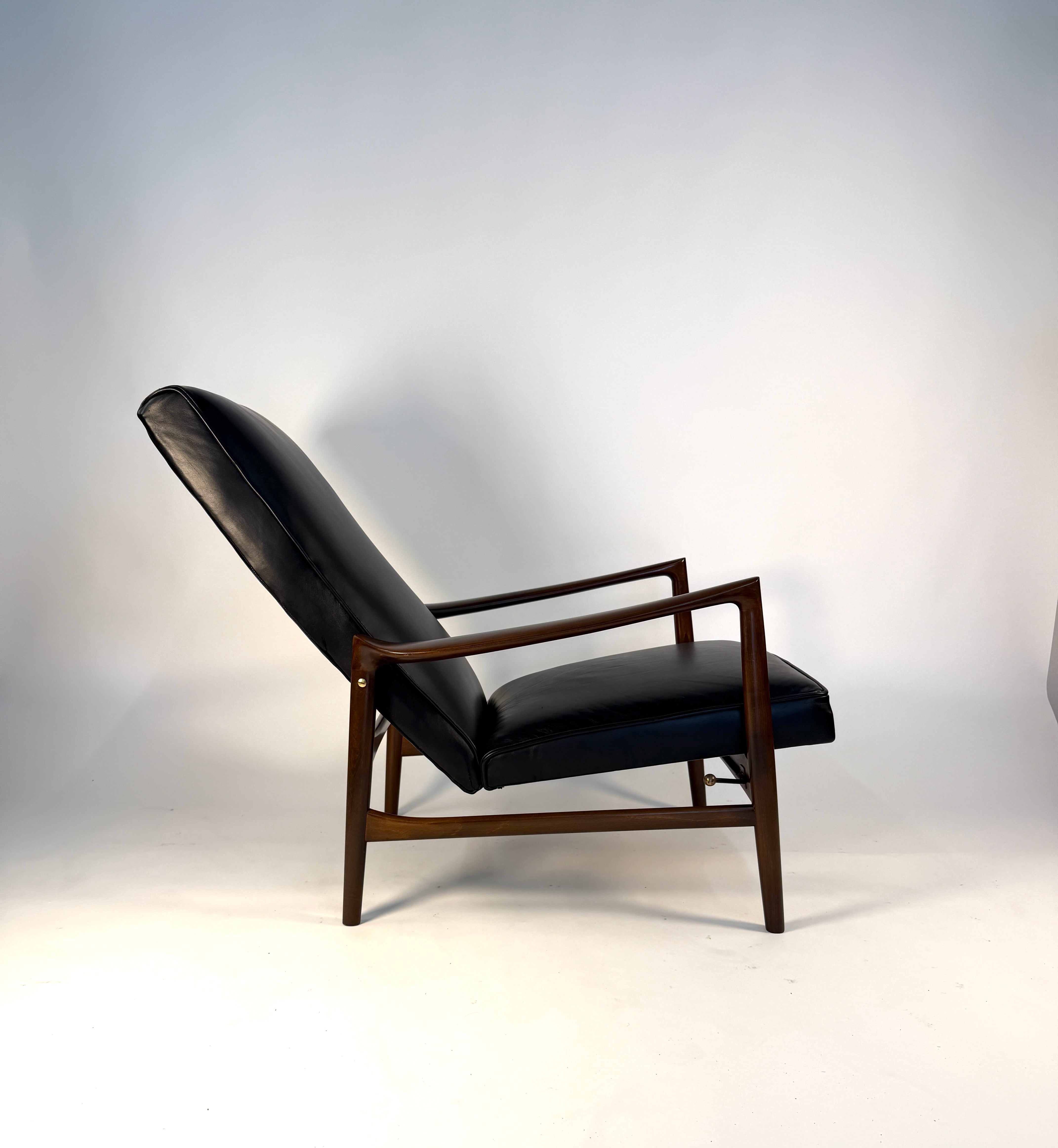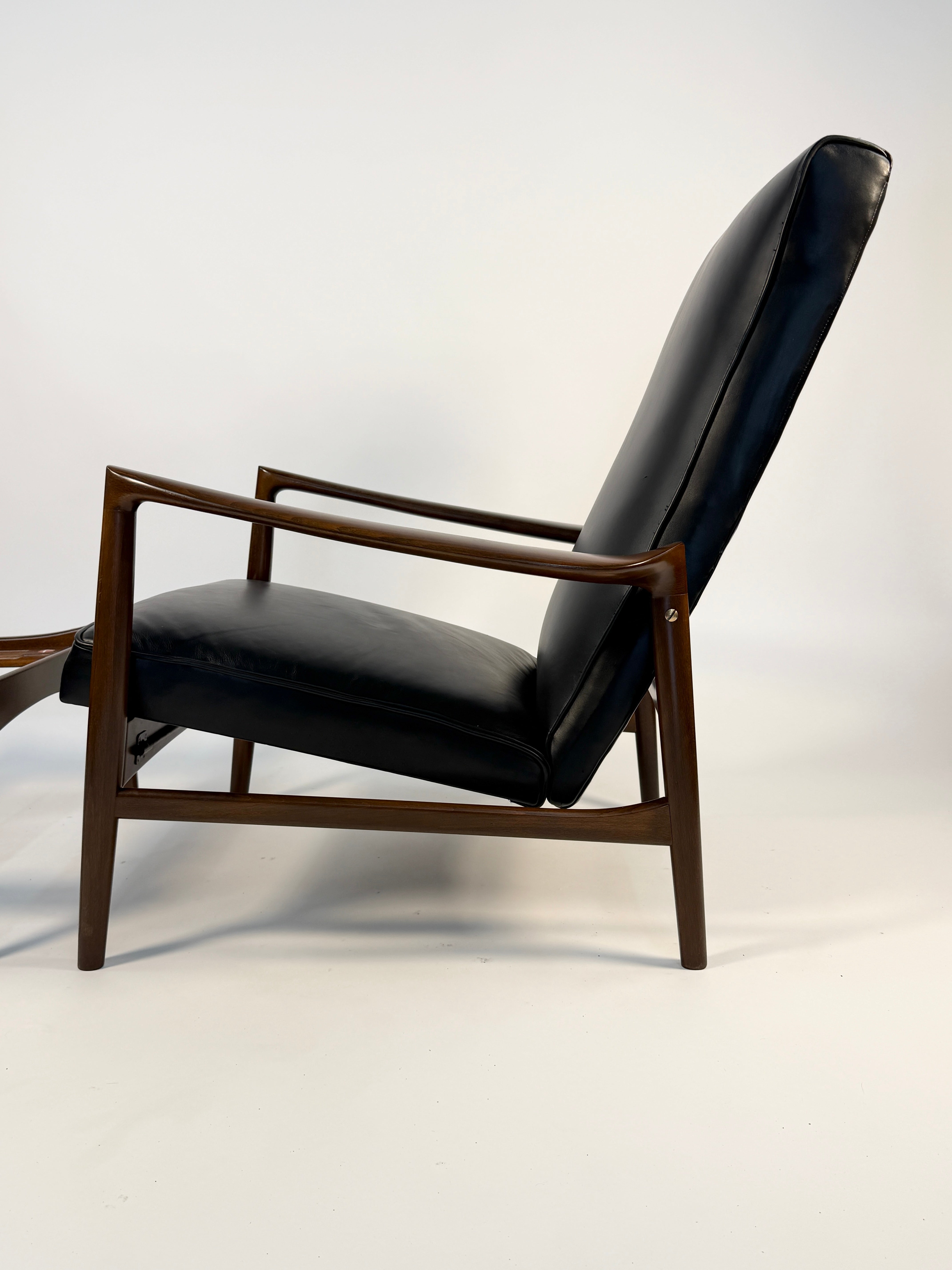 Ib Kofod-Larsen Recliner and Ottoman for Selig in fresh Black Italian leather. This recliner has such an elegant form: sculpted arms that flare gently outward, a high, winged back that cradles the head and shoulders, and legs that taper with the precision of a master cabinetmaker. An anomaly for the time, designed for a taller person.