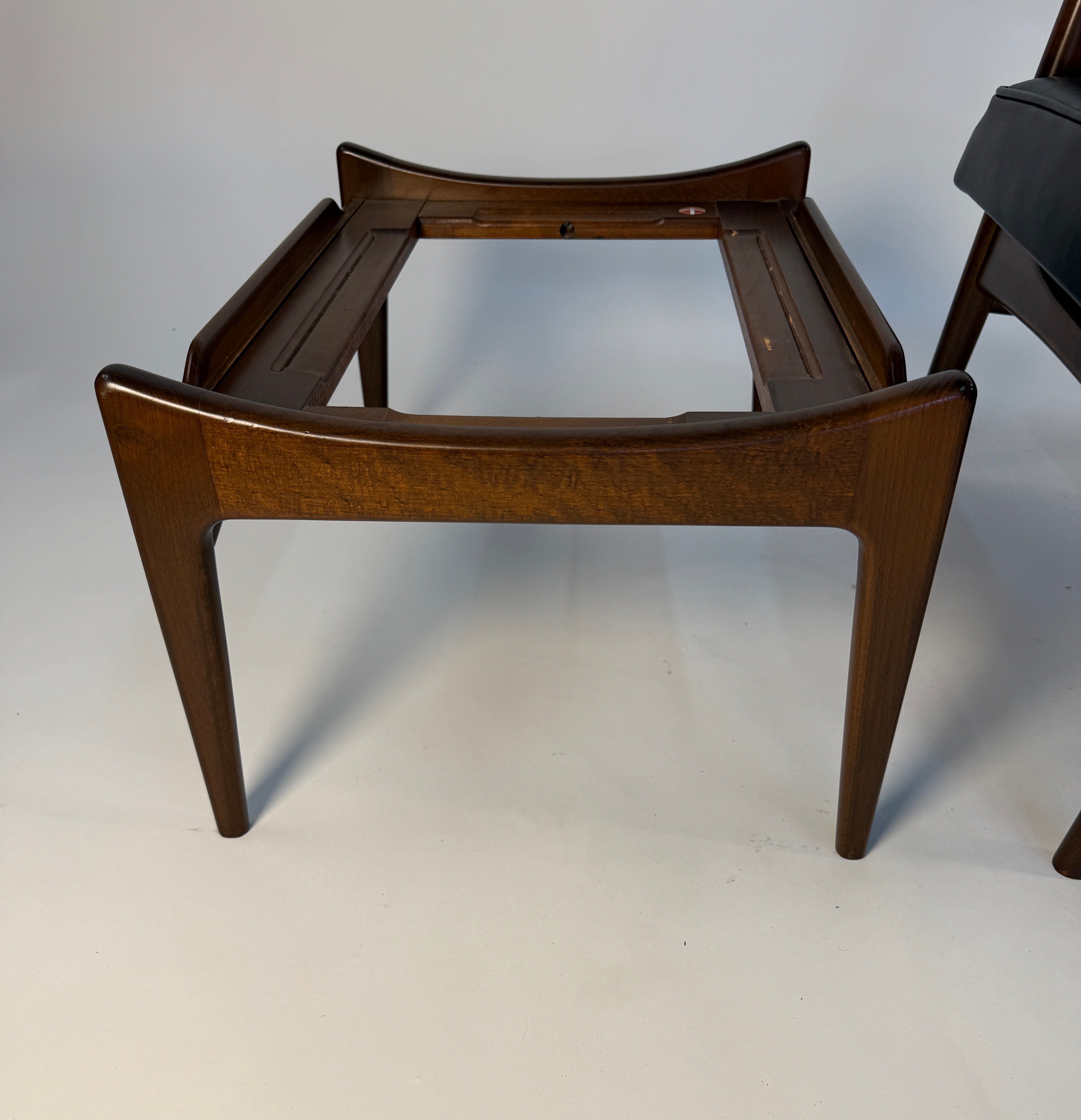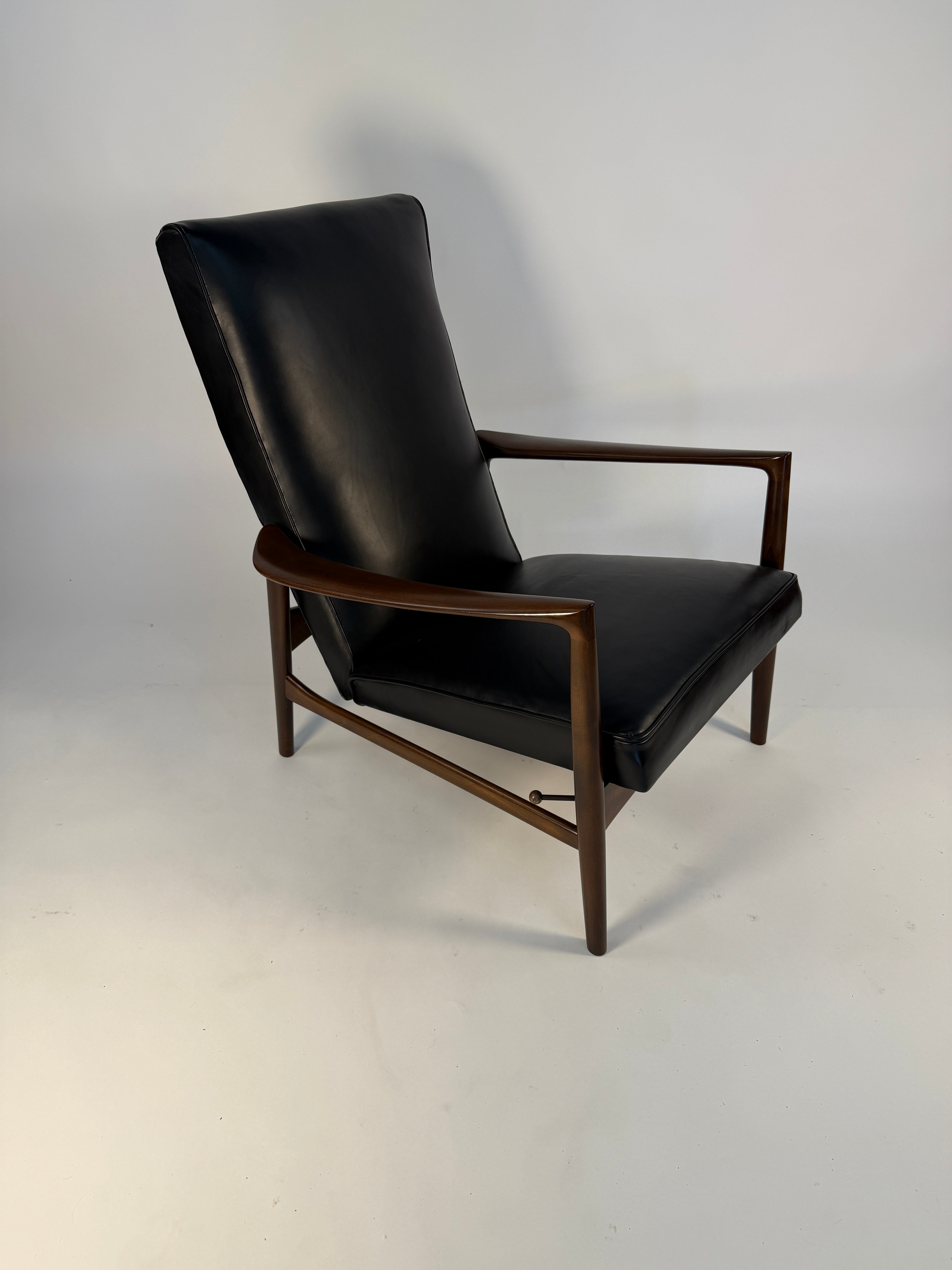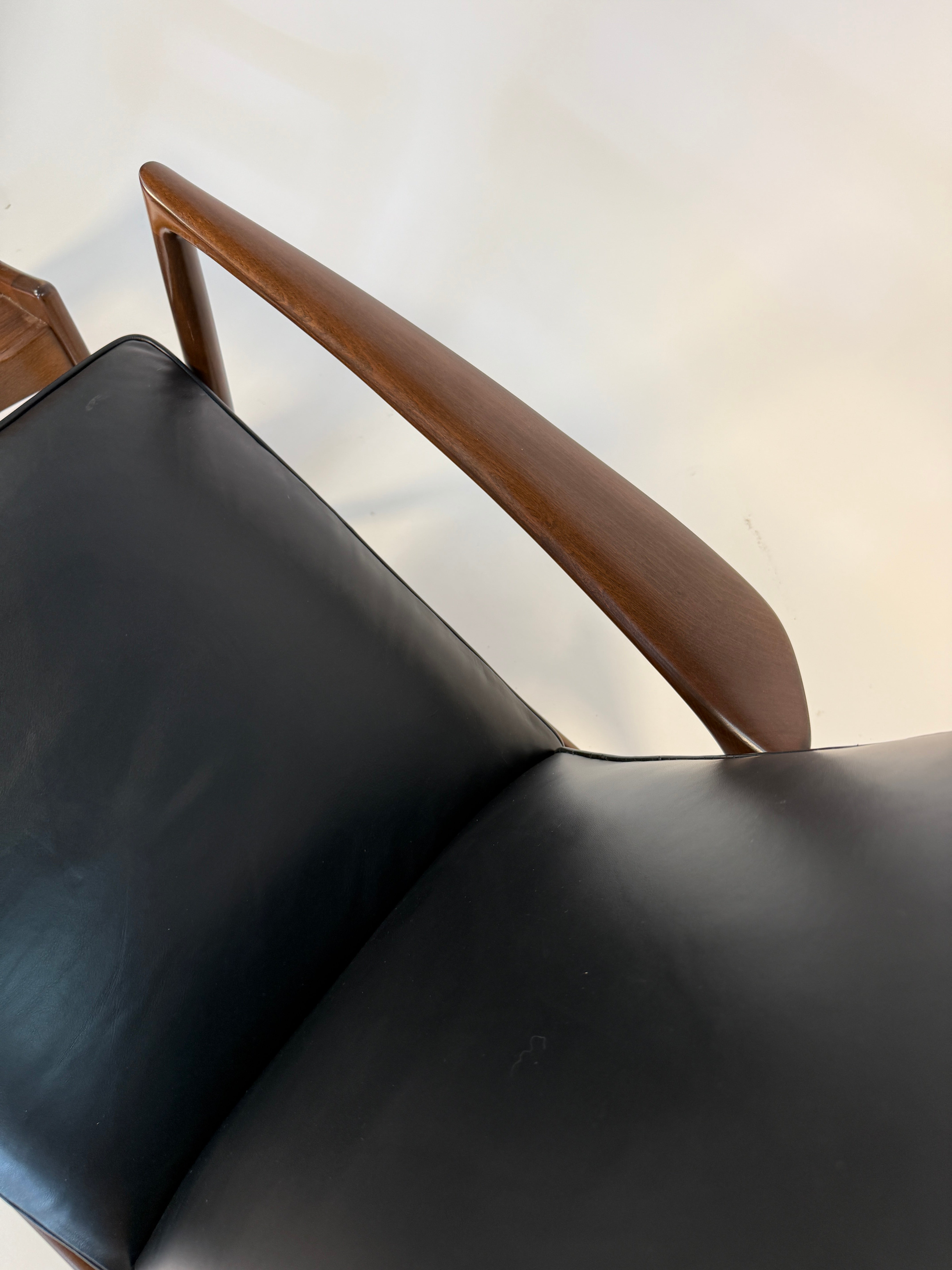 Ib Kofod-Larsen Recliner and Ottoman for Selig in fresh Black Italian leather. This recliner has such an elegant form: sculpted arms that flare gently outward, a high, winged back that cradles the head and shoulders, and legs that taper with the precision of a master cabinetmaker. An anomaly for the time, designed for a taller person.