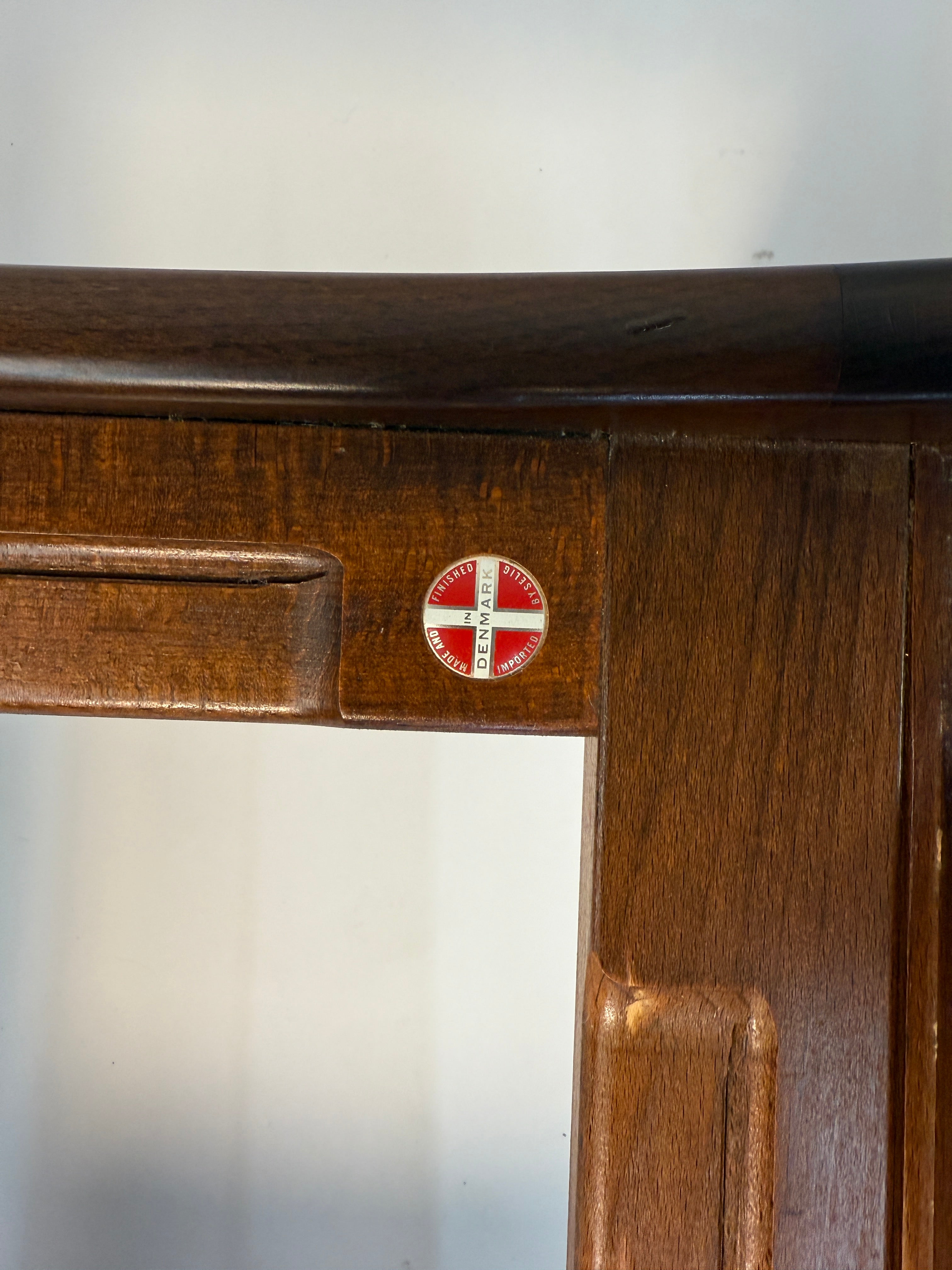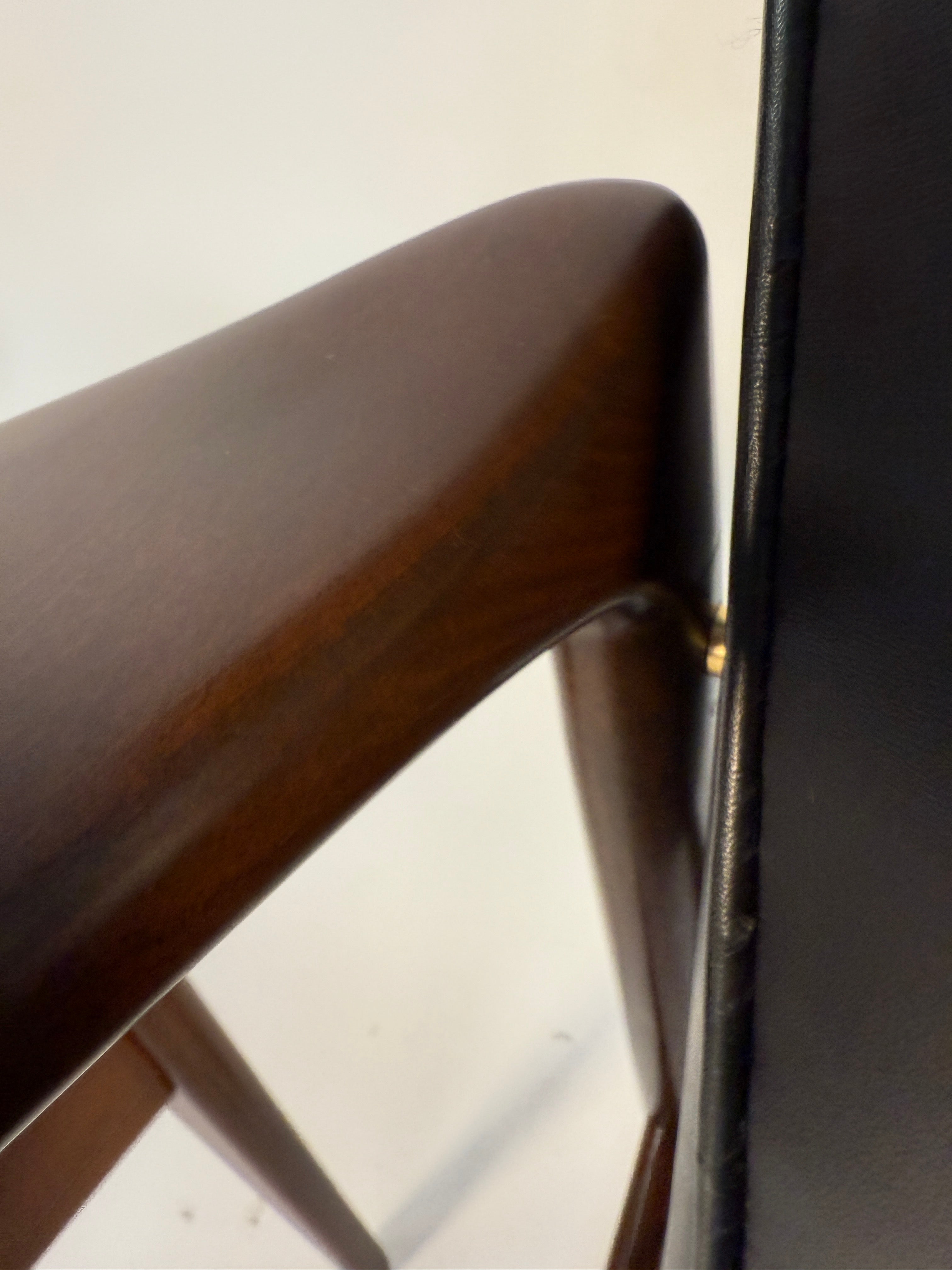 Made of beech stained walnut. The wood has been newly restored and is in excellent condition. The wood has a beautiful deep brown color that complements the black leather so well.